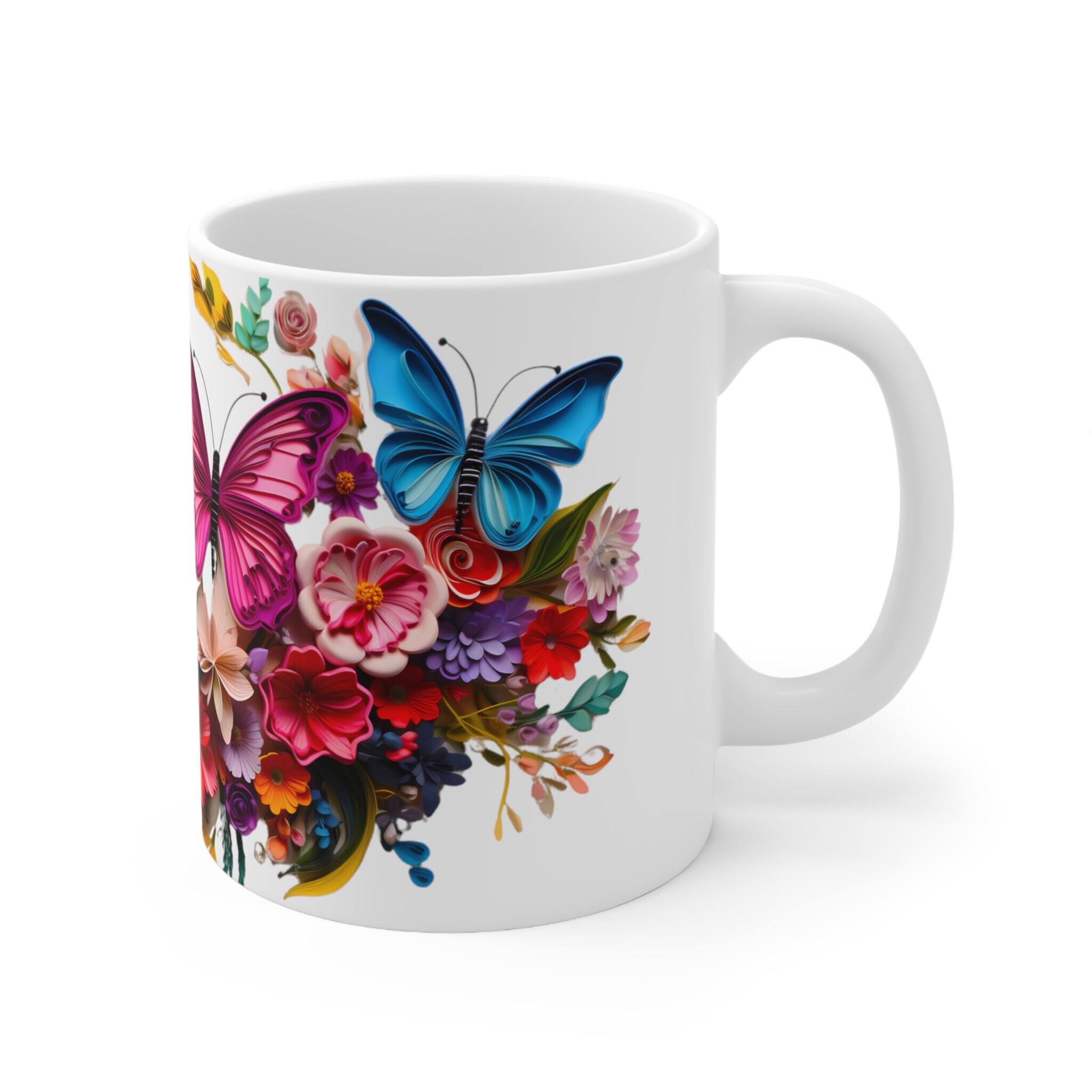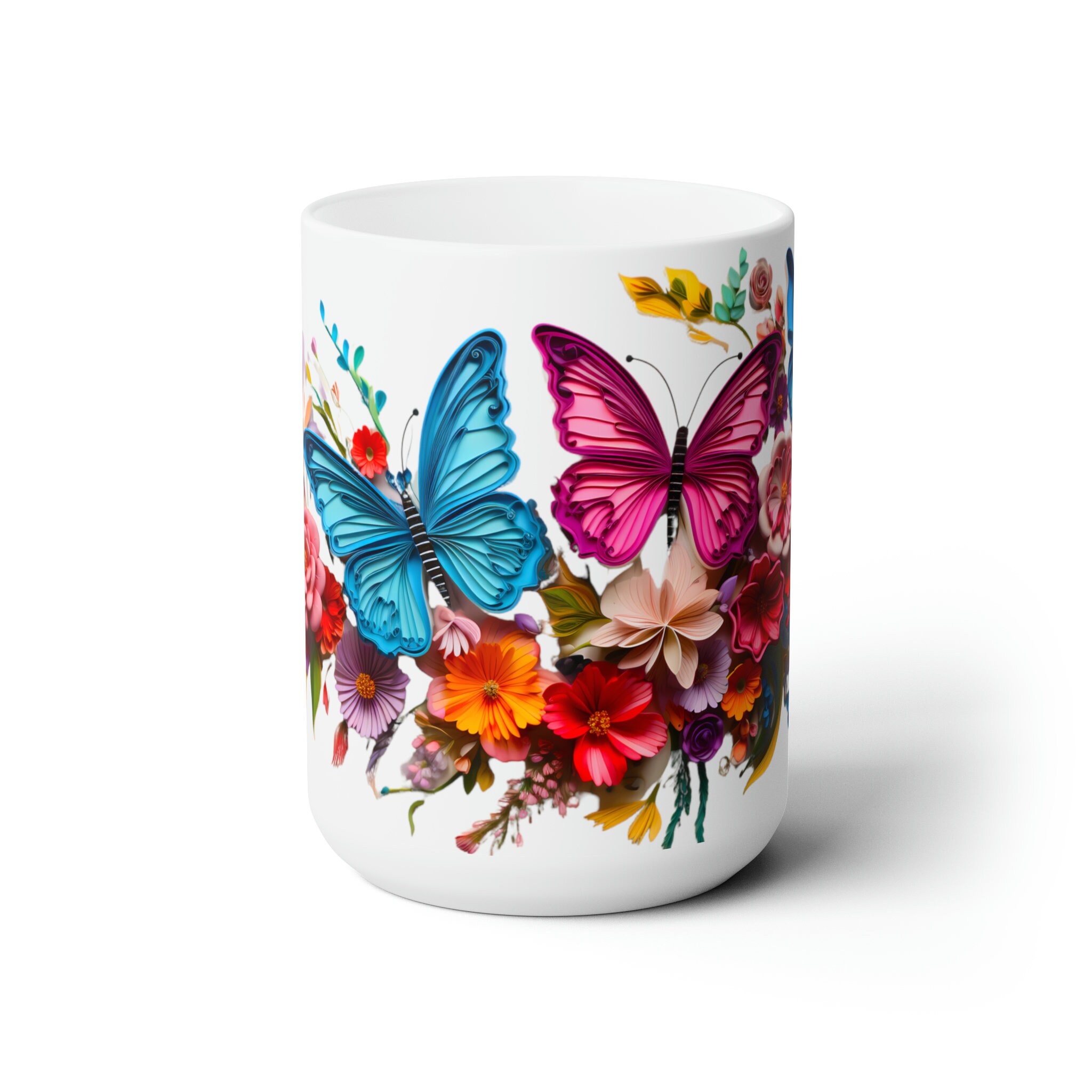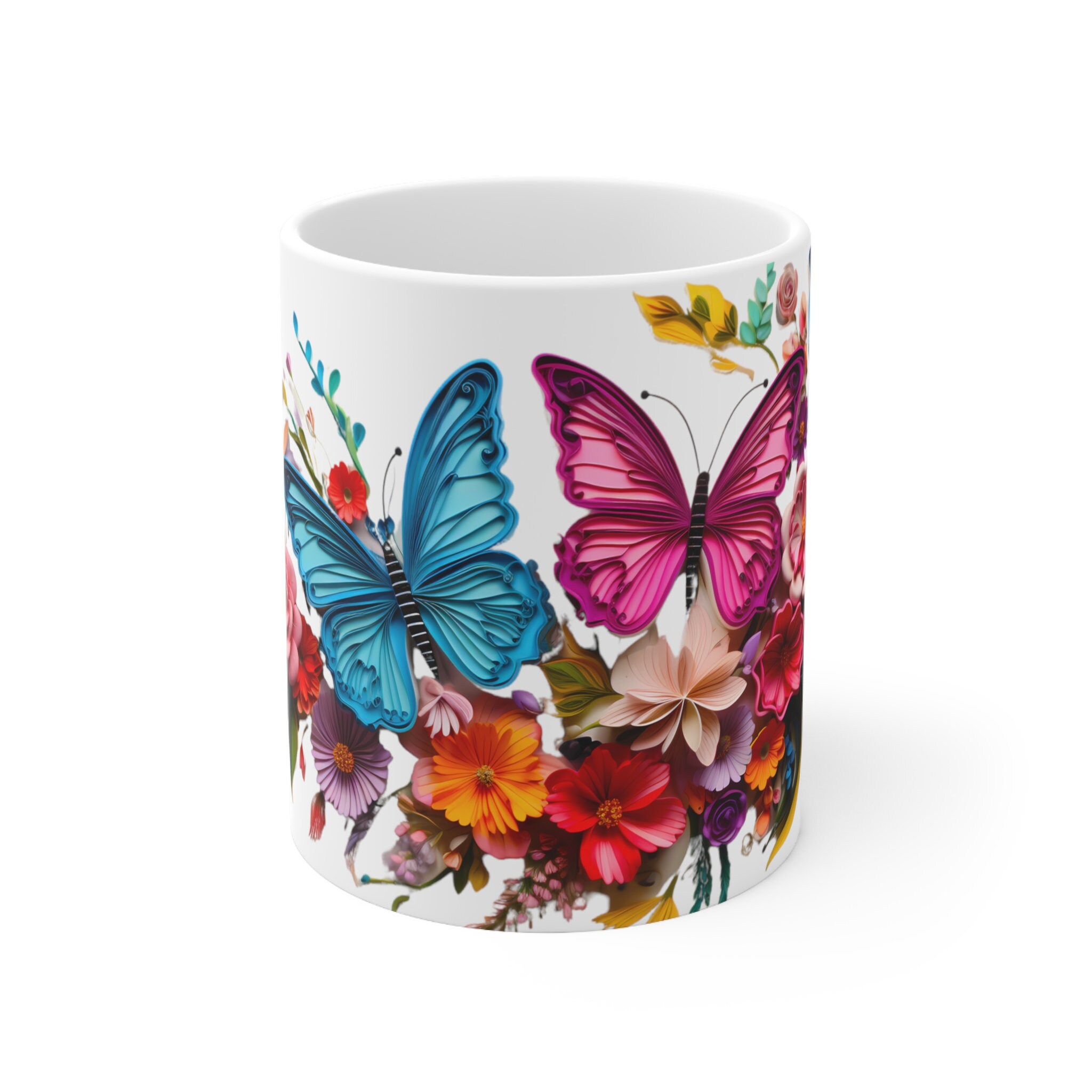 Sip serenity from our Colorful Butterflies Floral Mug, an 11-ounce or 15-ounce ceramic sanctuary where delicate wings and vibrant blossoms dance upon a pristine white canvasβa piece of art that transcends the ordinary, inviting you to infuse your every moment with enchantment.