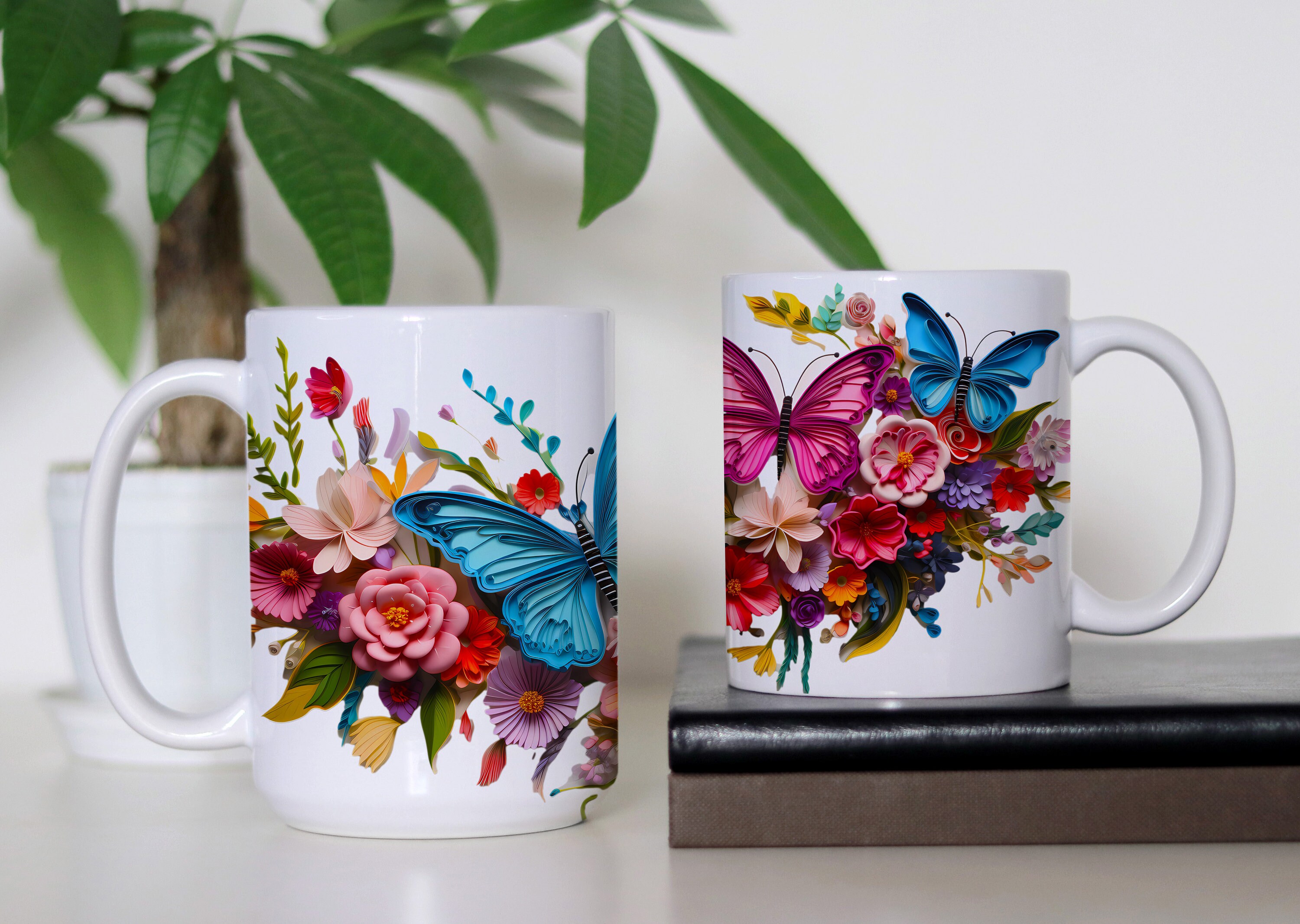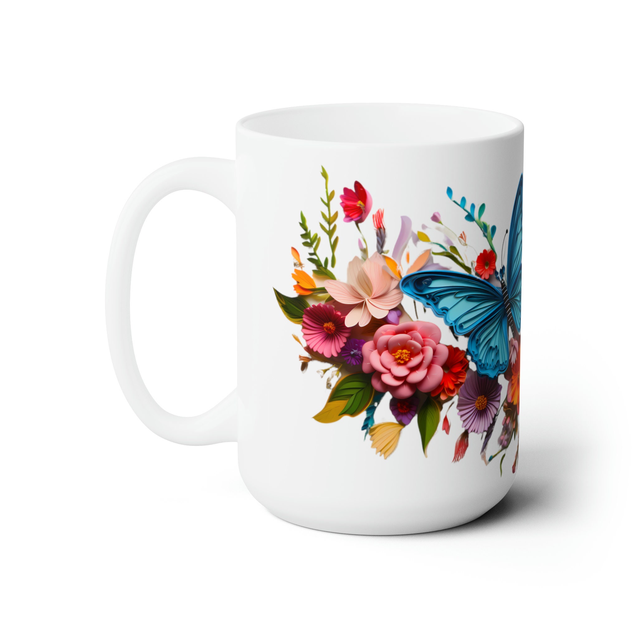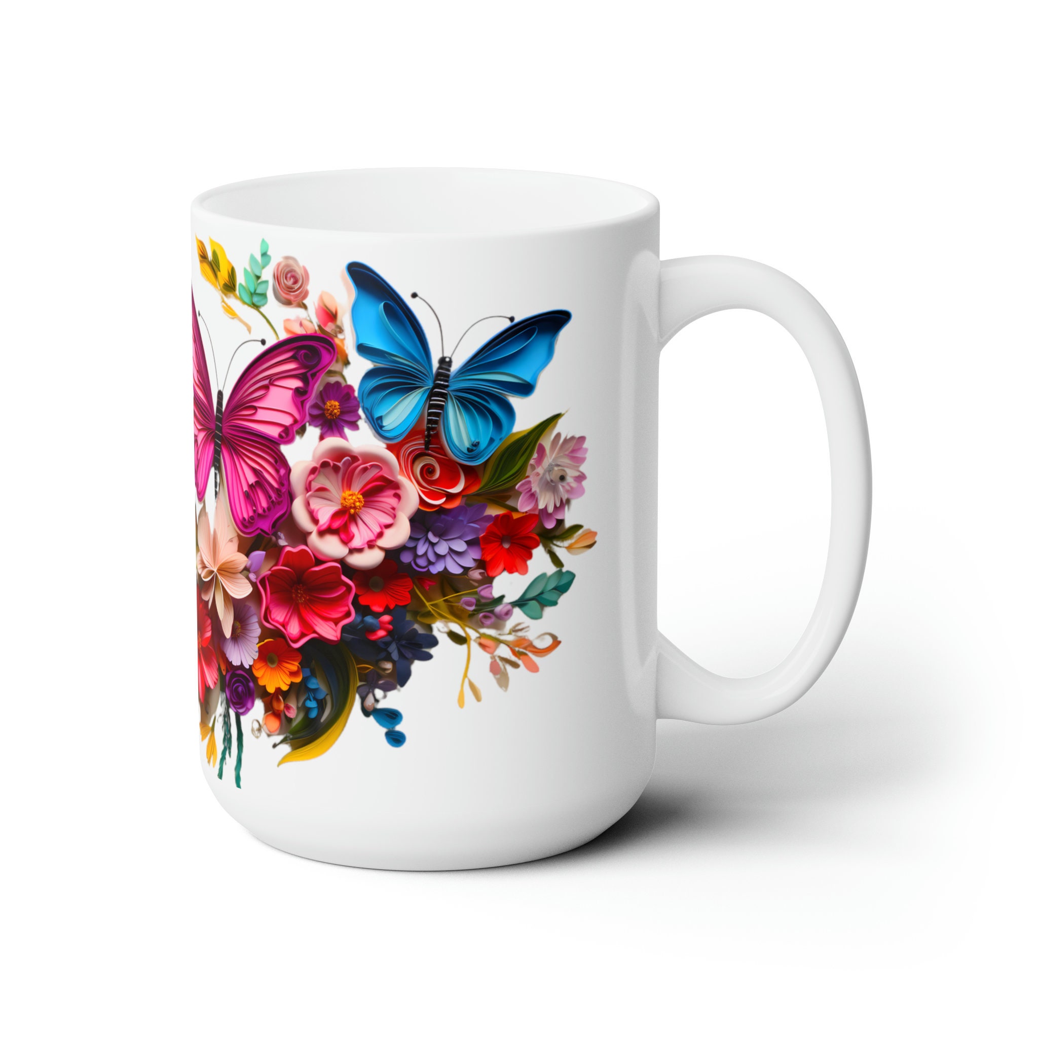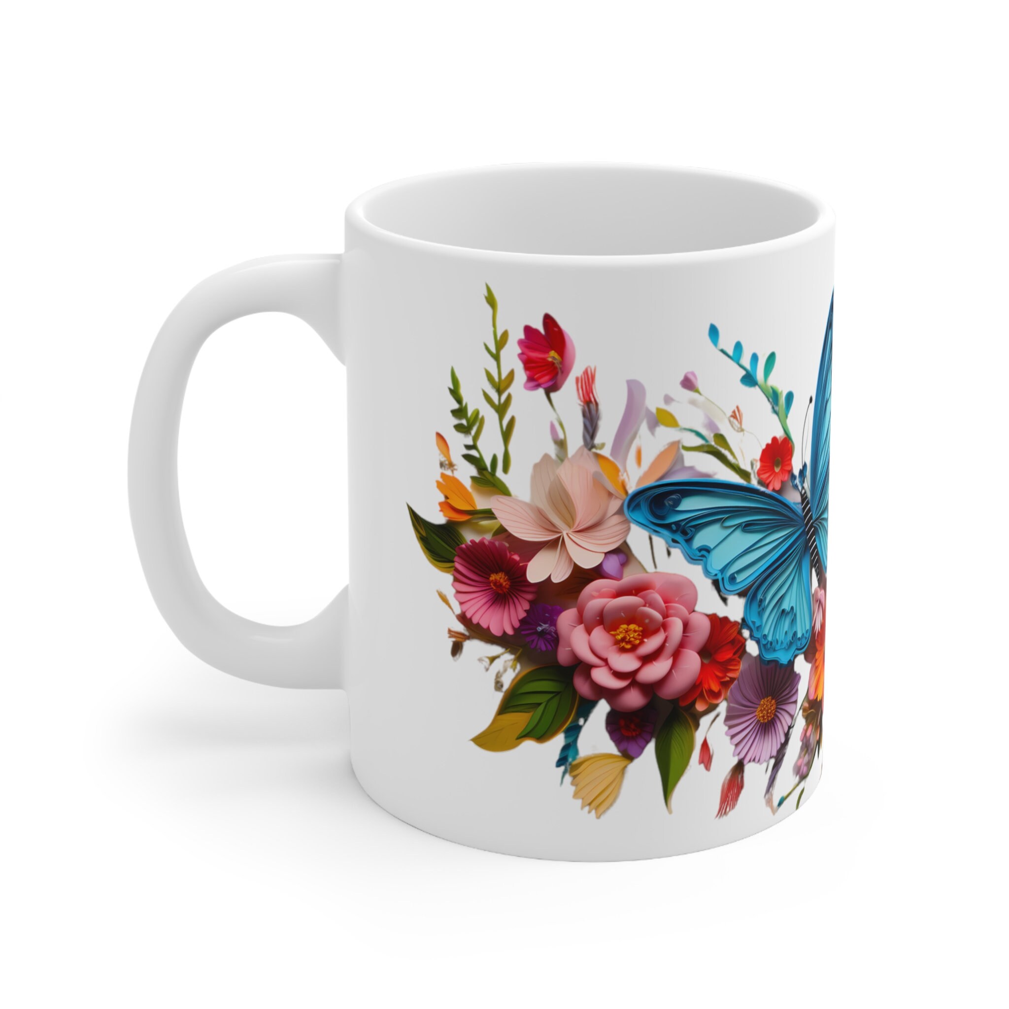 Sip serenity from our Colorful Butterflies Floral Mug, an 11-ounce or 15-ounce ceramic sanctuary where delicate wings and vibrant blossoms dance upon a pristine white canvasβa piece of art that transcends the ordinary, inviting you to infuse your every moment with enchantment.
