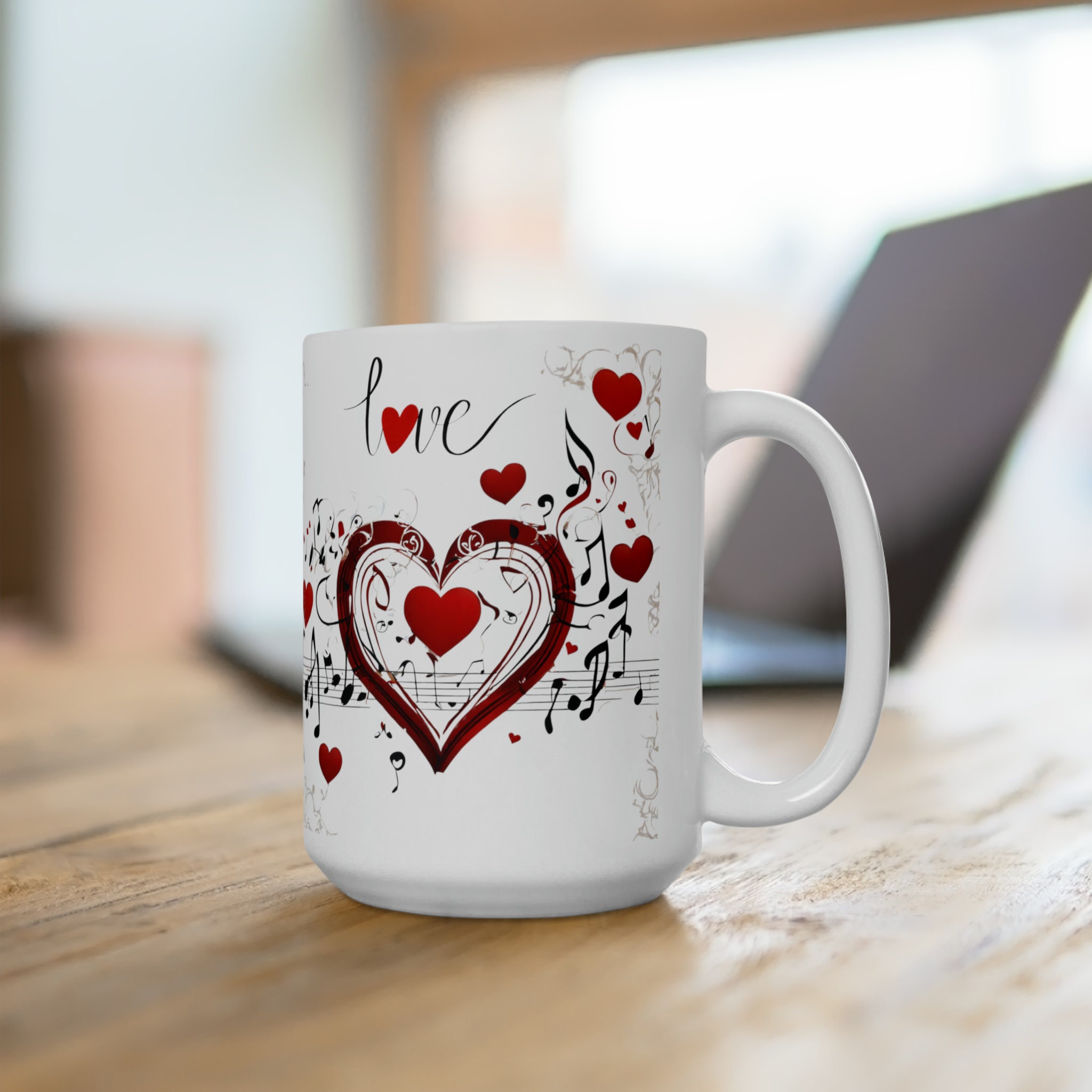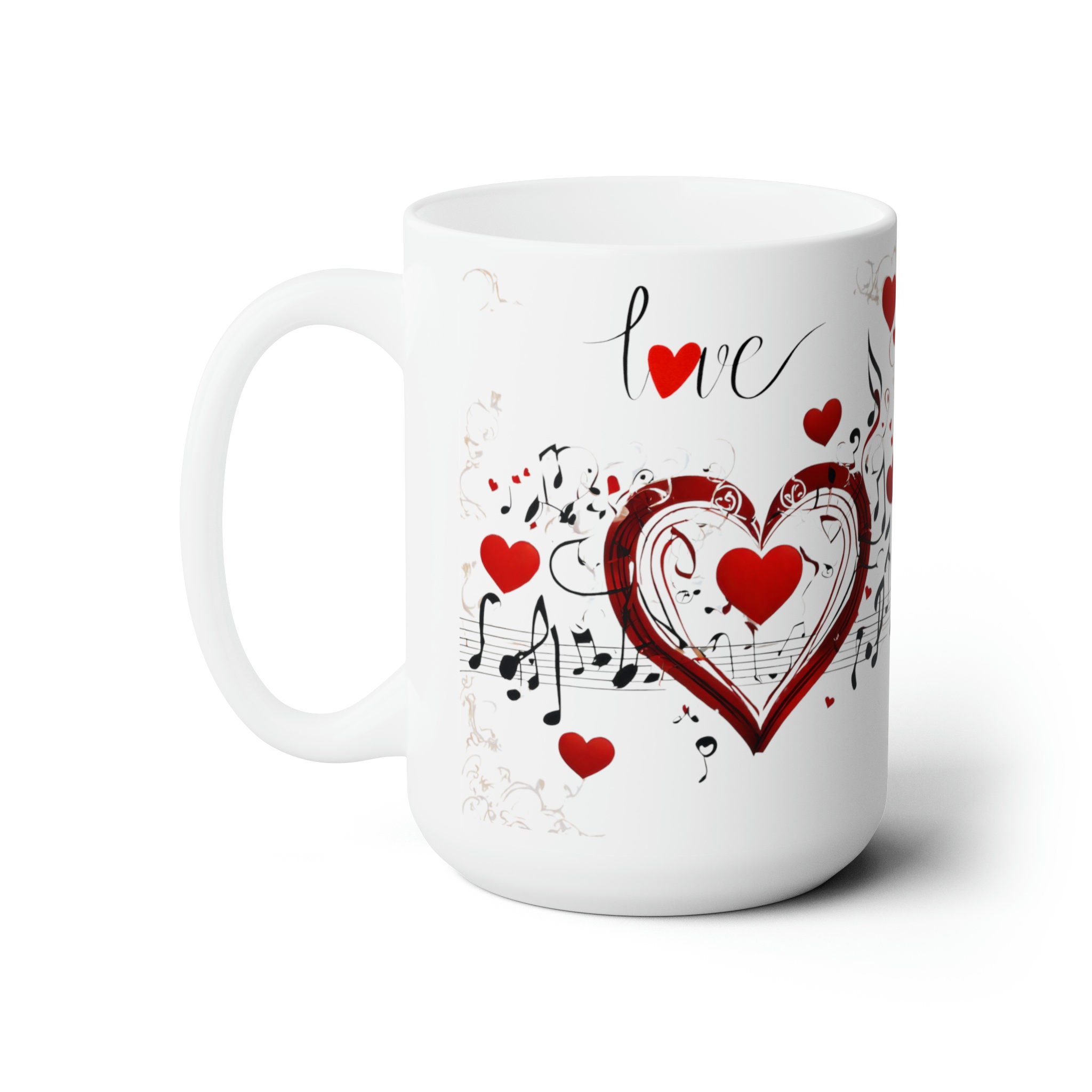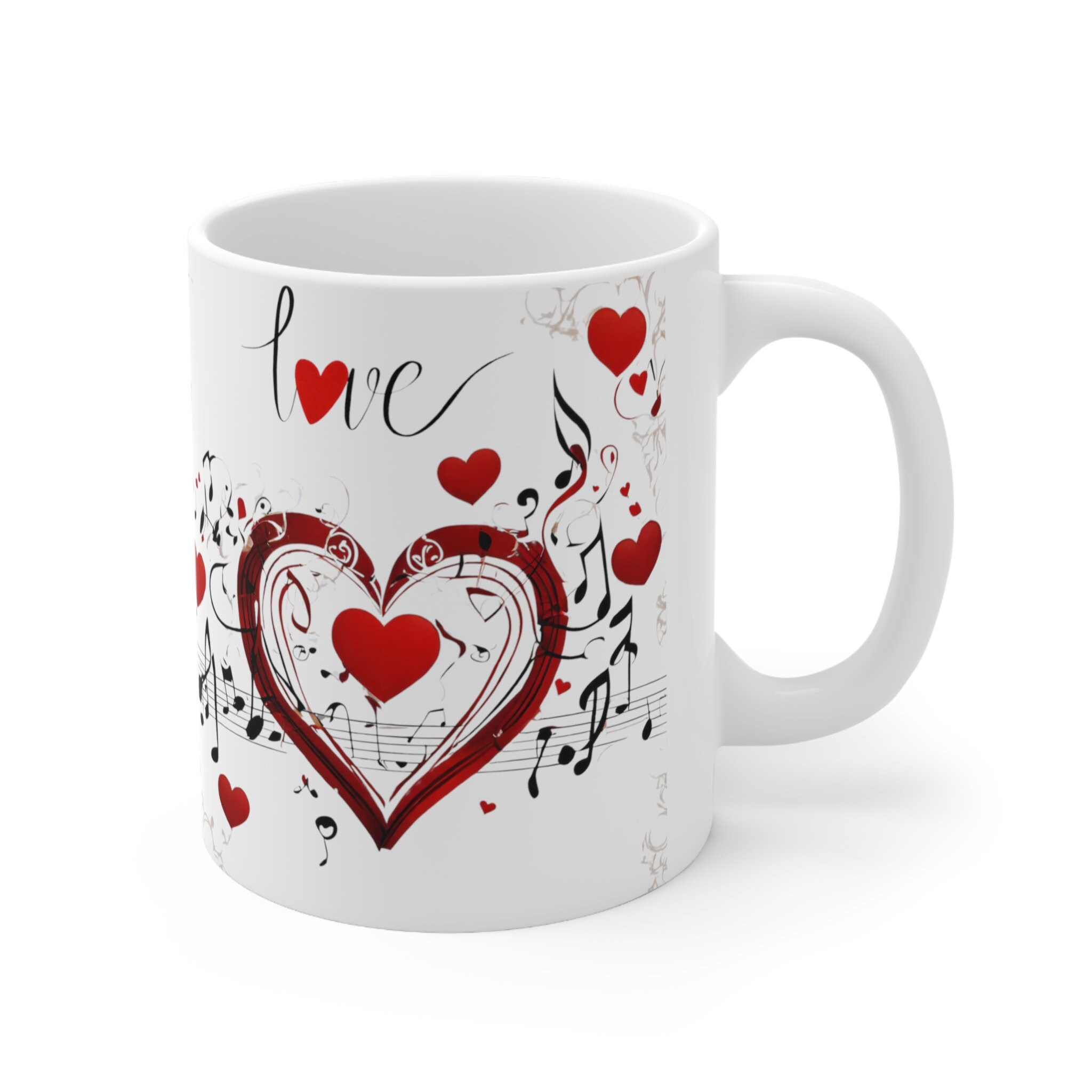 Harmony meets heart with our musical ceramic mug! Adorned with charming hearts and playful music notes, this 11-ounce or 15-ounce mug adds a touch of melody to your sips. Perfect for music lovers or a thoughtful gift, it's a symphony of style and warmth. Order now to sip in tune with your favorite beverage!