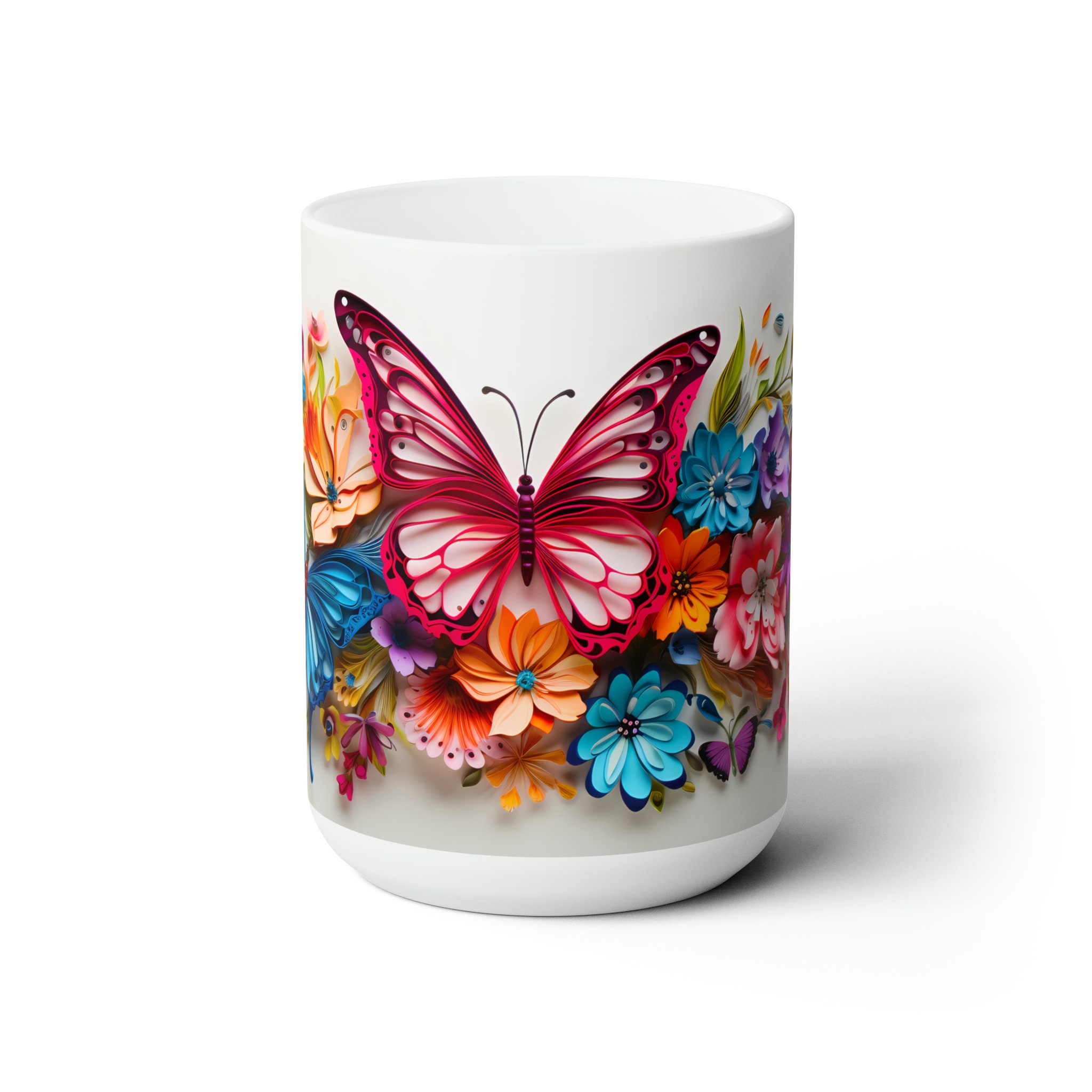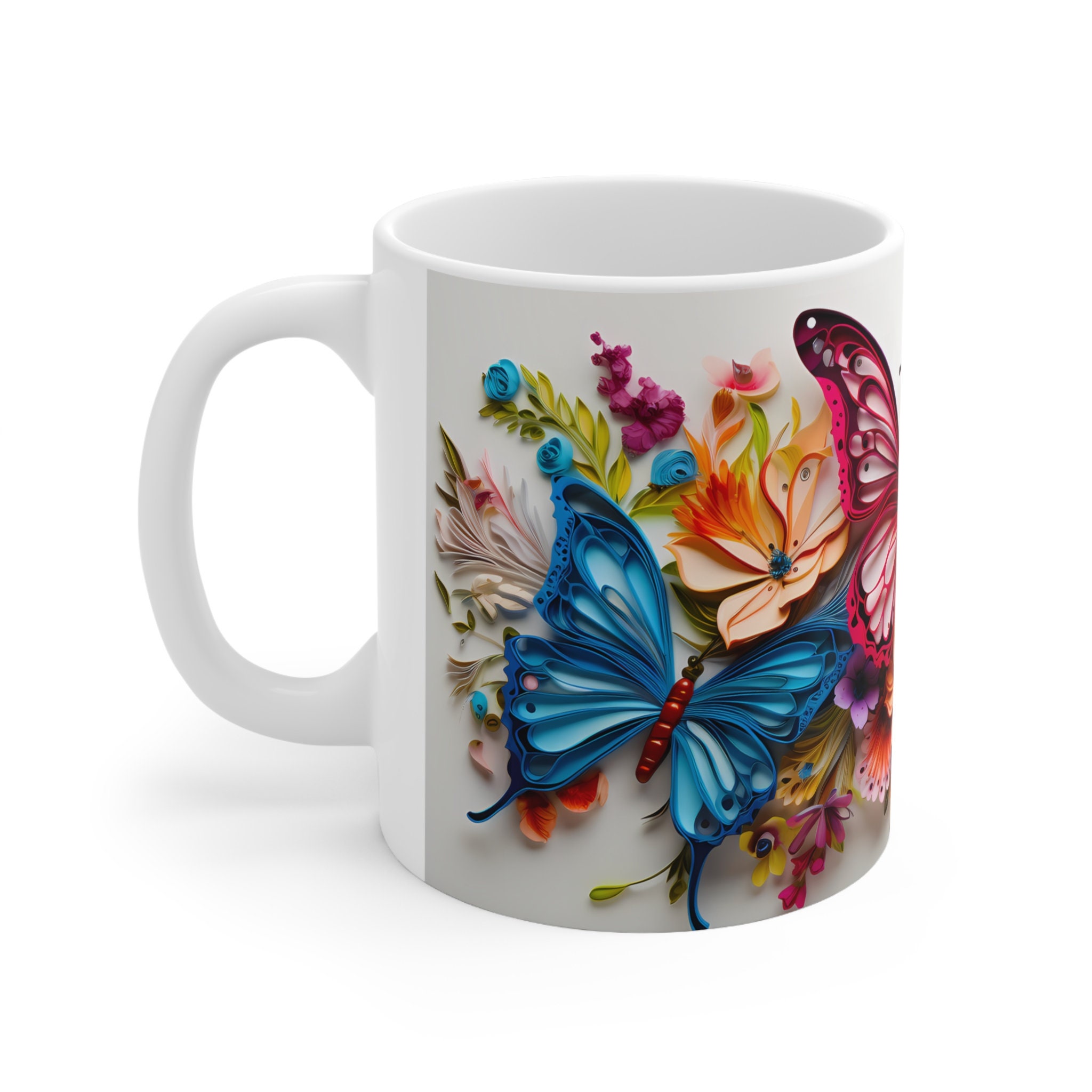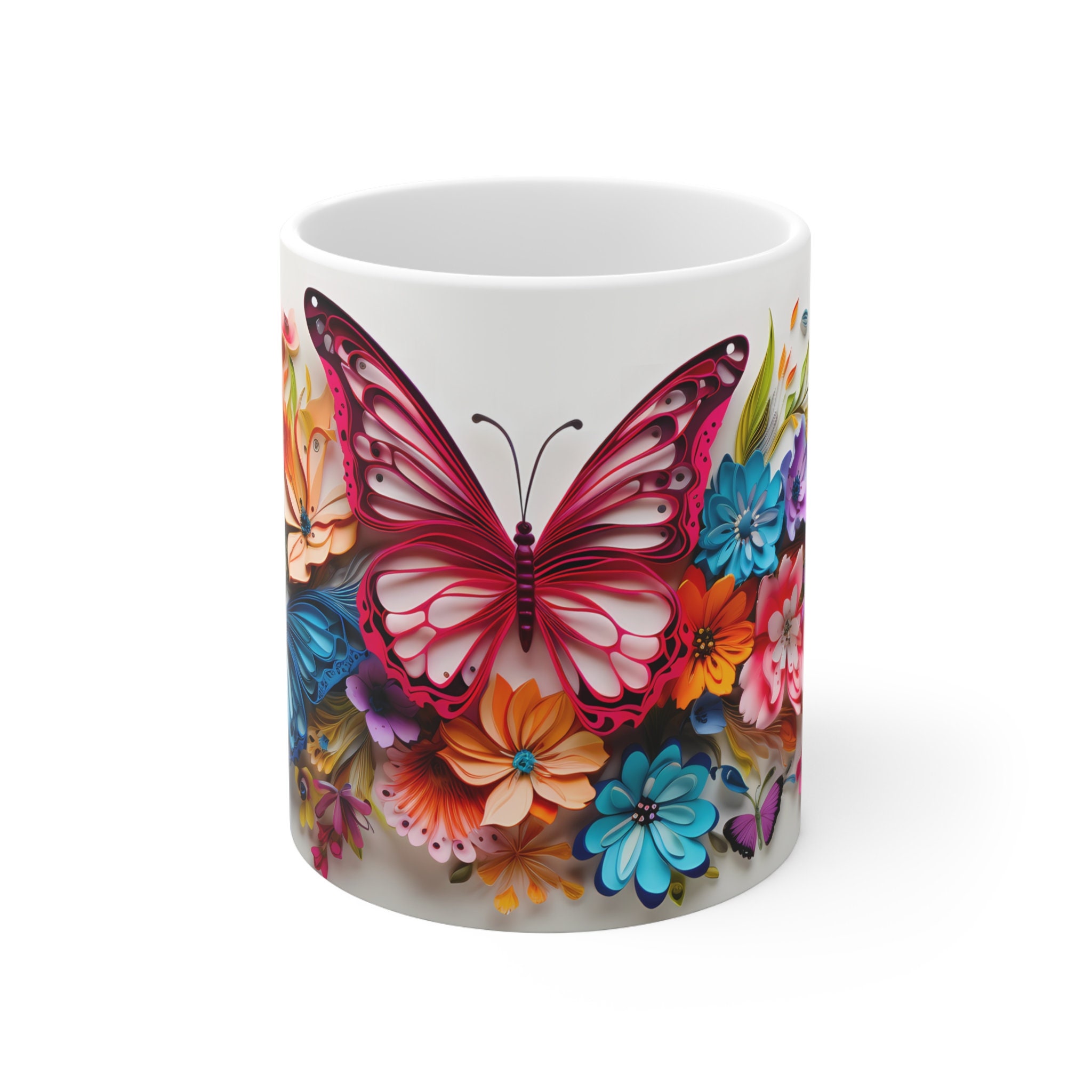 Embrace the ethereal allure of our Pink and Blue Colorful Butterflies On Flowers, a mesmerizing 11-ounce or 15-ounce ceramic masterpiece where graceful wings and blooming petals intertwine, transforming your sips into a captivating journey through nature's elegance.