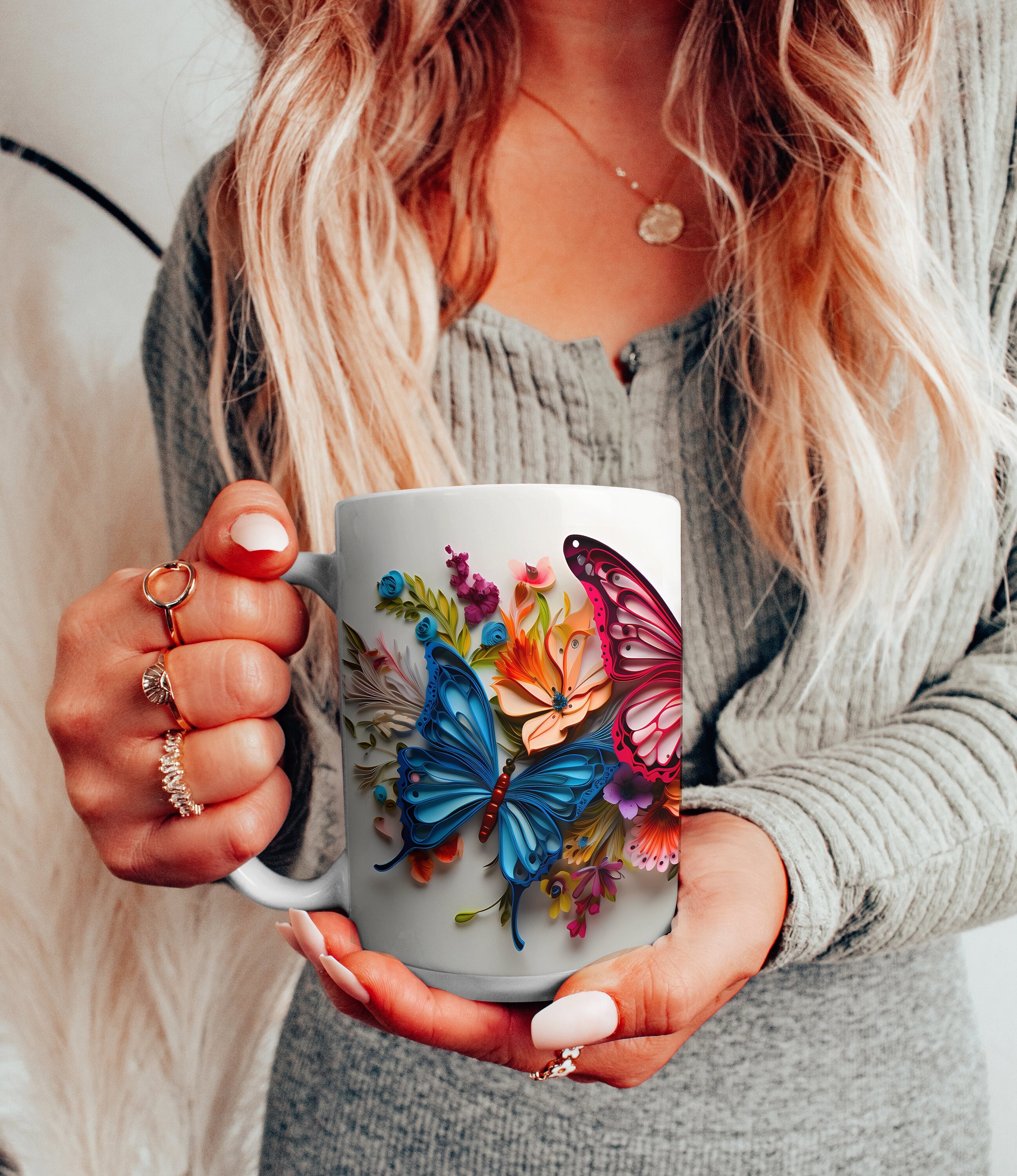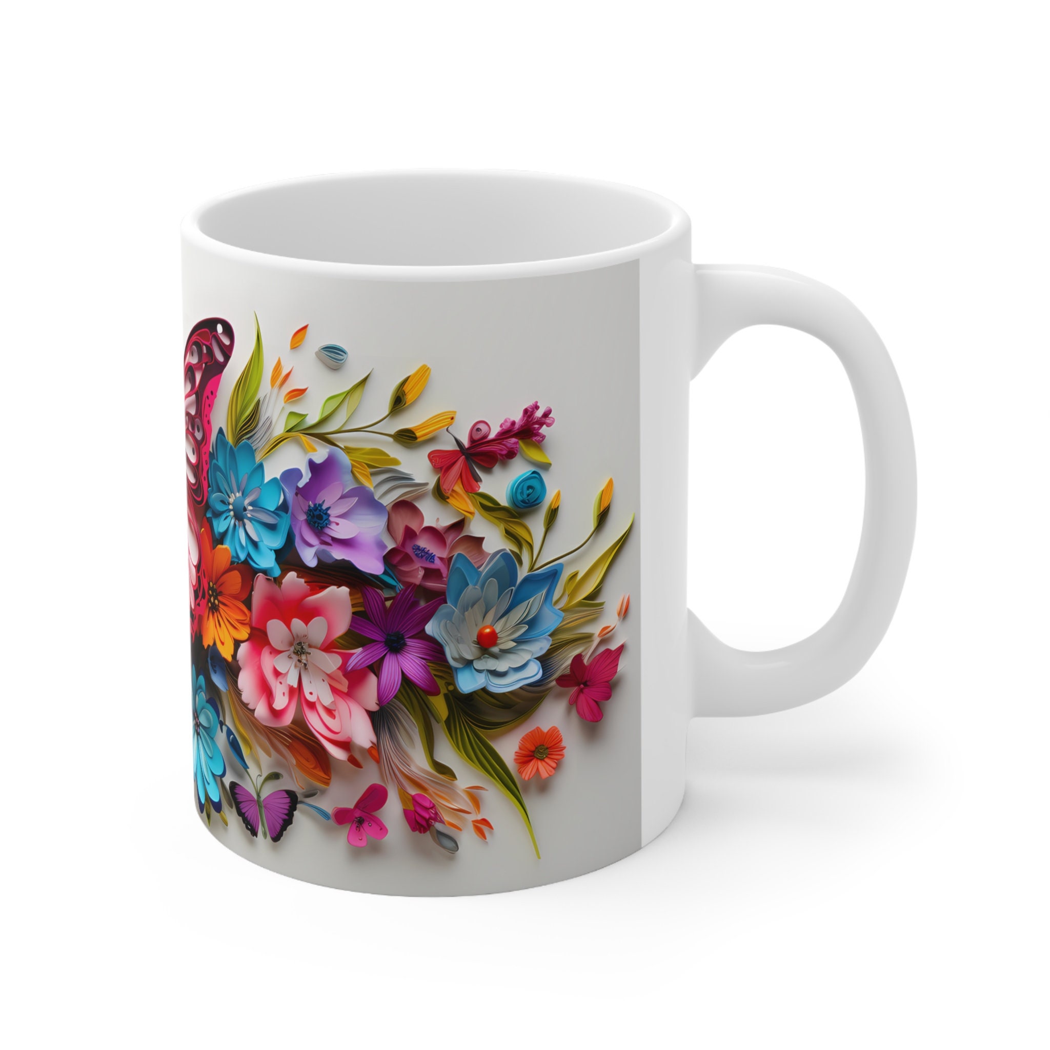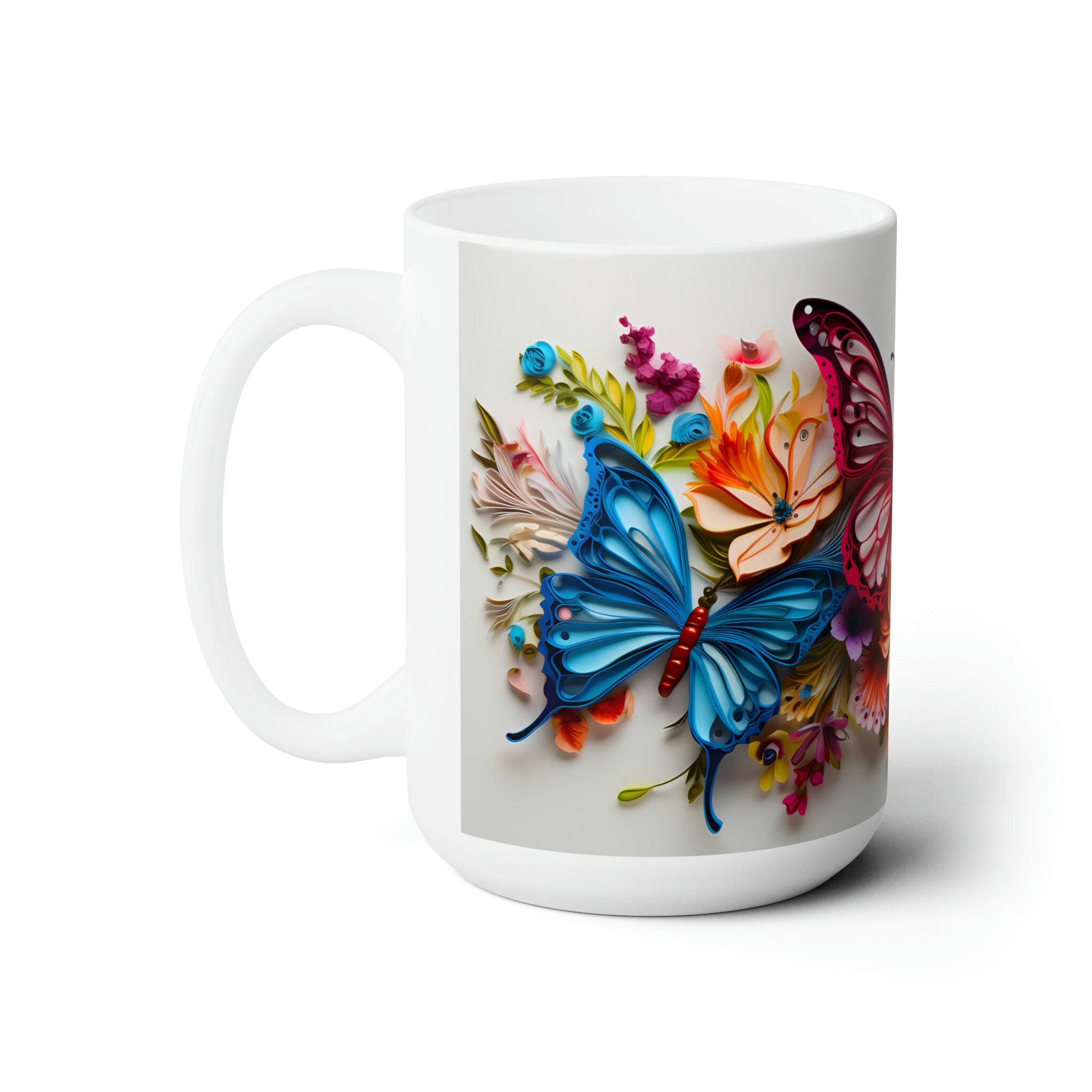 Embrace the ethereal allure of our Pink and Blue Colorful Butterflies On Flowers, a mesmerizing 11-ounce or 15-ounce ceramic masterpiece where graceful wings and blooming petals intertwine, transforming your sips into a captivating journey through nature's elegance.