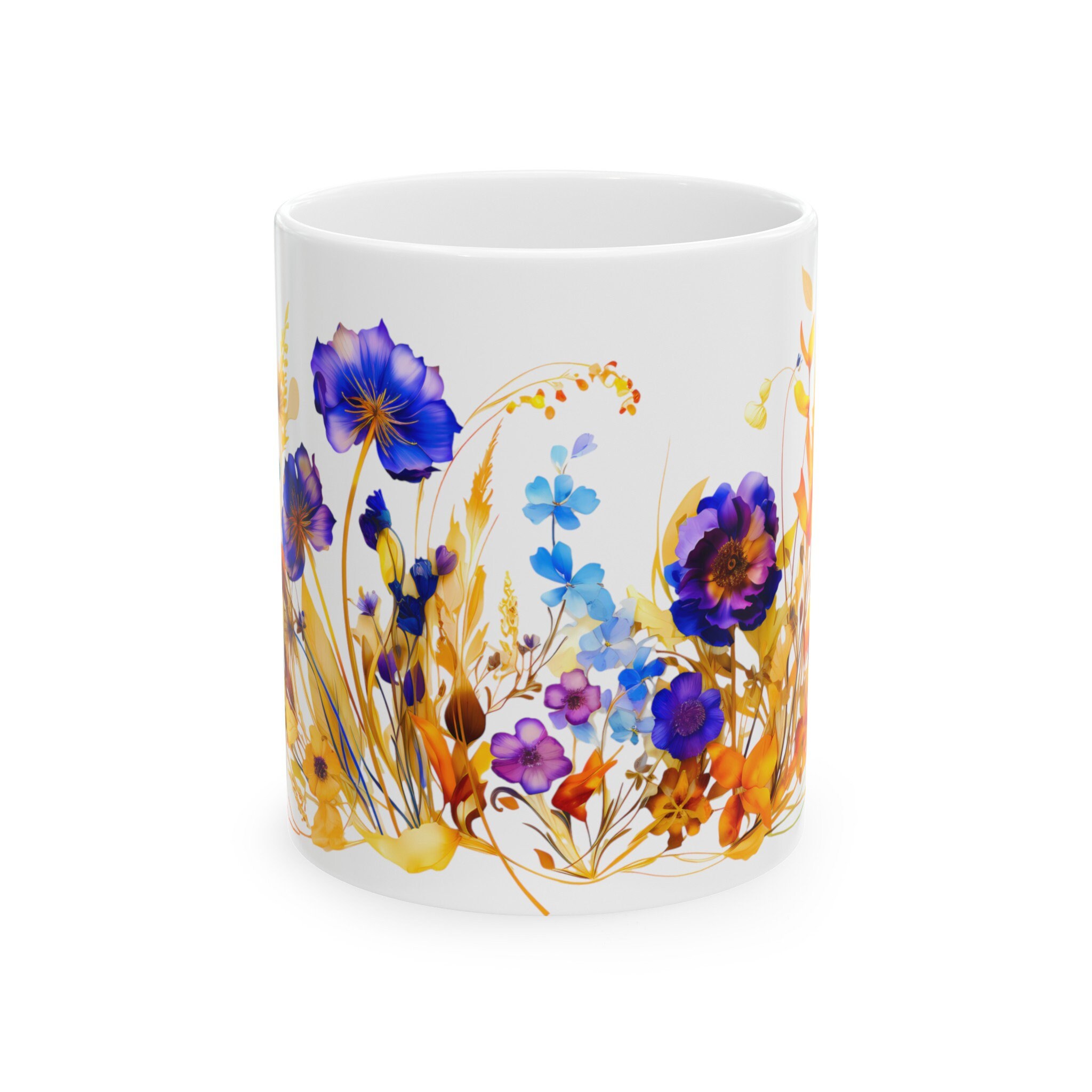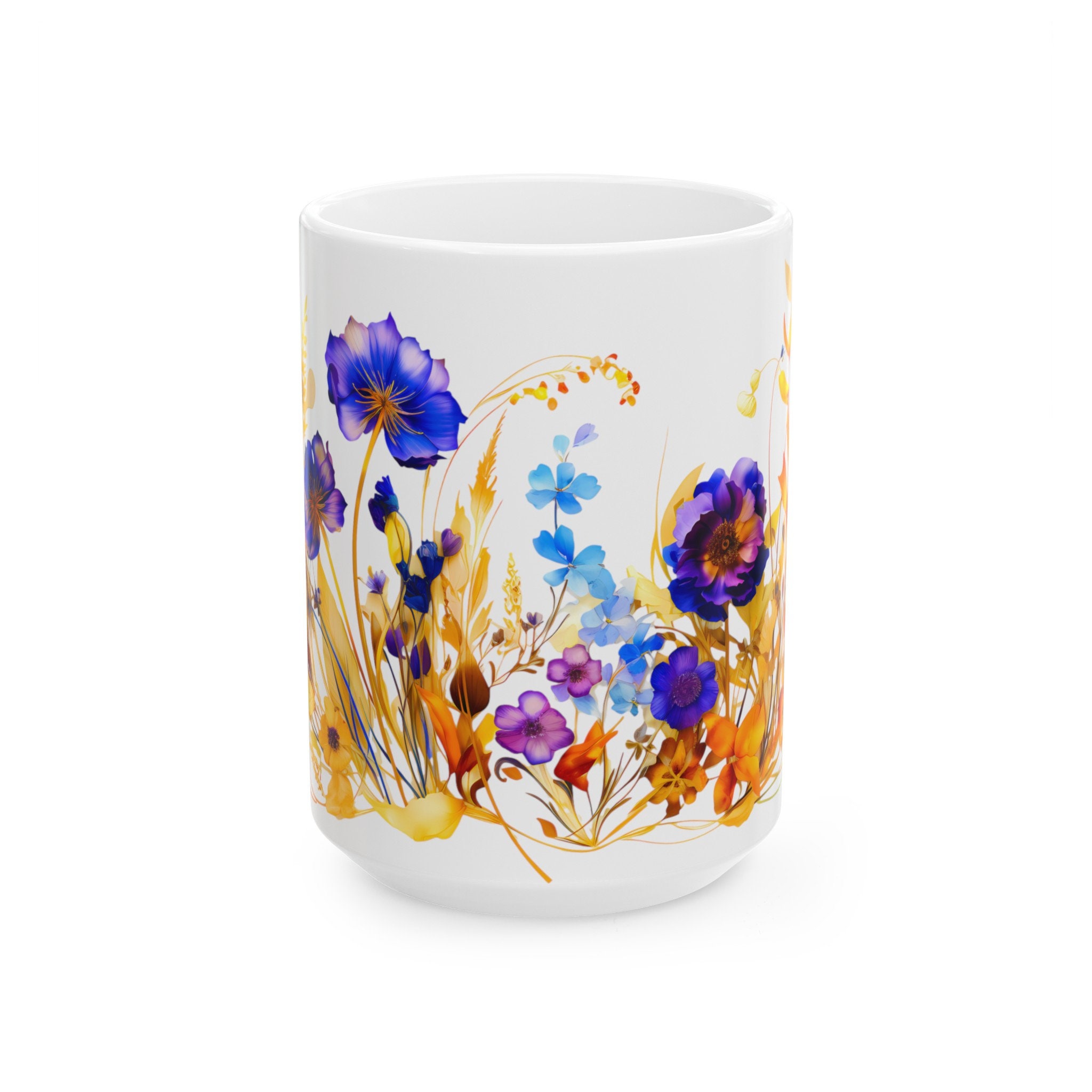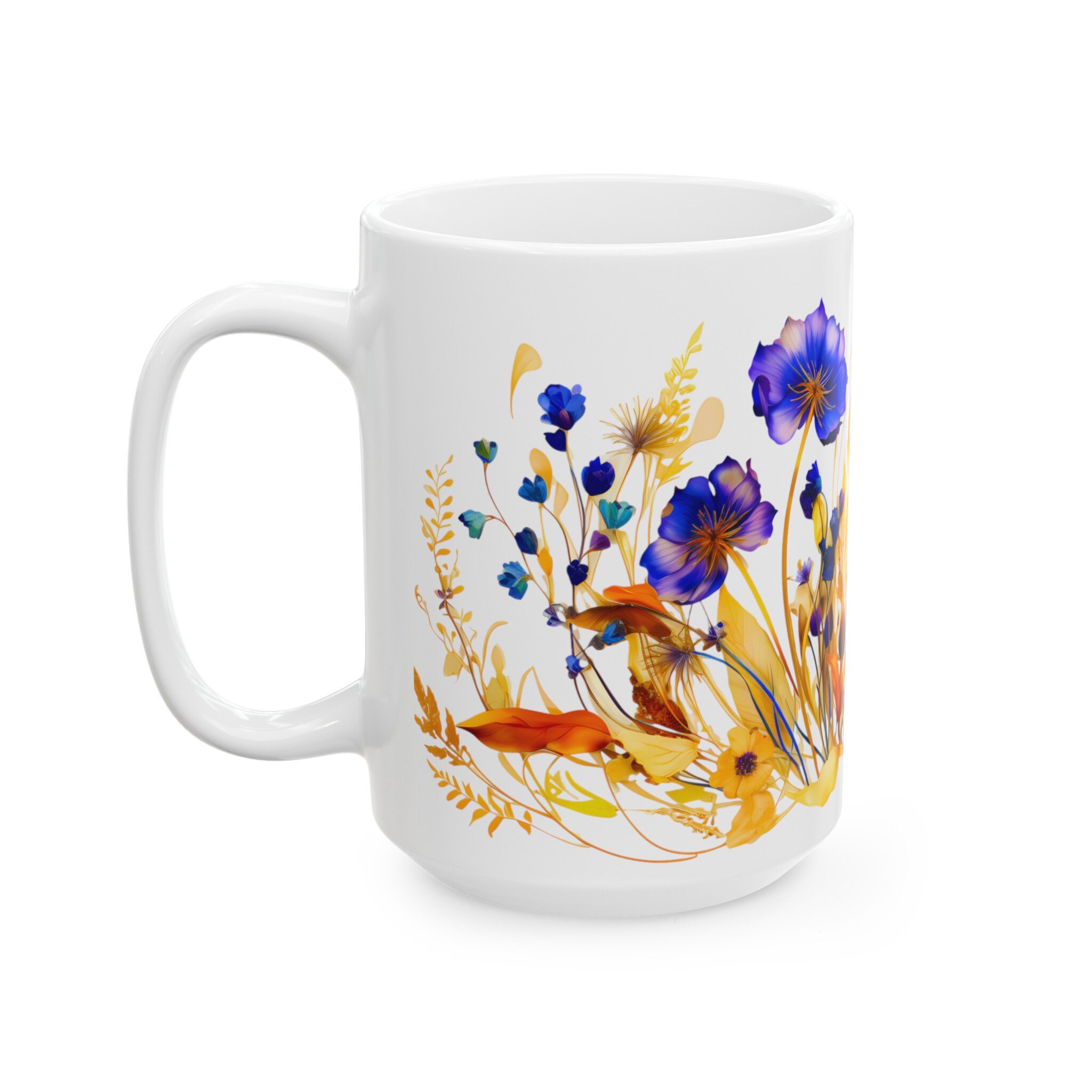 'Blue Vintage Botanical Wildflowers,' where each delicate bloom tells a story of nature's timeless beauty. Available in both 11-ounce and 15-ounce sizes, these white ceramic mugs bring a touch of vintage charm to your daily sips