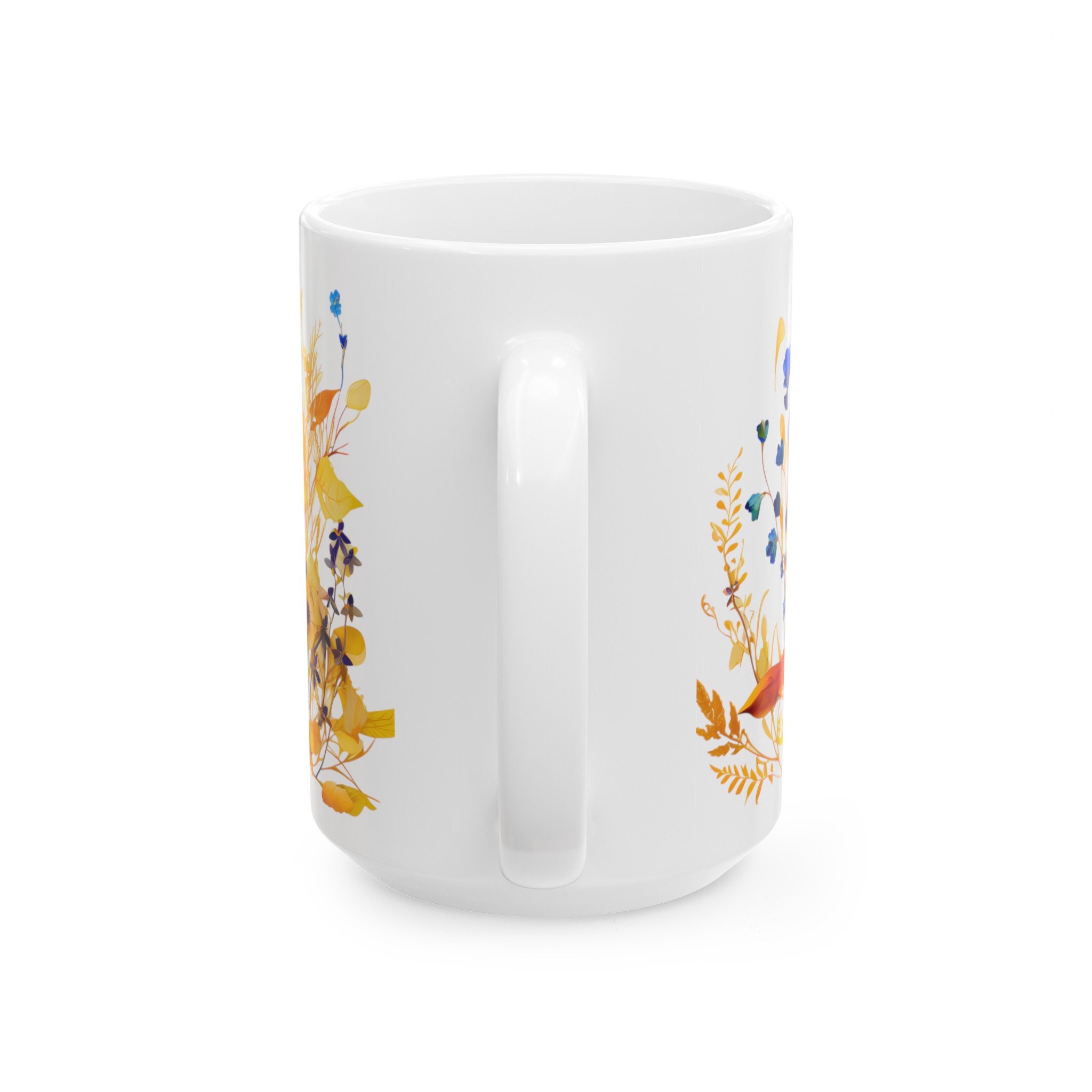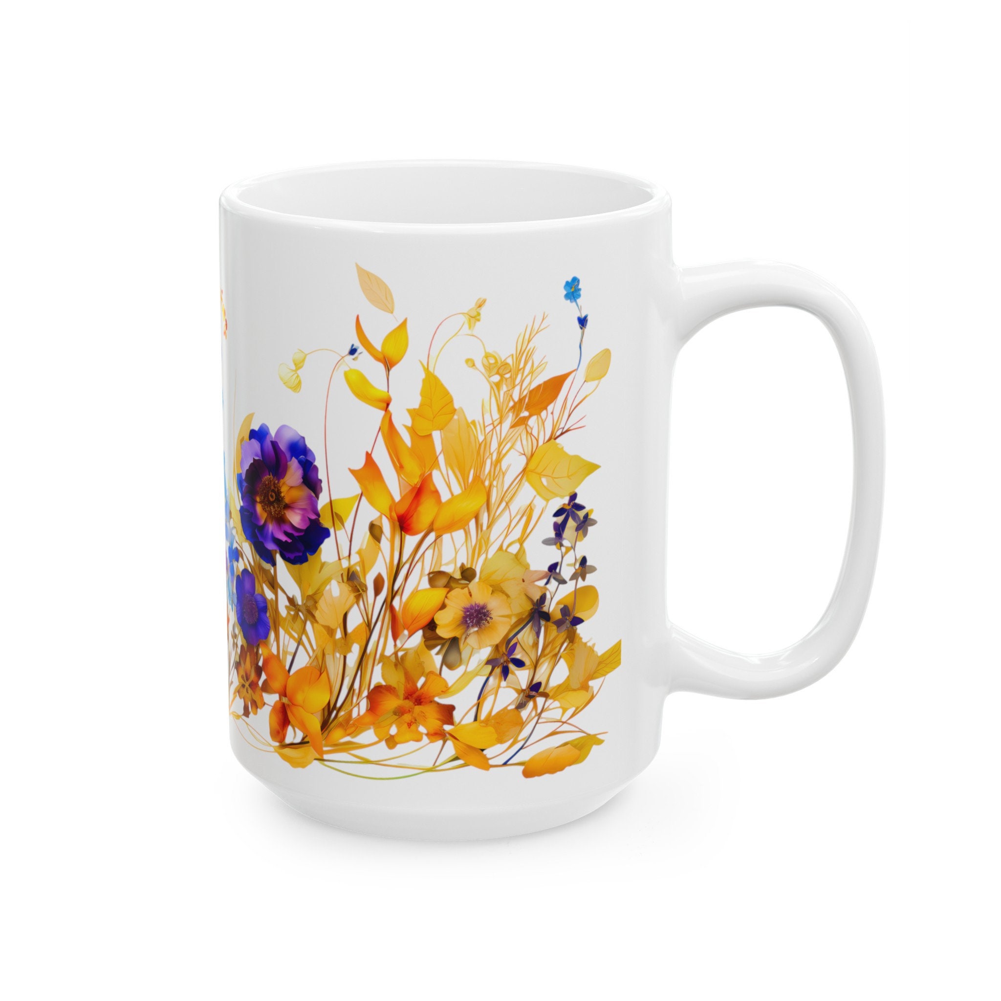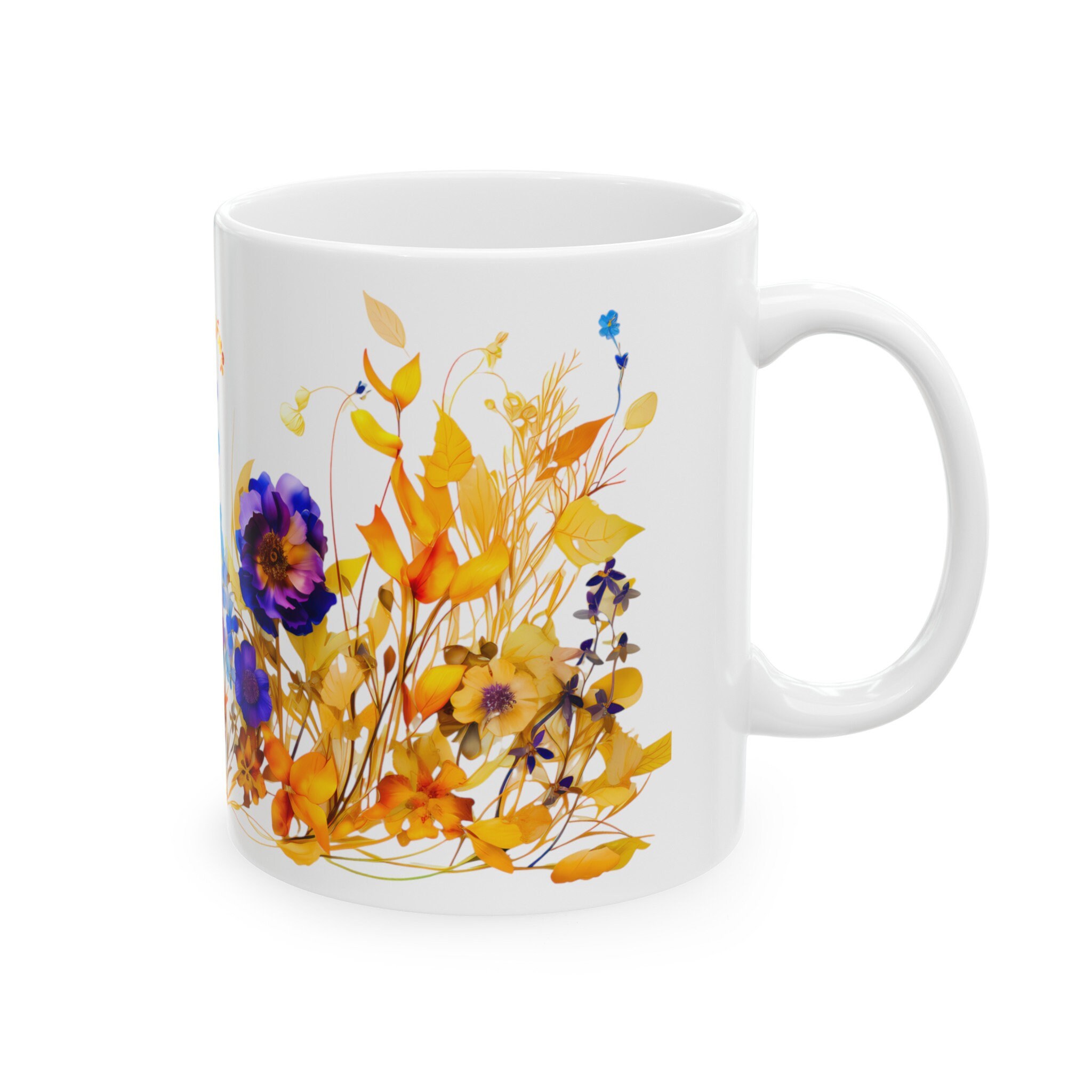 'Blue Vintage Botanical Wildflowers,' where each delicate bloom tells a story of nature's timeless beauty. Available in both 11-ounce and 15-ounce sizes, these white ceramic mugs bring a touch of vintage charm to your daily sips