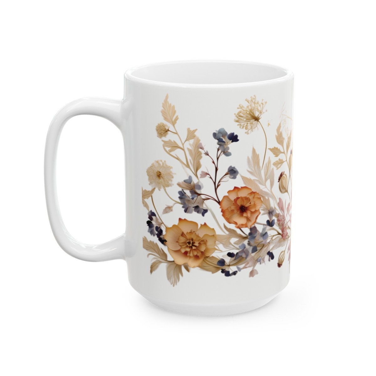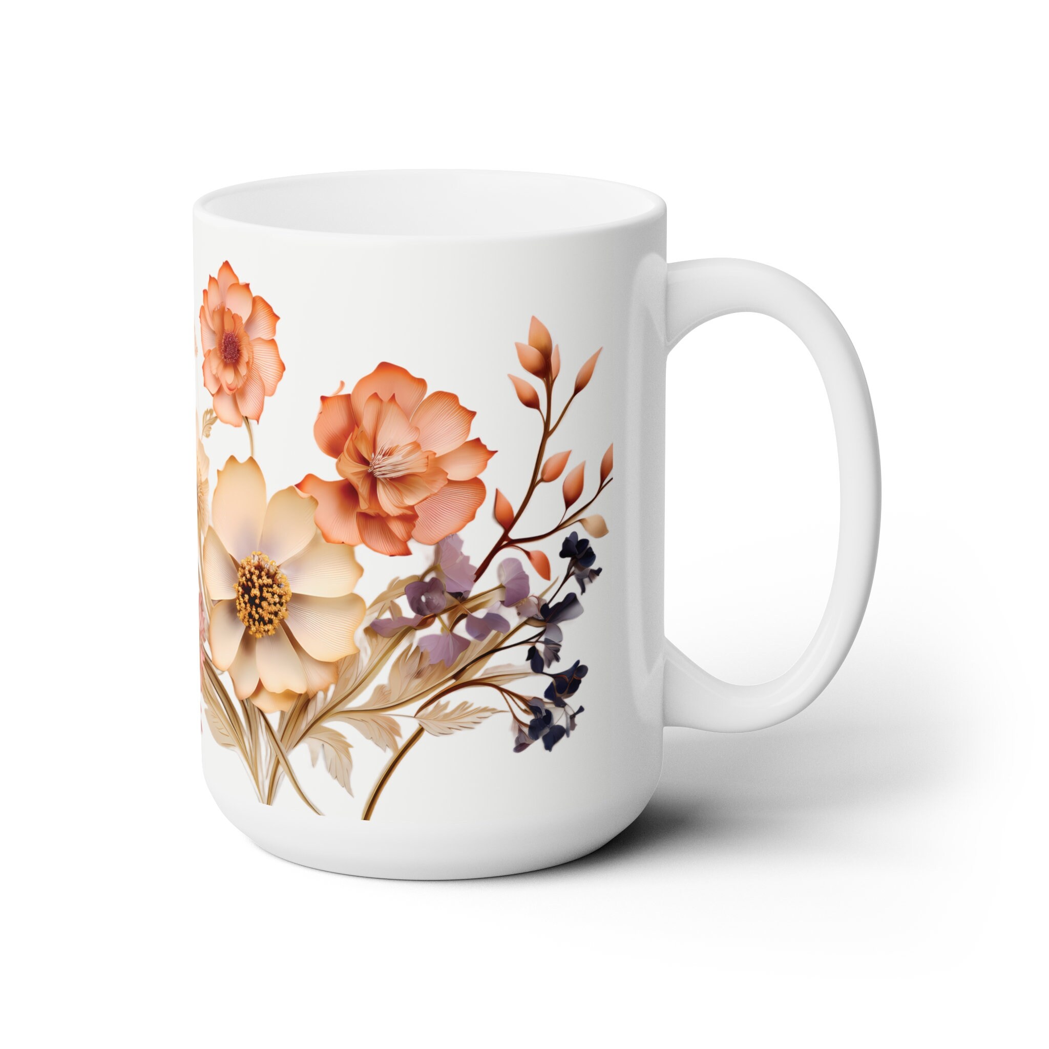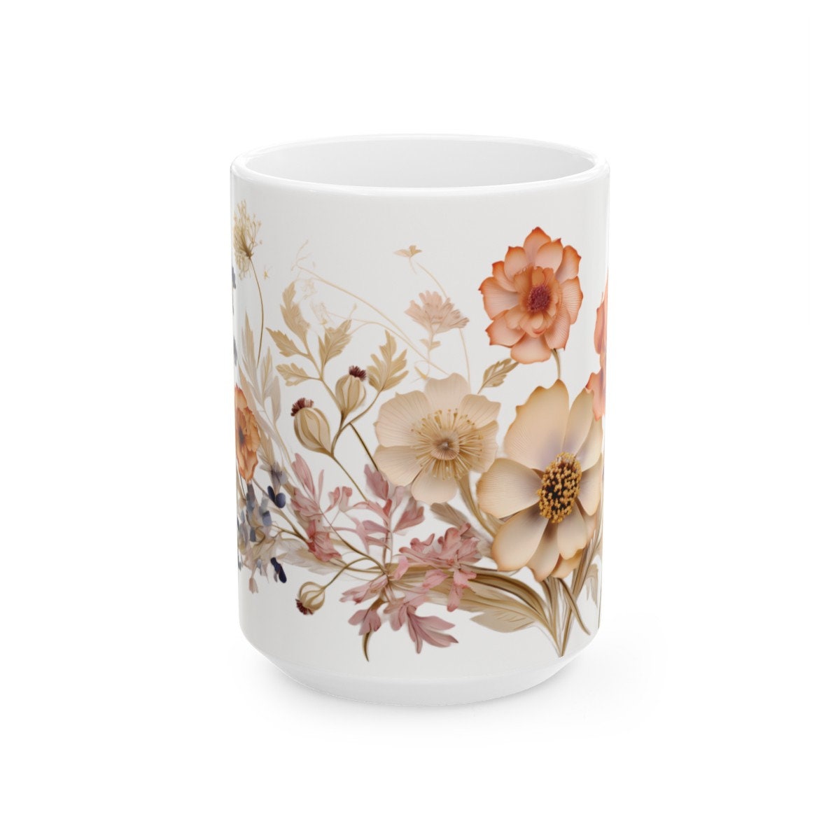 'Charming Vintage Wildflowers,' where each delicate bloom tells a story of nature's timeless beauty. Available in both 11-ounce and 15-ounce sizes, these white ceramic mugs bring a touch of vintage charm to your daily sips