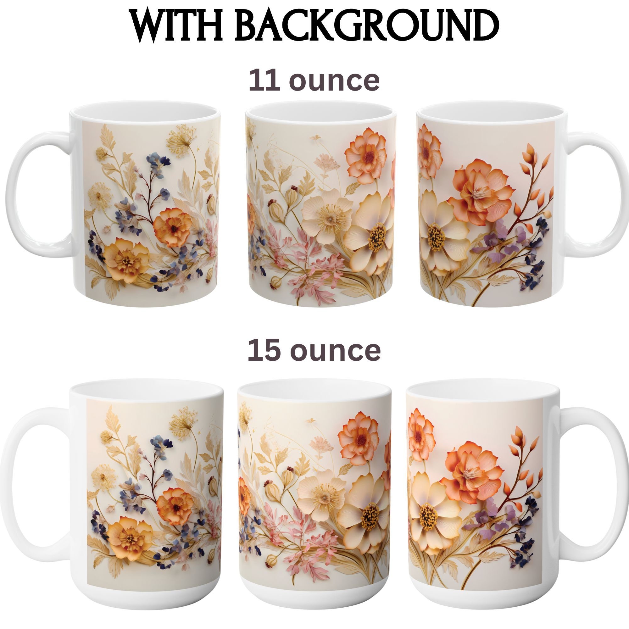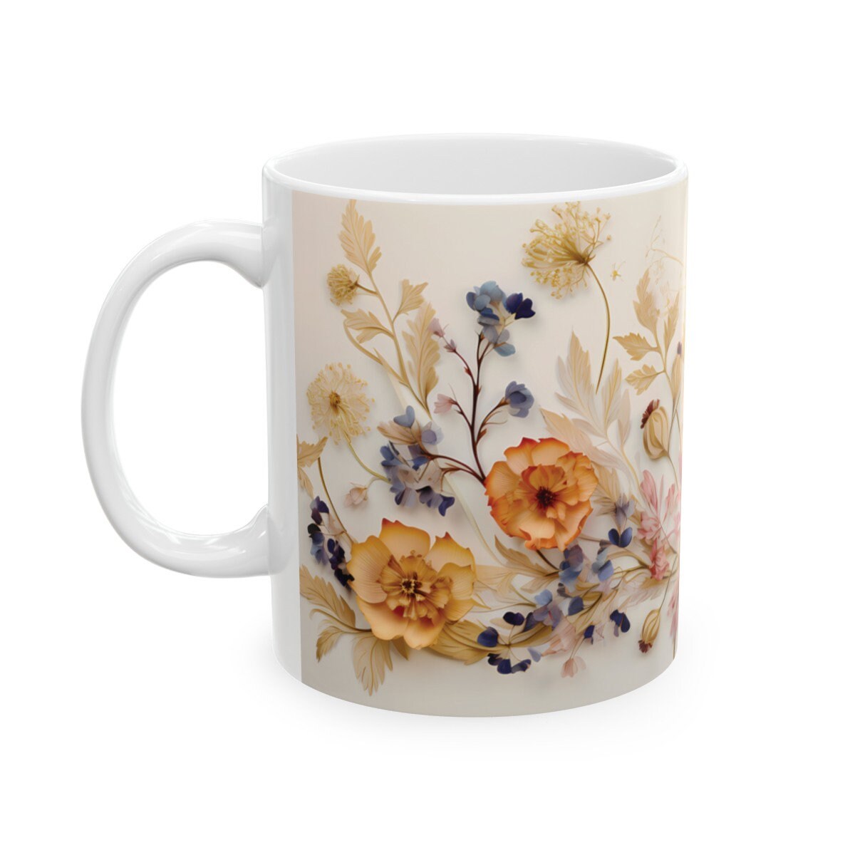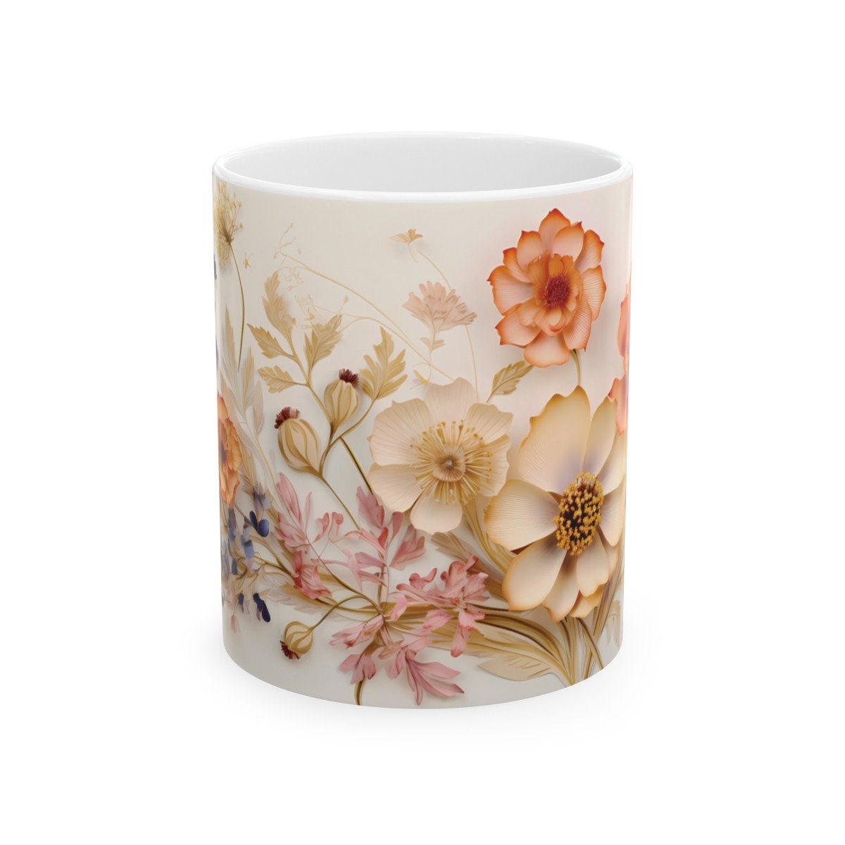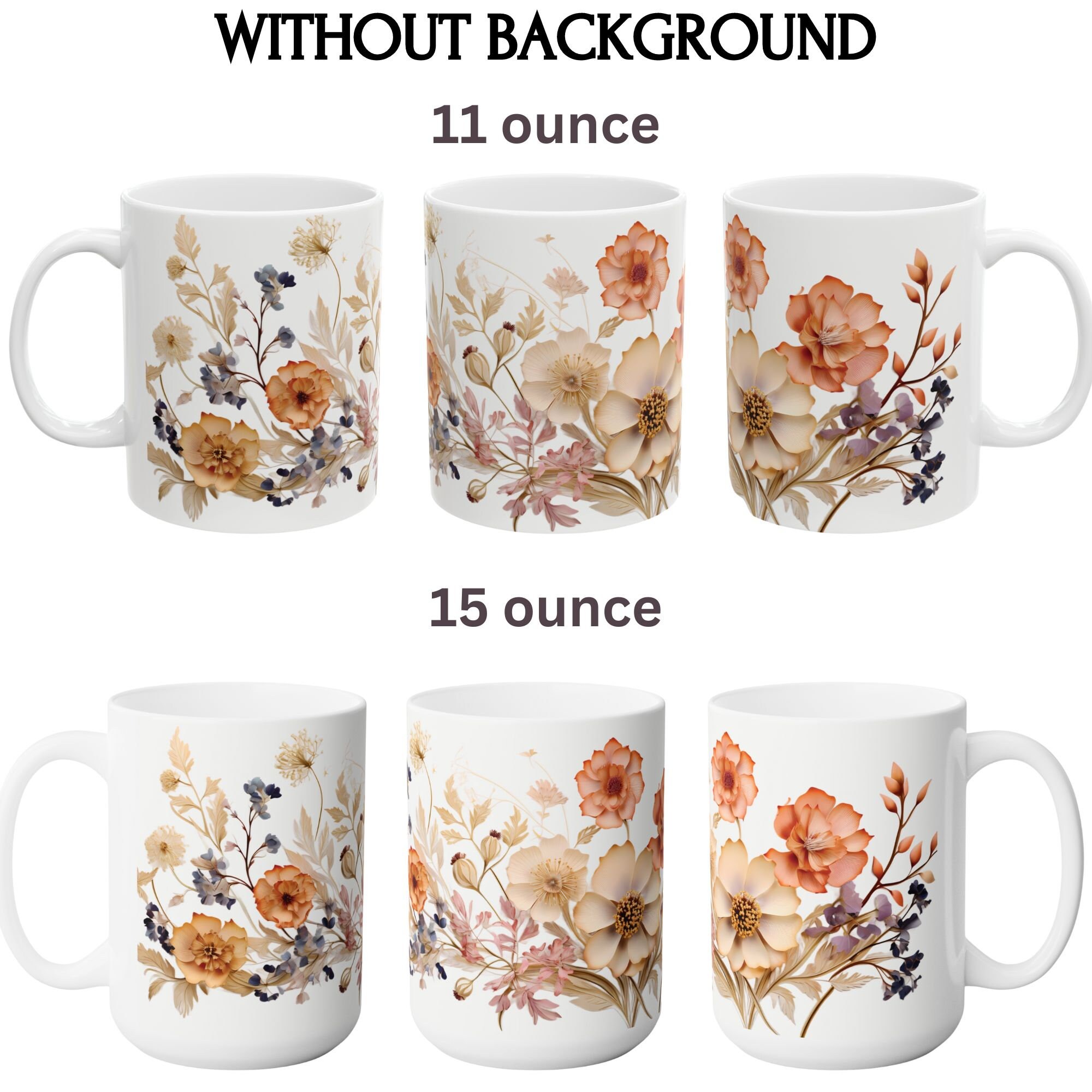 'Charming Vintage Wildflowers,' where each delicate bloom tells a story of nature's timeless beauty. Available in both 11-ounce and 15-ounce sizes, these white ceramic mugs bring a touch of vintage charm to your daily sips