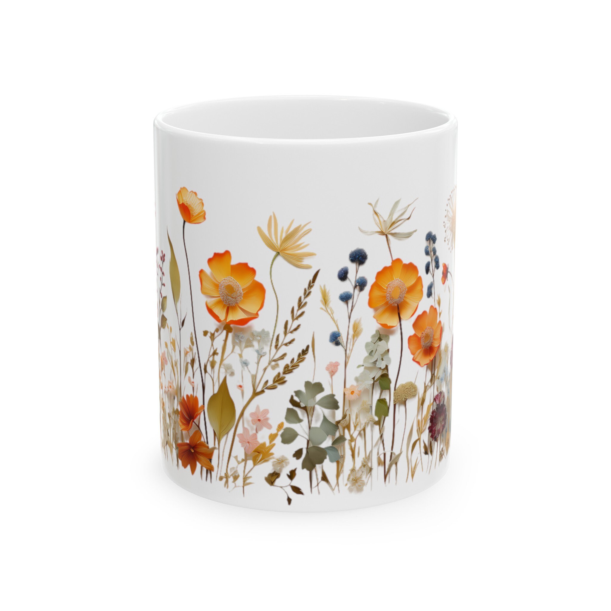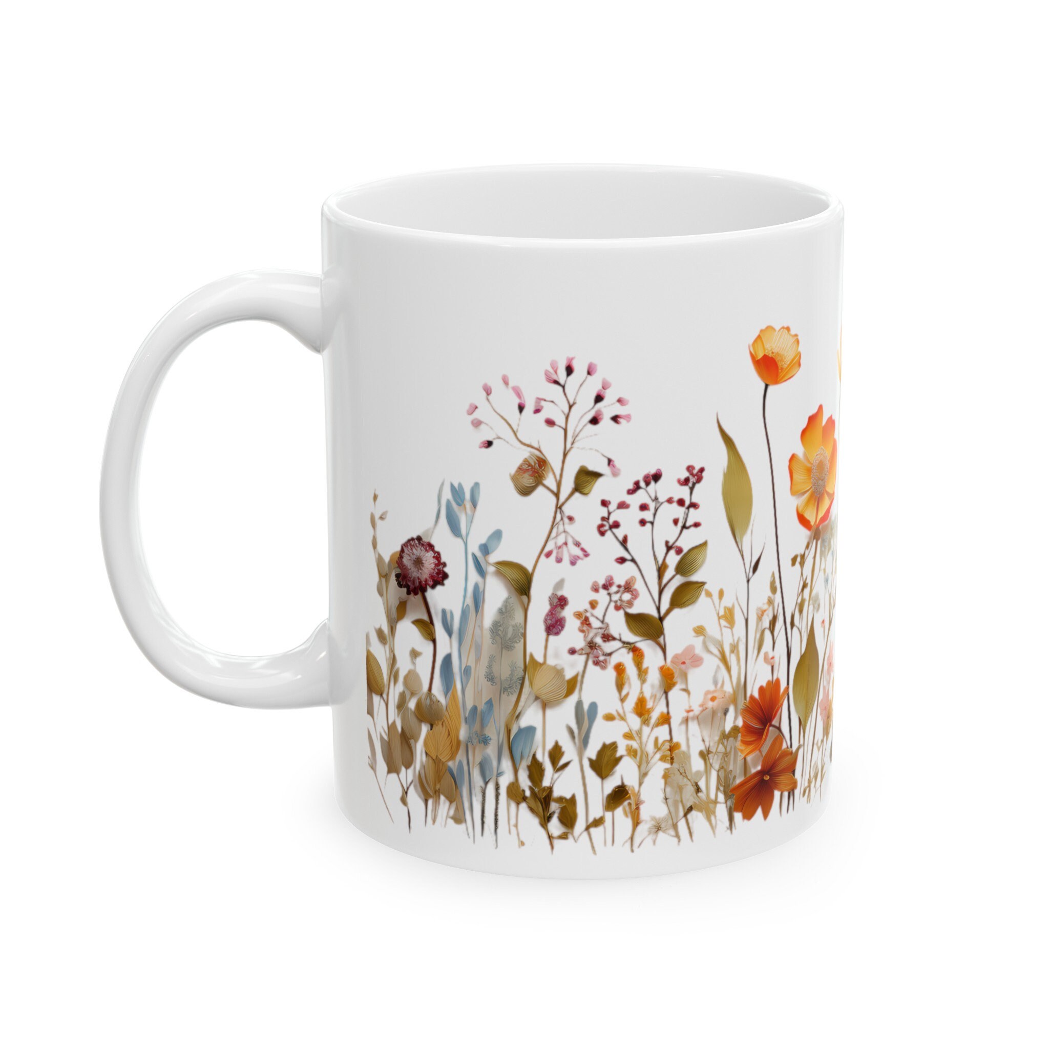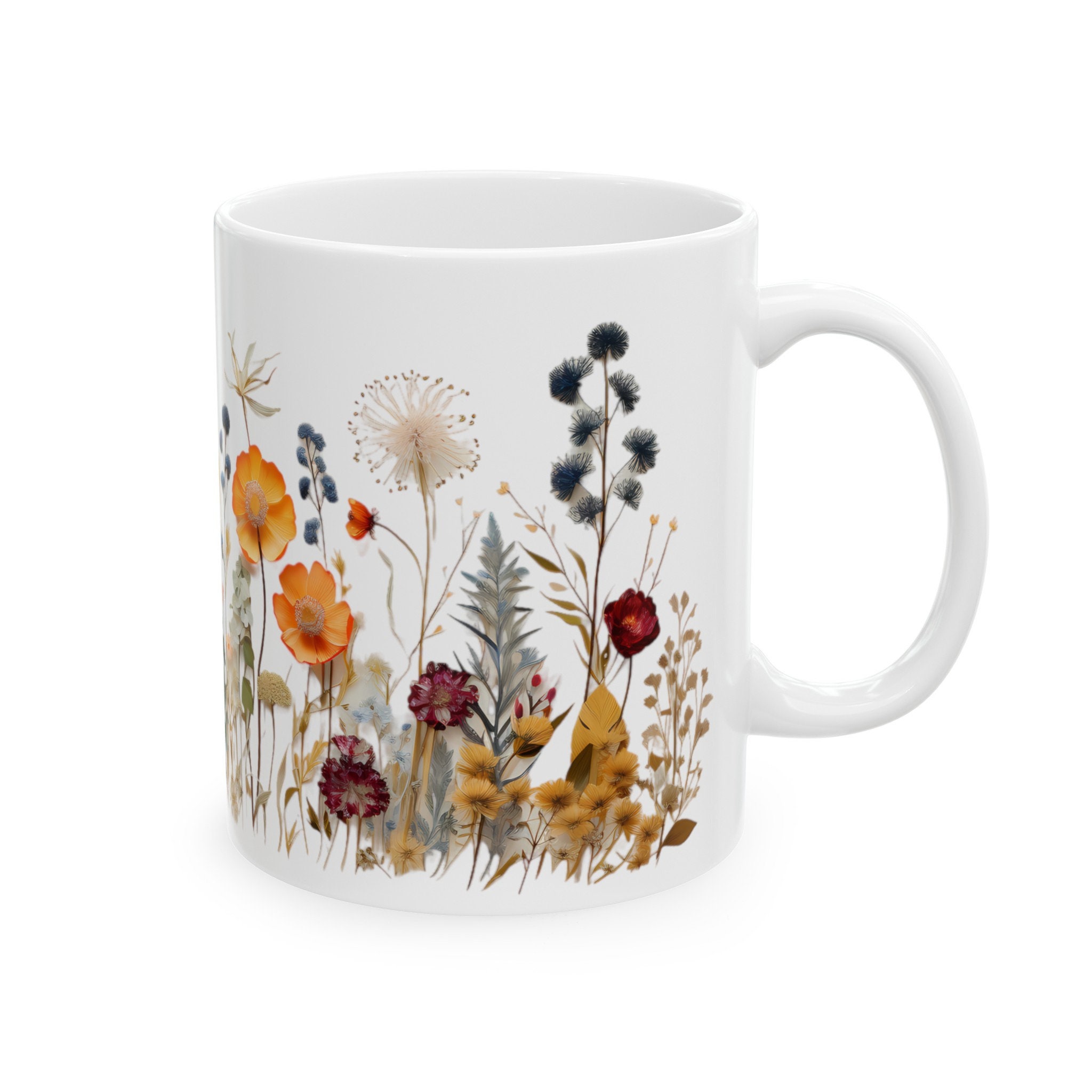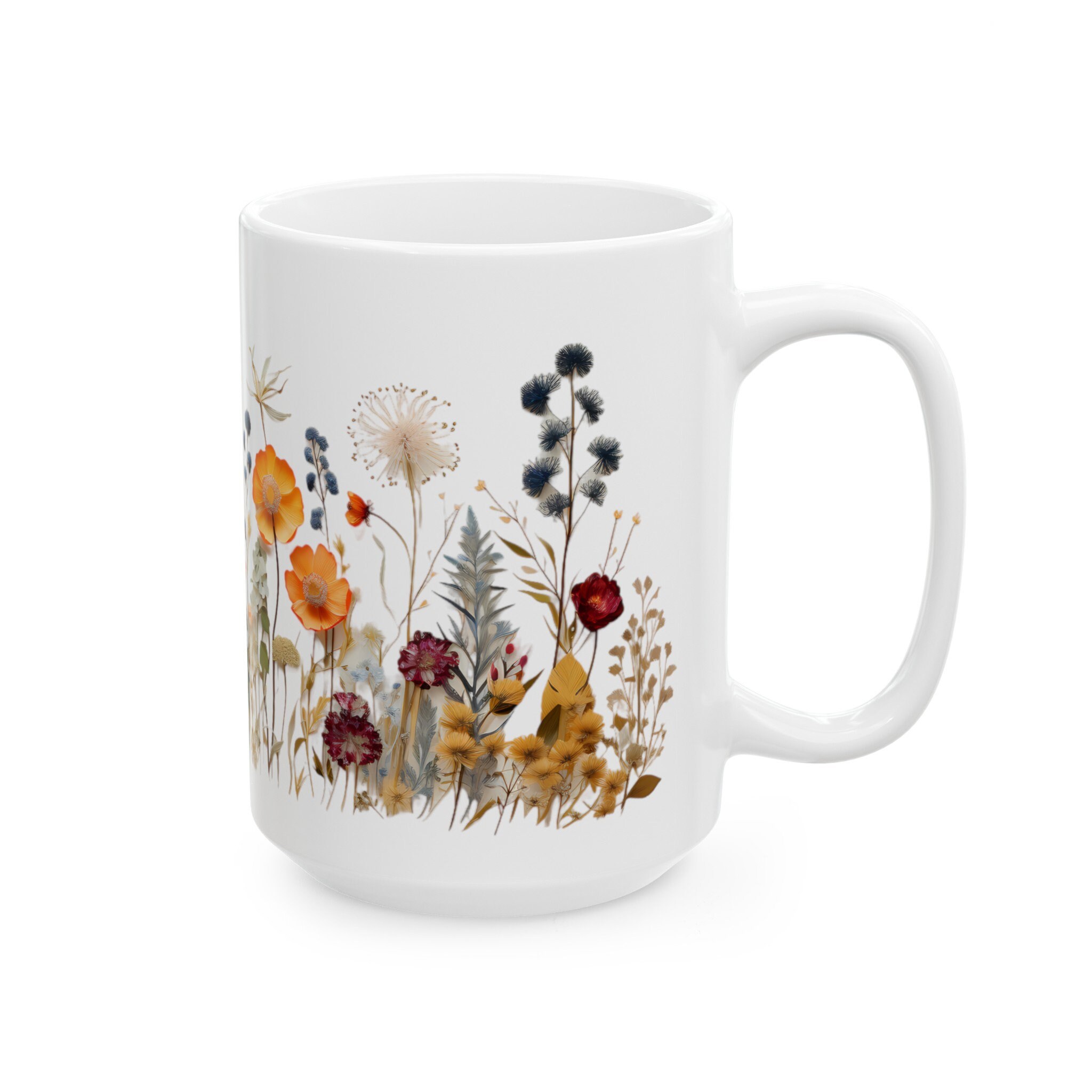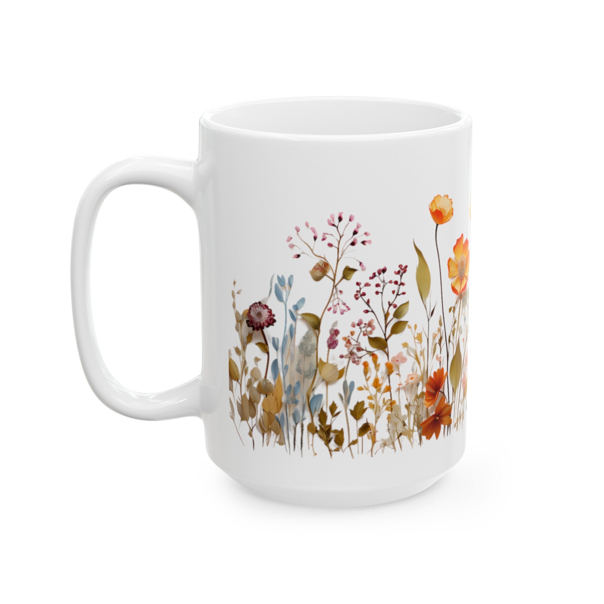'Charming Vintage Botanical Wildflowers,' where each delicate bloom tells a story of nature's timeless beauty. Available in both 11-ounce and 15-ounce sizes, these white ceramic mugs bring a touch of vintage charm to your daily sips