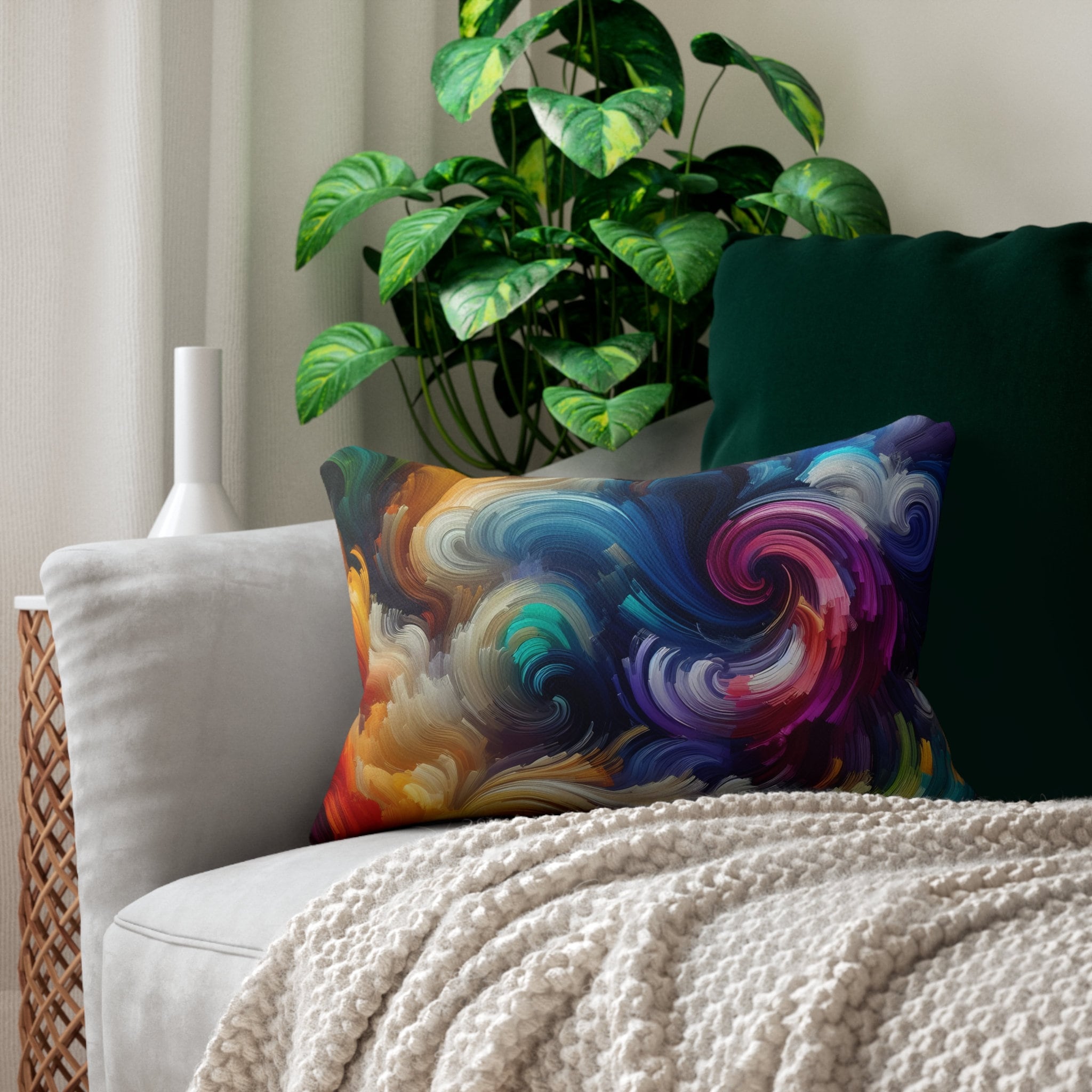 Elevate your home decor with our Abstract Bliss Colorful Lumbar Pillow, a stunning addition to your living space. This spun-polyester lumbar pillow effortlessly blends style and comfort, making it a must-have for any design-conscious home. The pillow comes complete with a stuffing pillow included, ensuring instant coziness and appeal.