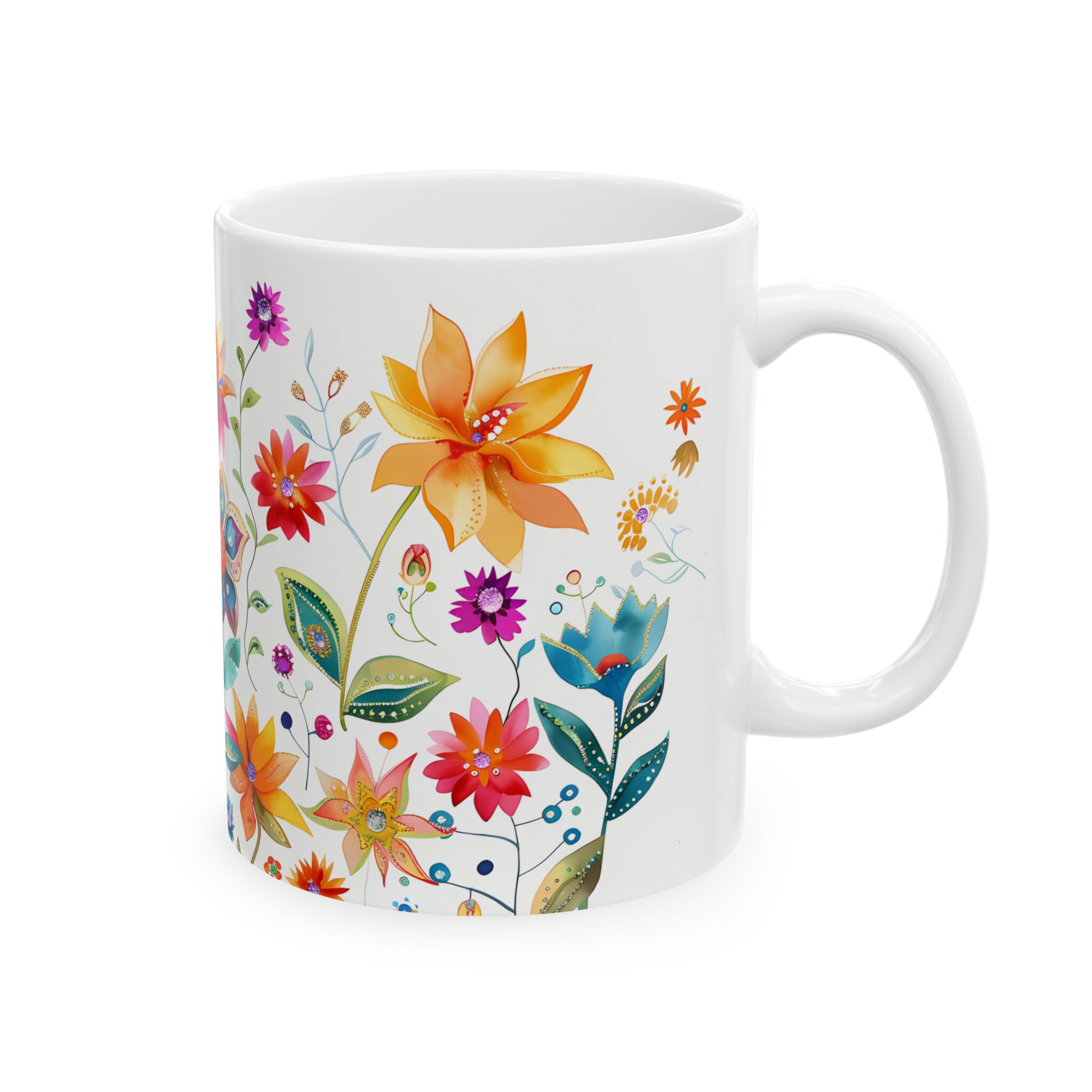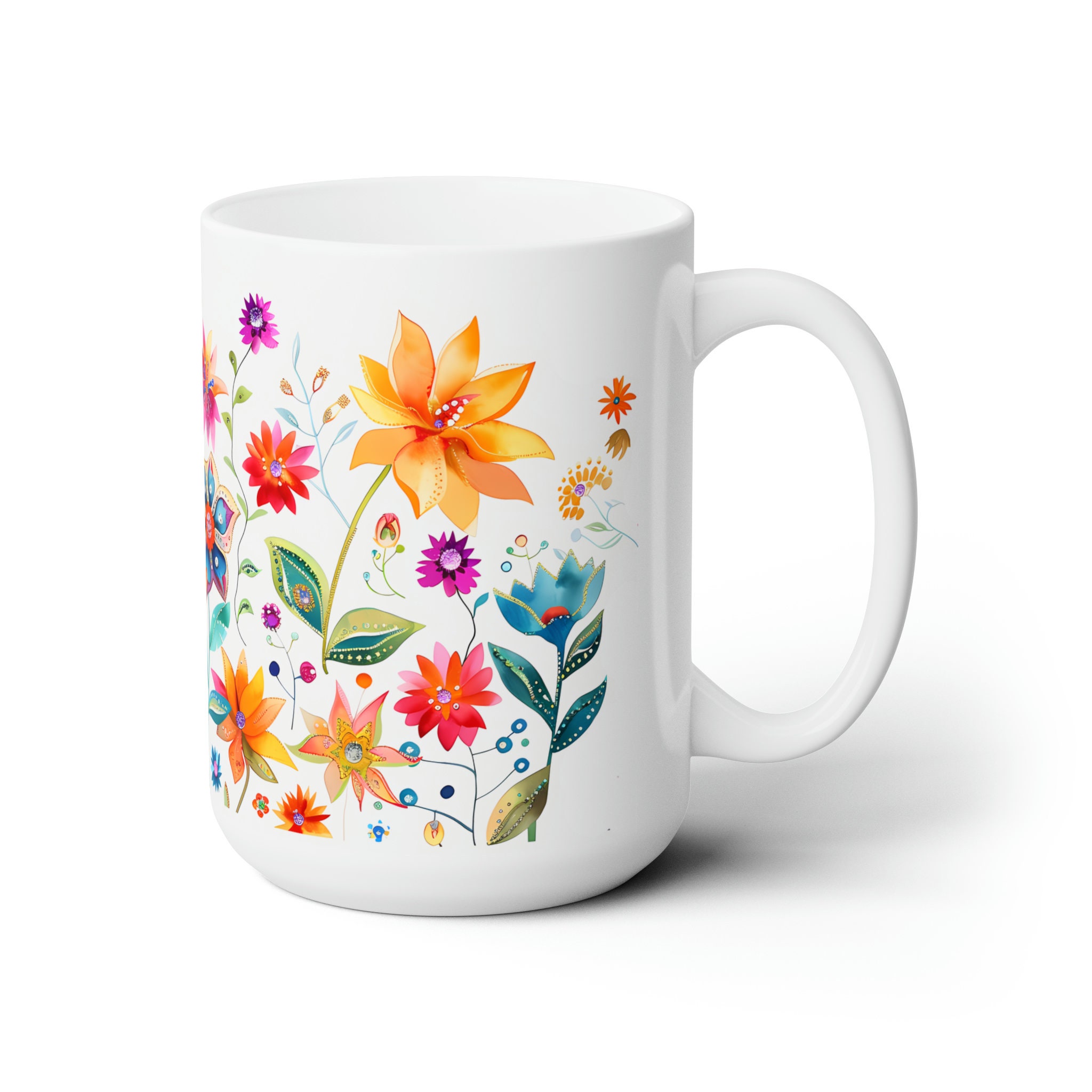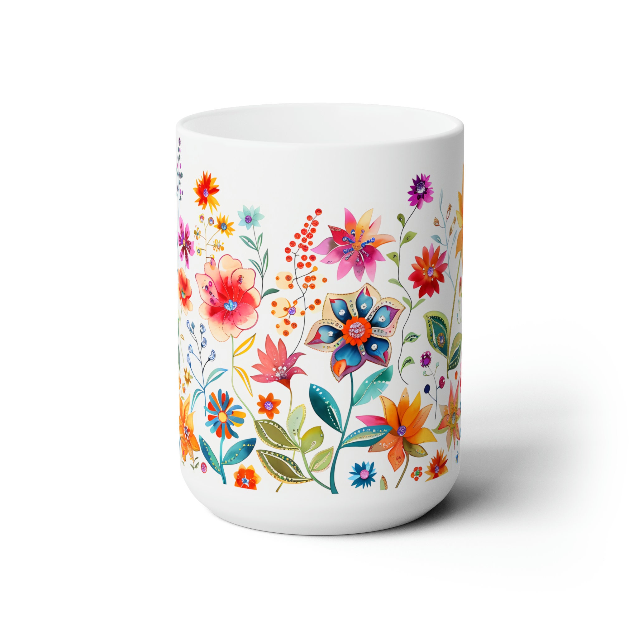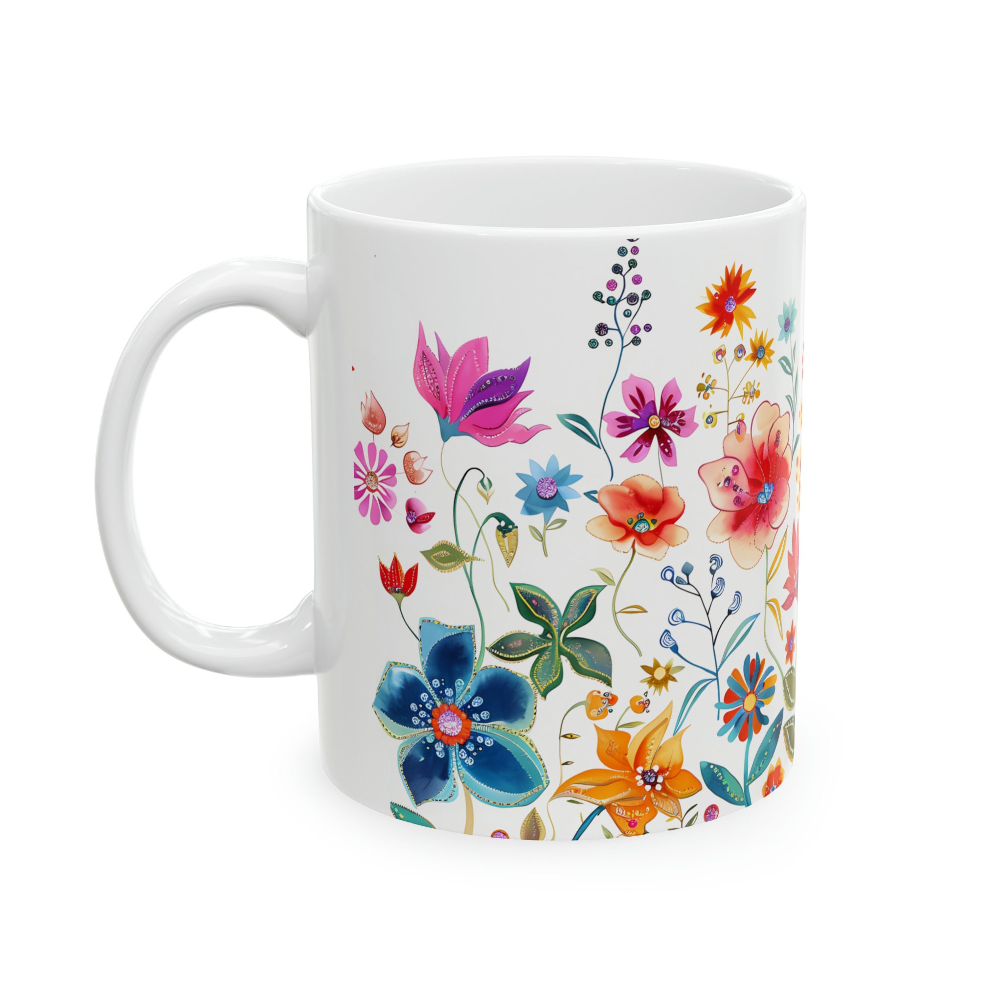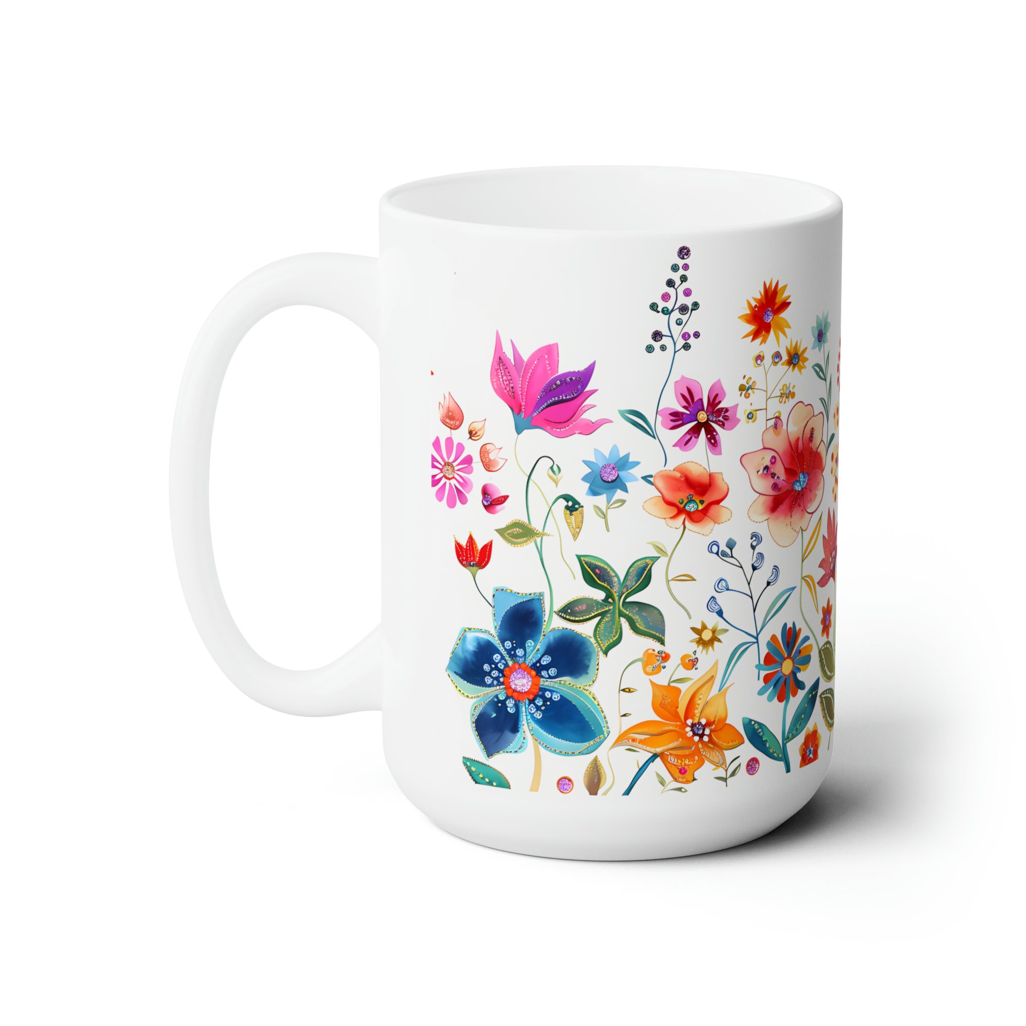 Sip in style with this vibrant wildflower mug adorned with colorful wildflowers. A delightful fusion of beauty and functionality for your morning brew. Available in both 11-ounce and 15-ounce sizes, these white ceramic mugs bring a touch of vintage charm to your daily sips.