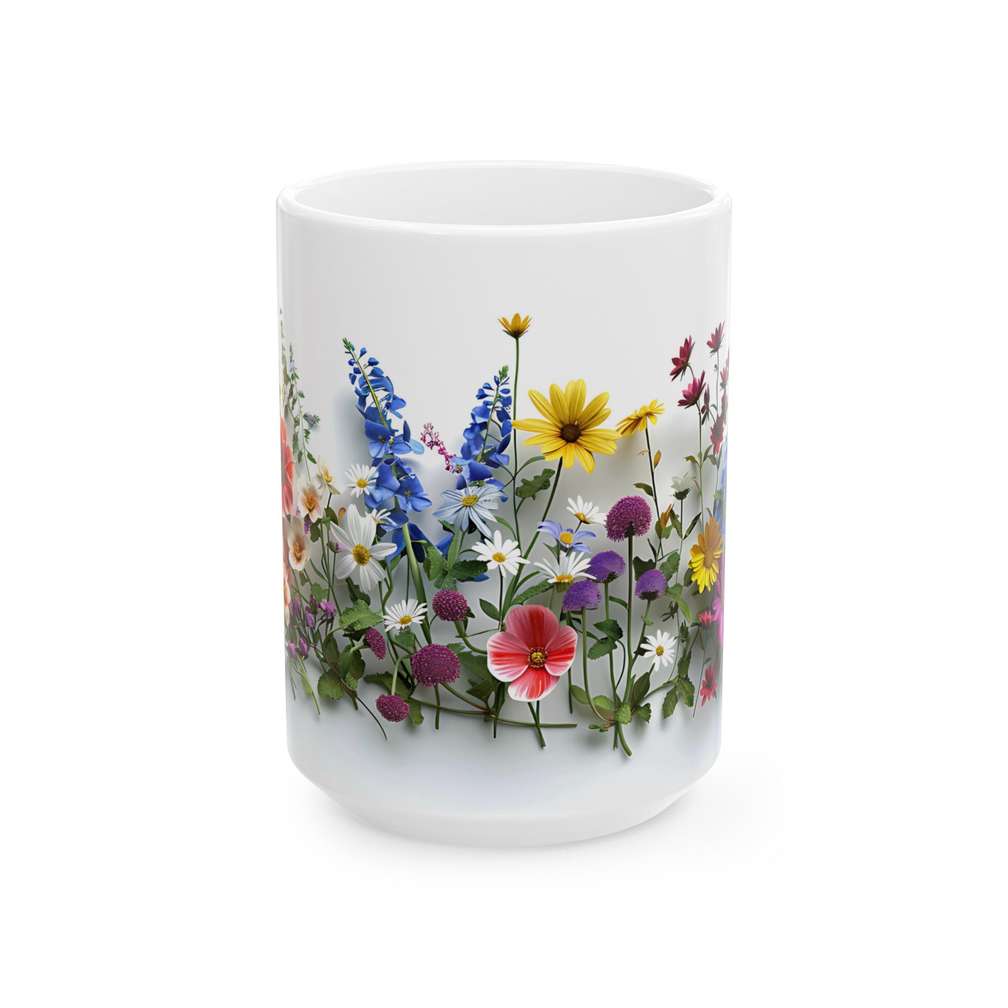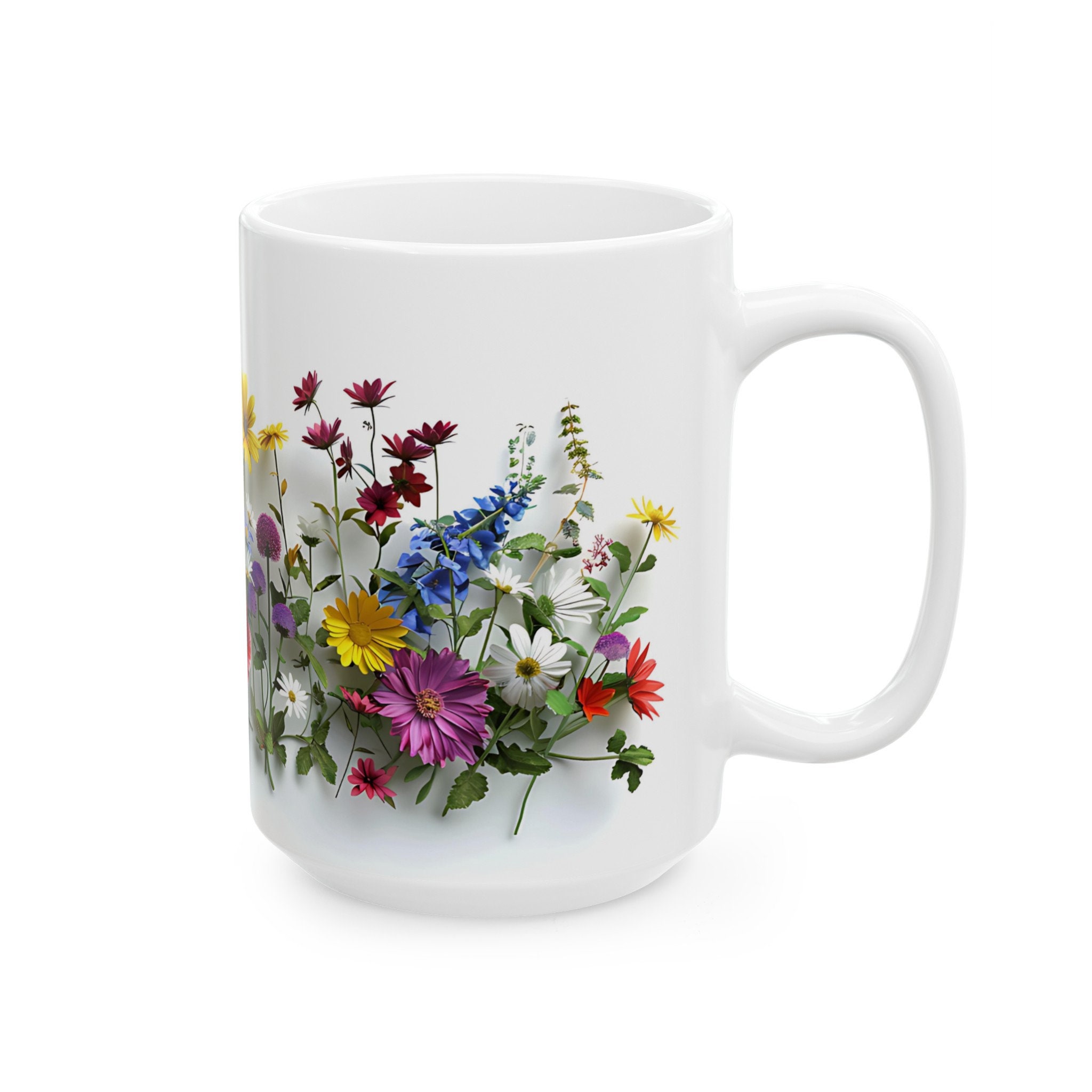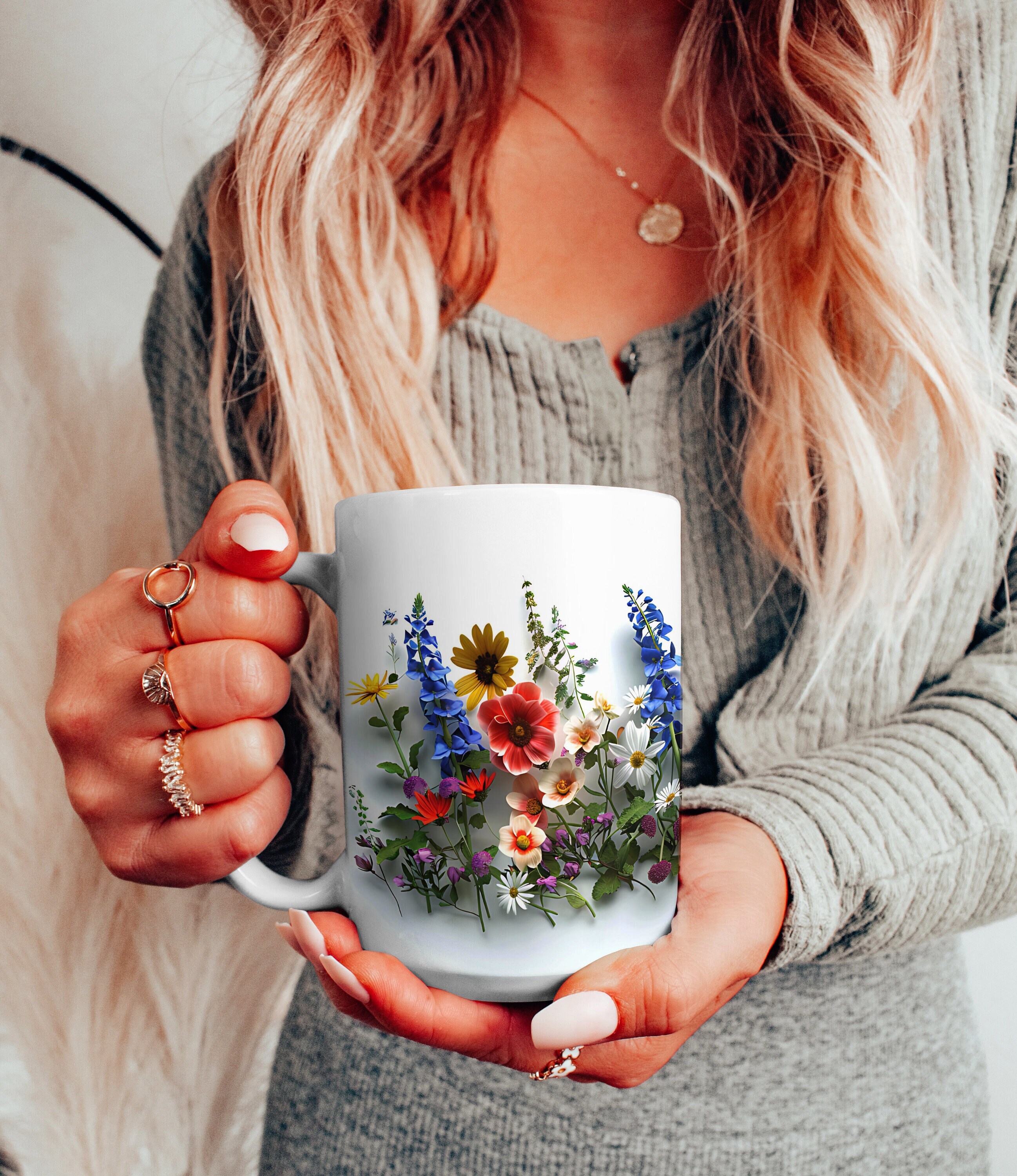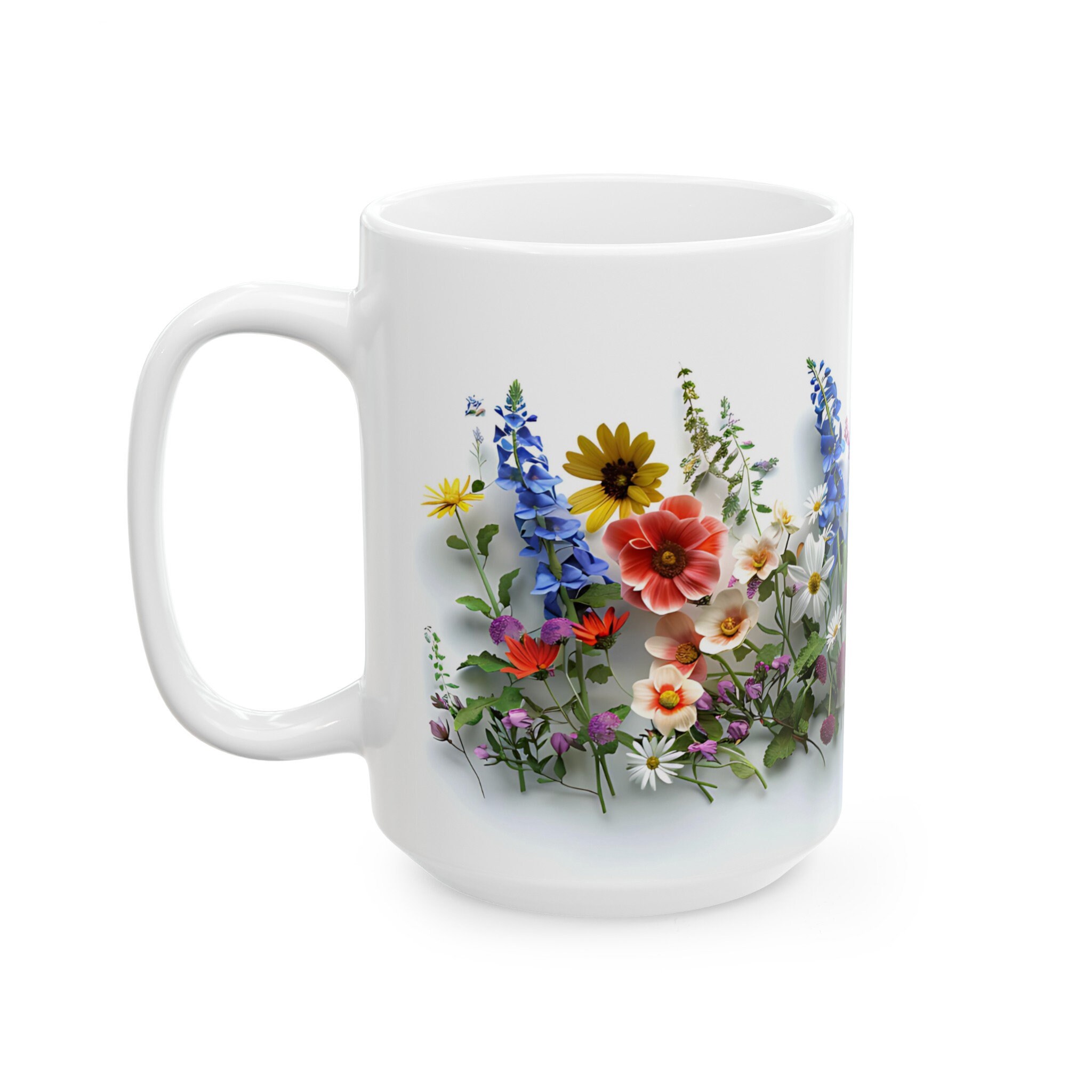 Start your day in style with this mug adorned with colorful and vibrant floral wildflowers. A sophisticated touch to your coffee or tea time. Available in both 11-ounce and 15-ounce sizes.