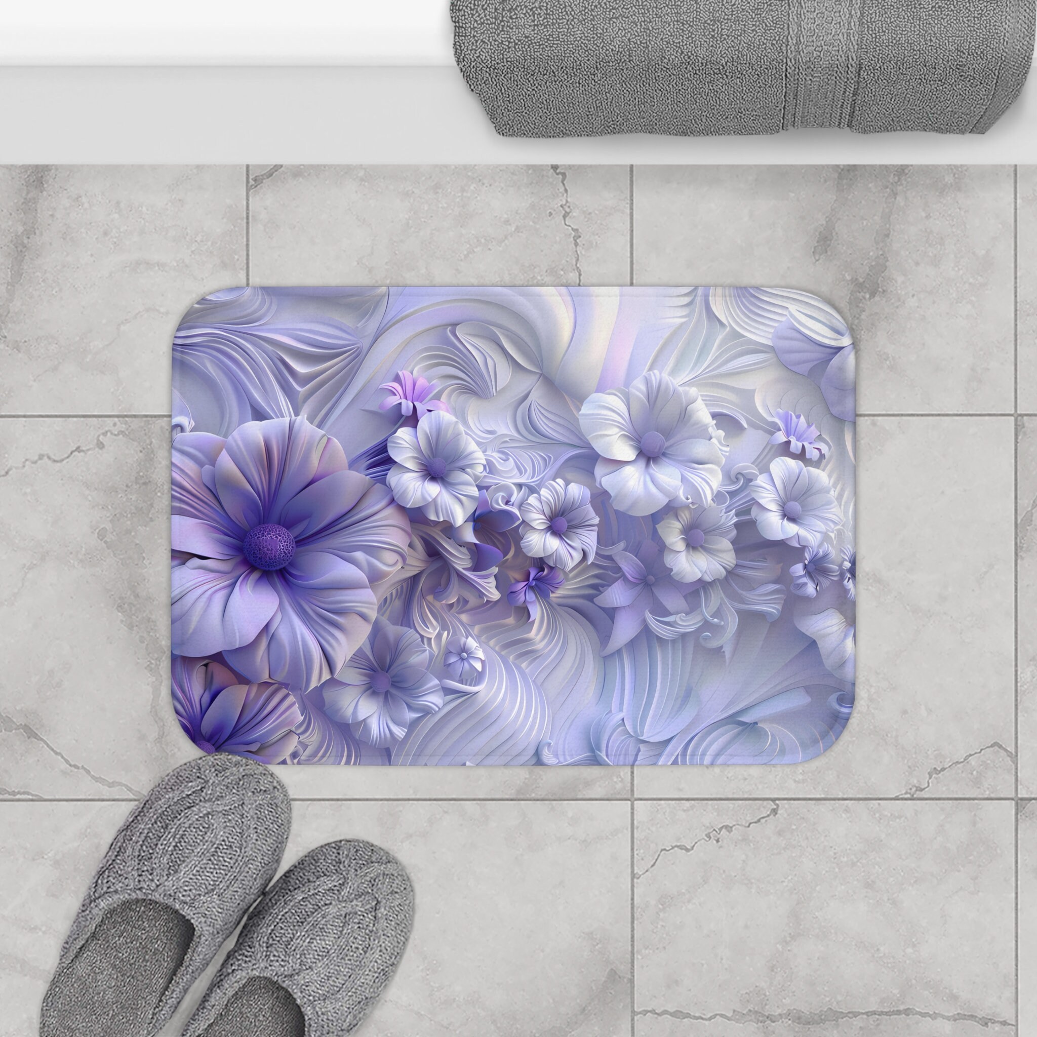 Introducing our stylish and practical "Lavender Blooms 3D Floral Bath Mat," designed to elevate your bathroom experience. The anti-slip backing ensures a secure placement, reducing the risk of slipping for added safety.