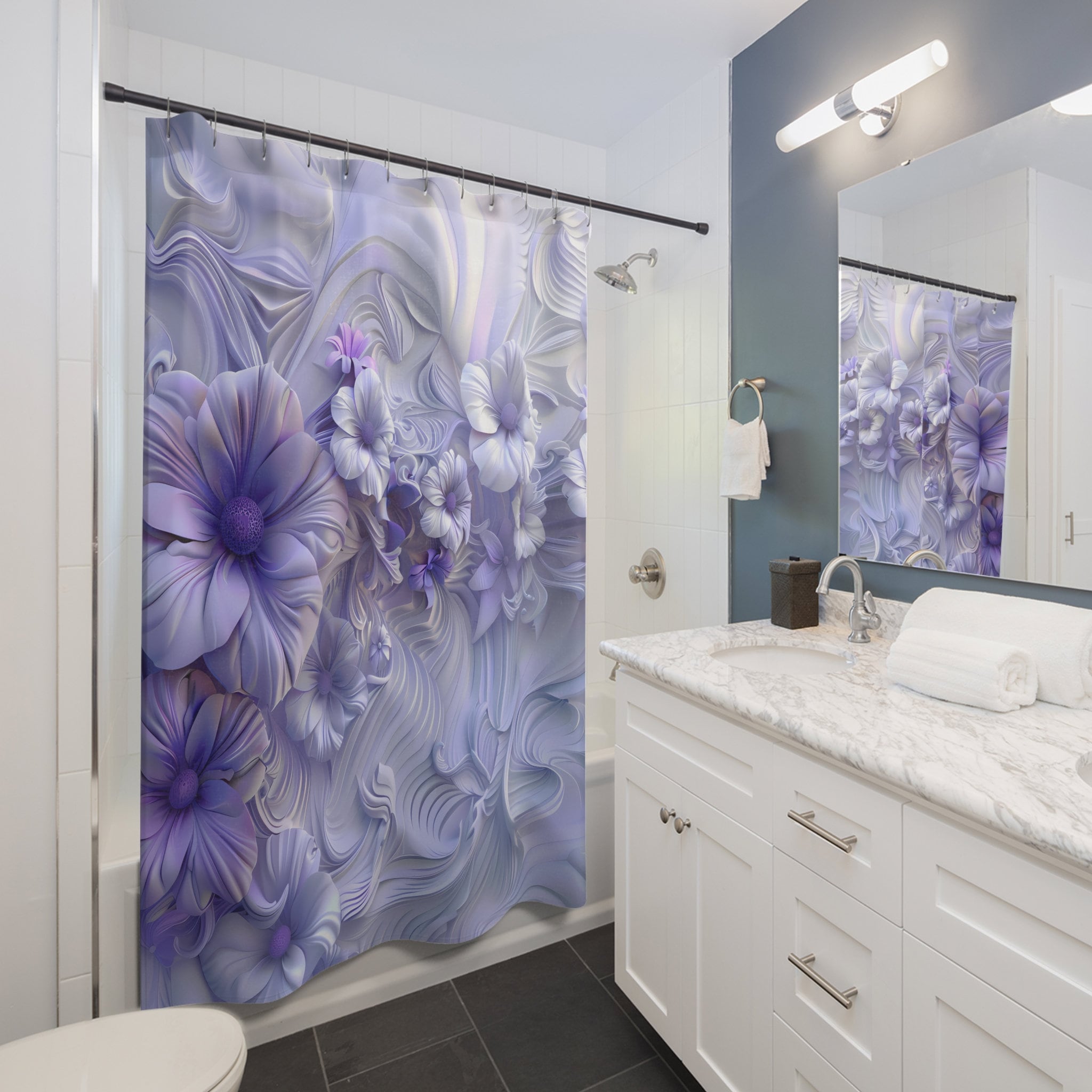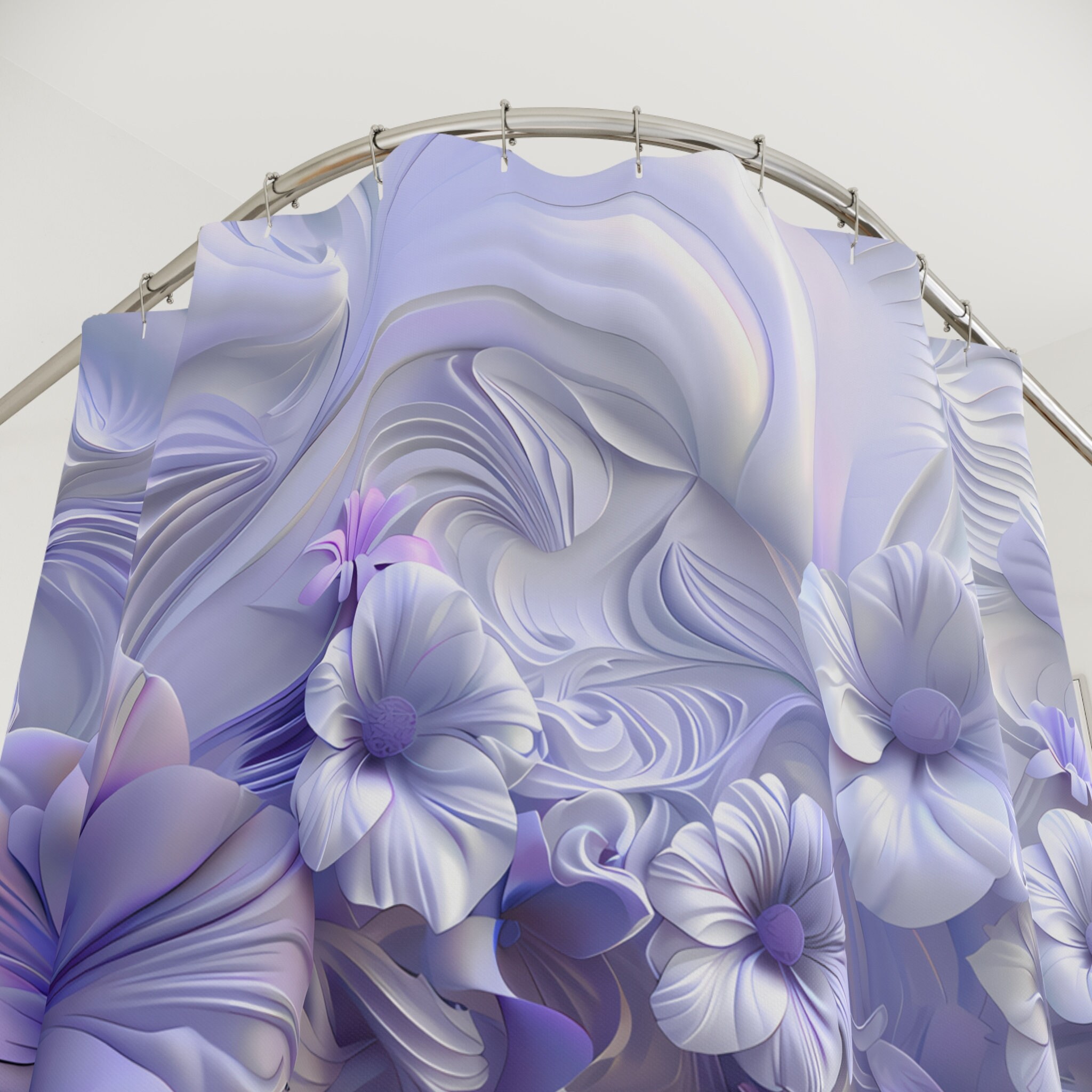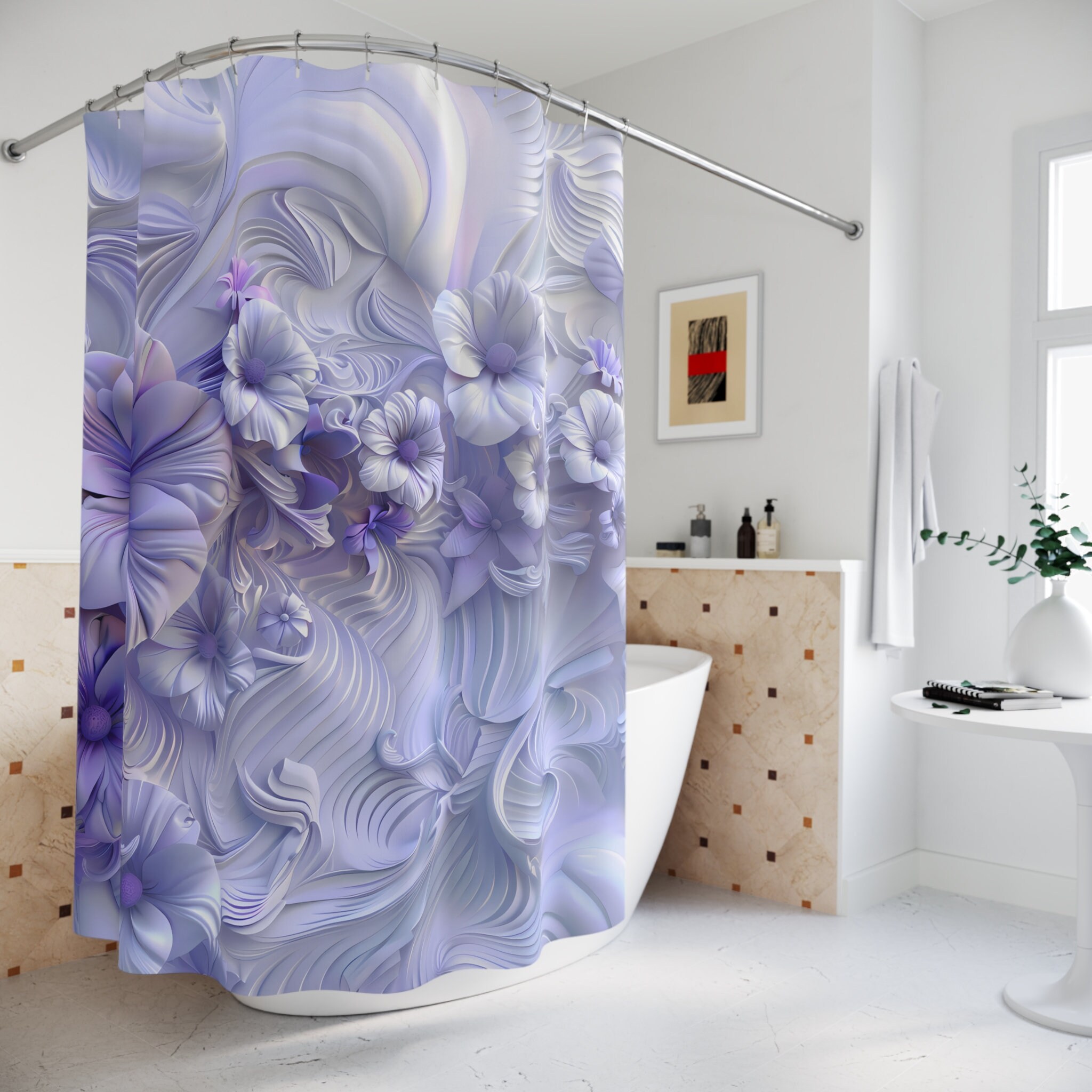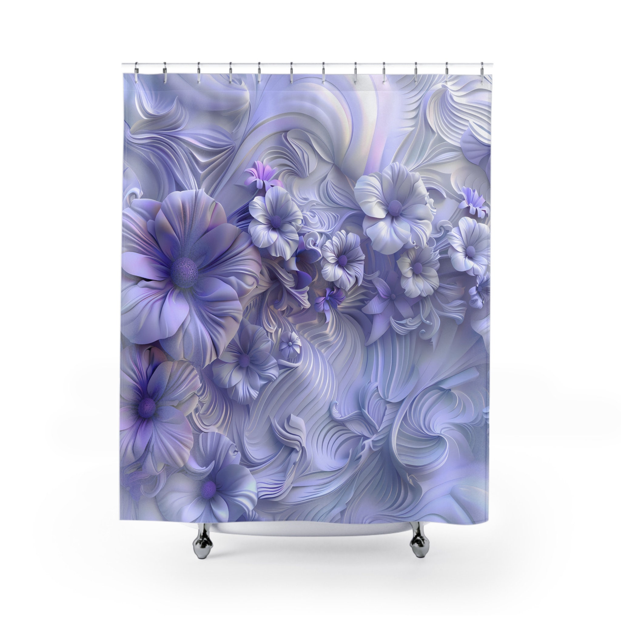 Transform your bathroom into a haven of enchantment with our "Lavender Blooms 3D-Look Floral Shower Curtain." Crafted to elevate your space with a touch of joy and serenity, our shower curtains are designed to make your showering experience truly delightful.