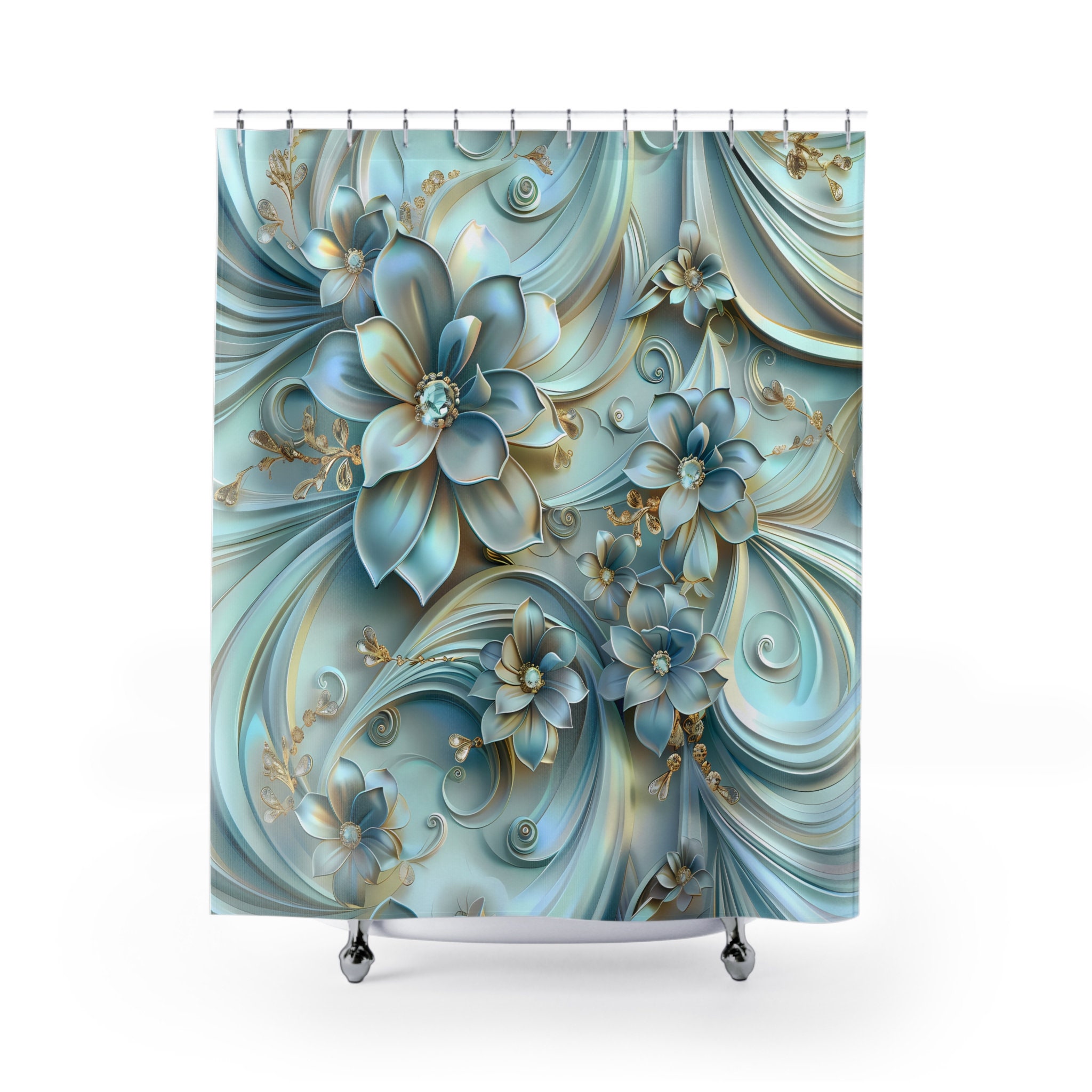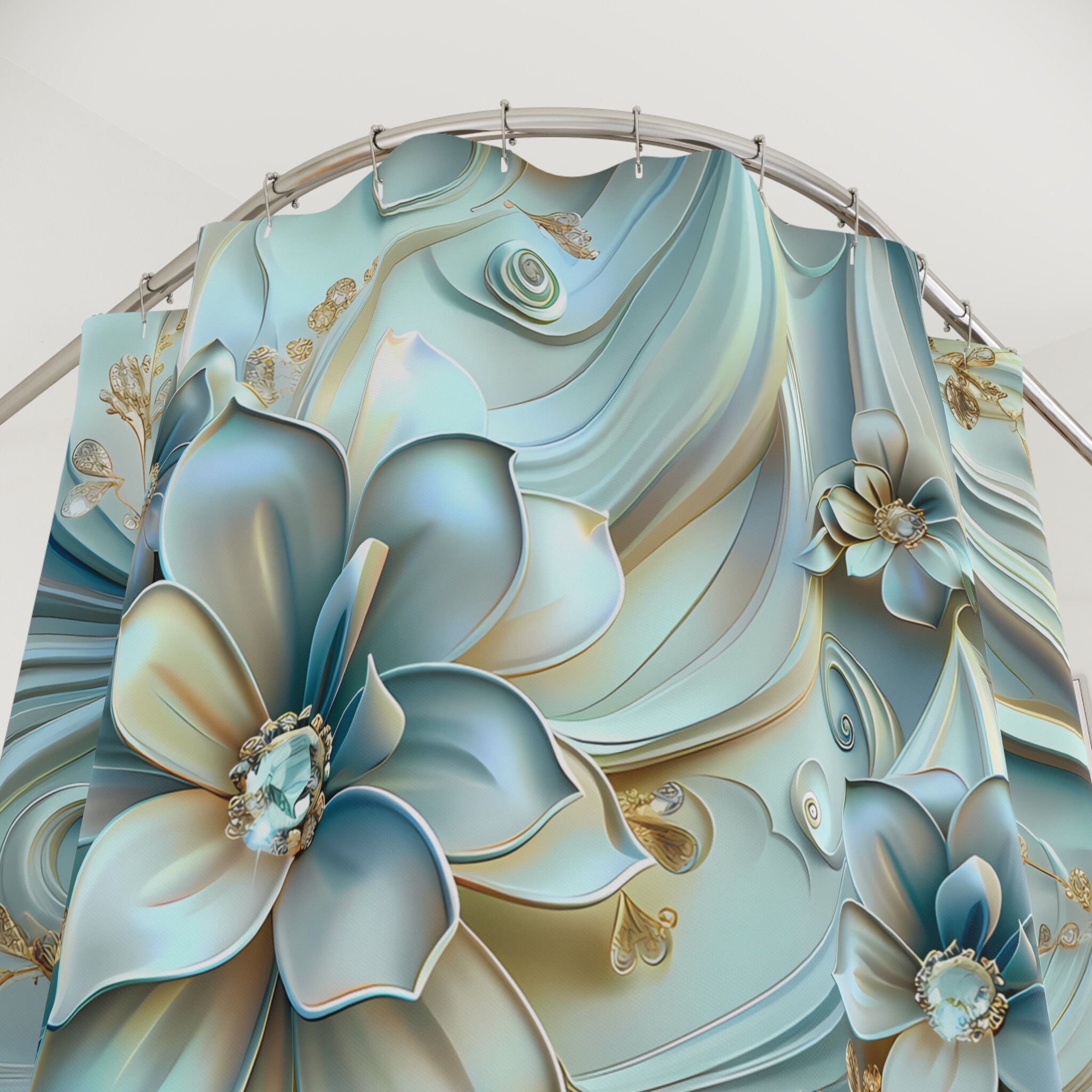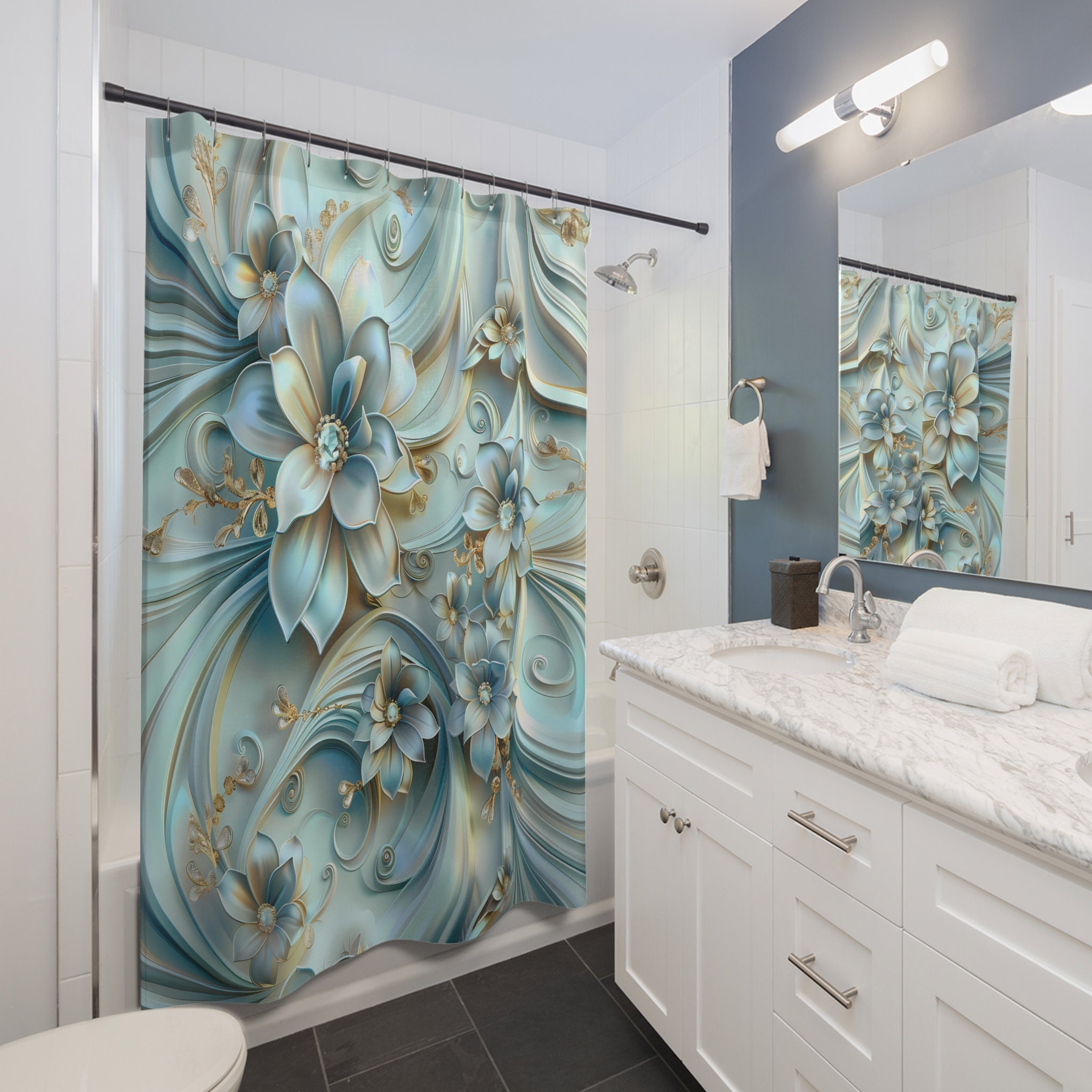 Tranquil Blooms 3D Blue Flower Shower Curtain." Crafted to elevate your space with a touch of joy and serenity, our shower curtains are designed to make your showering experience truly delightful.