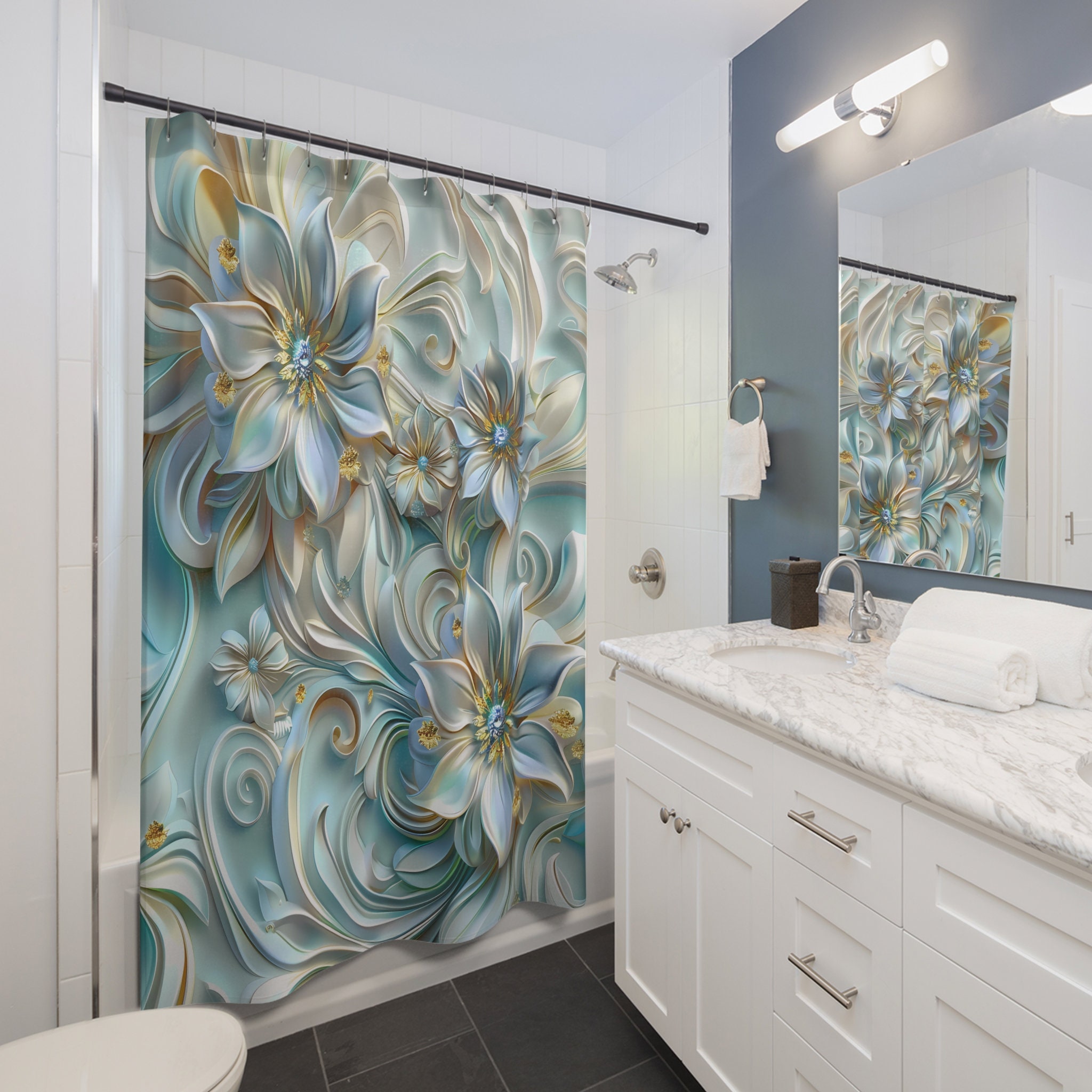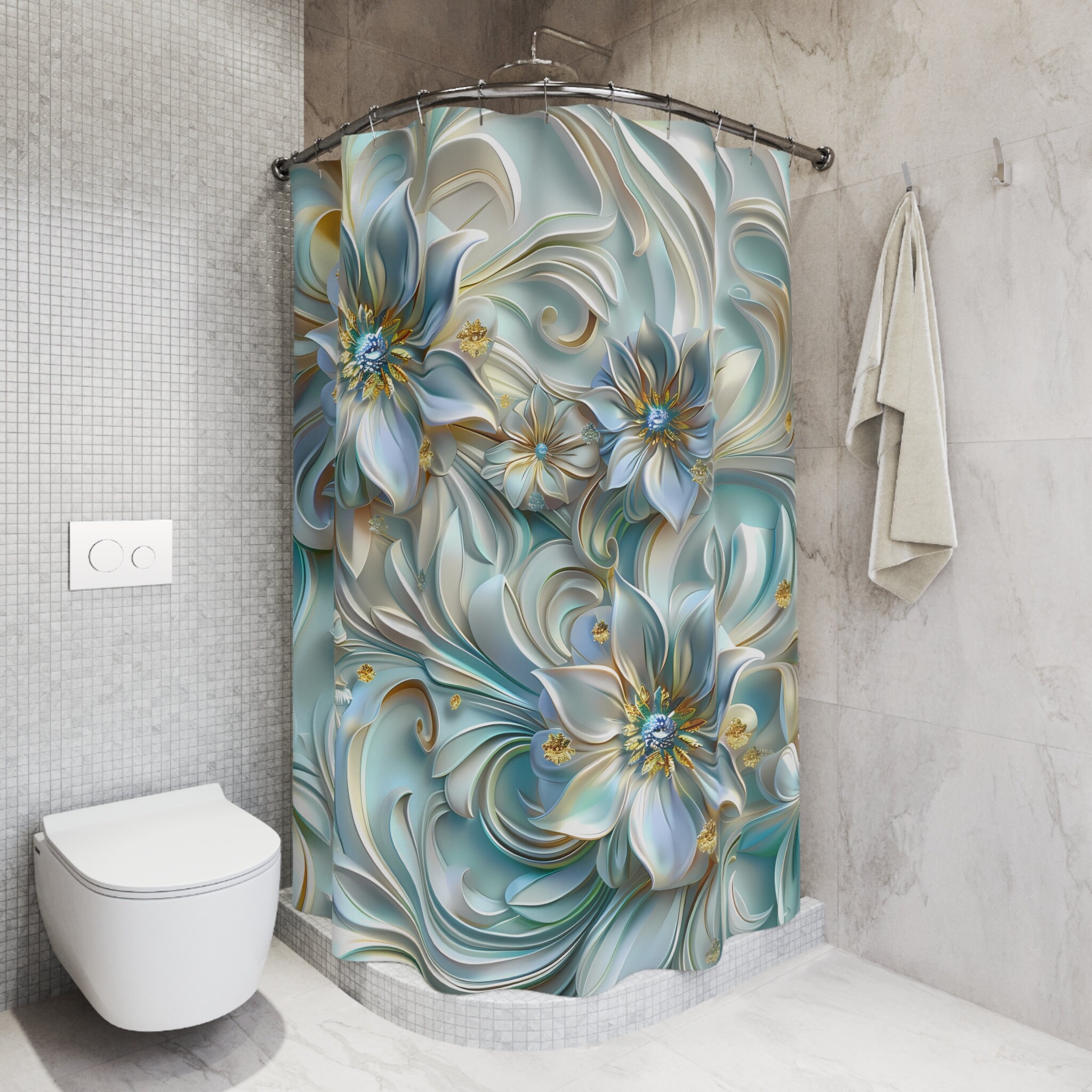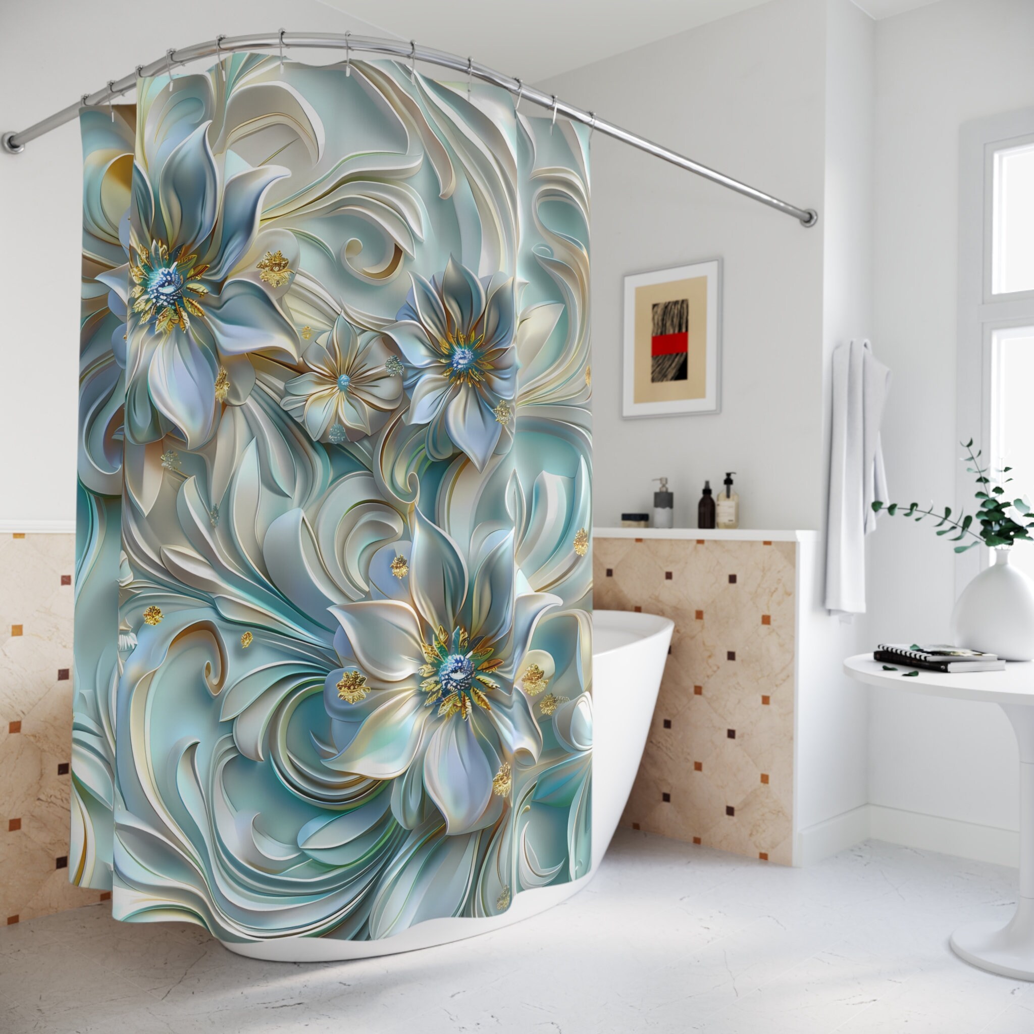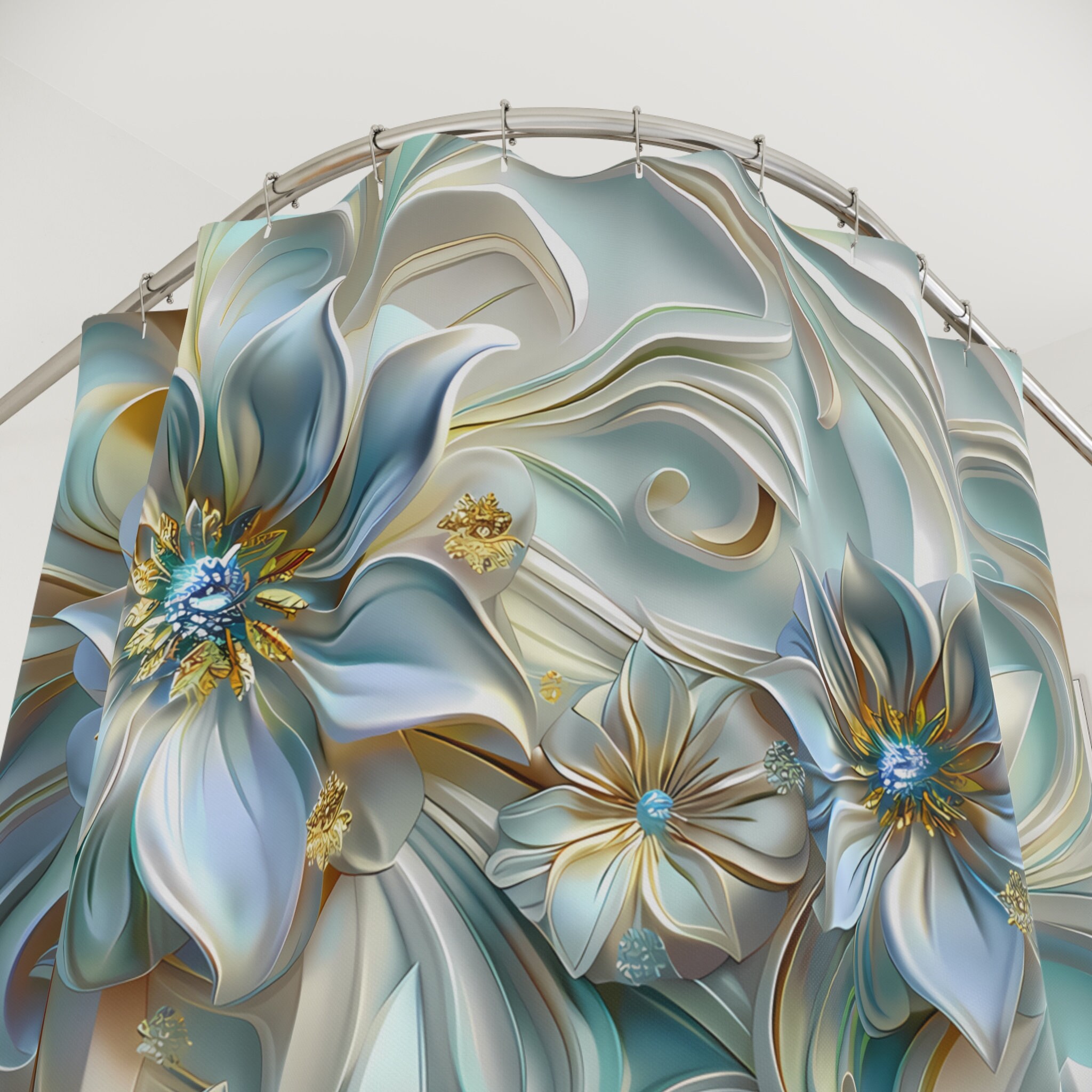 Floral Oasis 3D Light Blue Flower Shower Curtain." Crafted to elevate your space with a touch of joy and serenity, our shower curtains are designed to make your showering experience truly delightful.