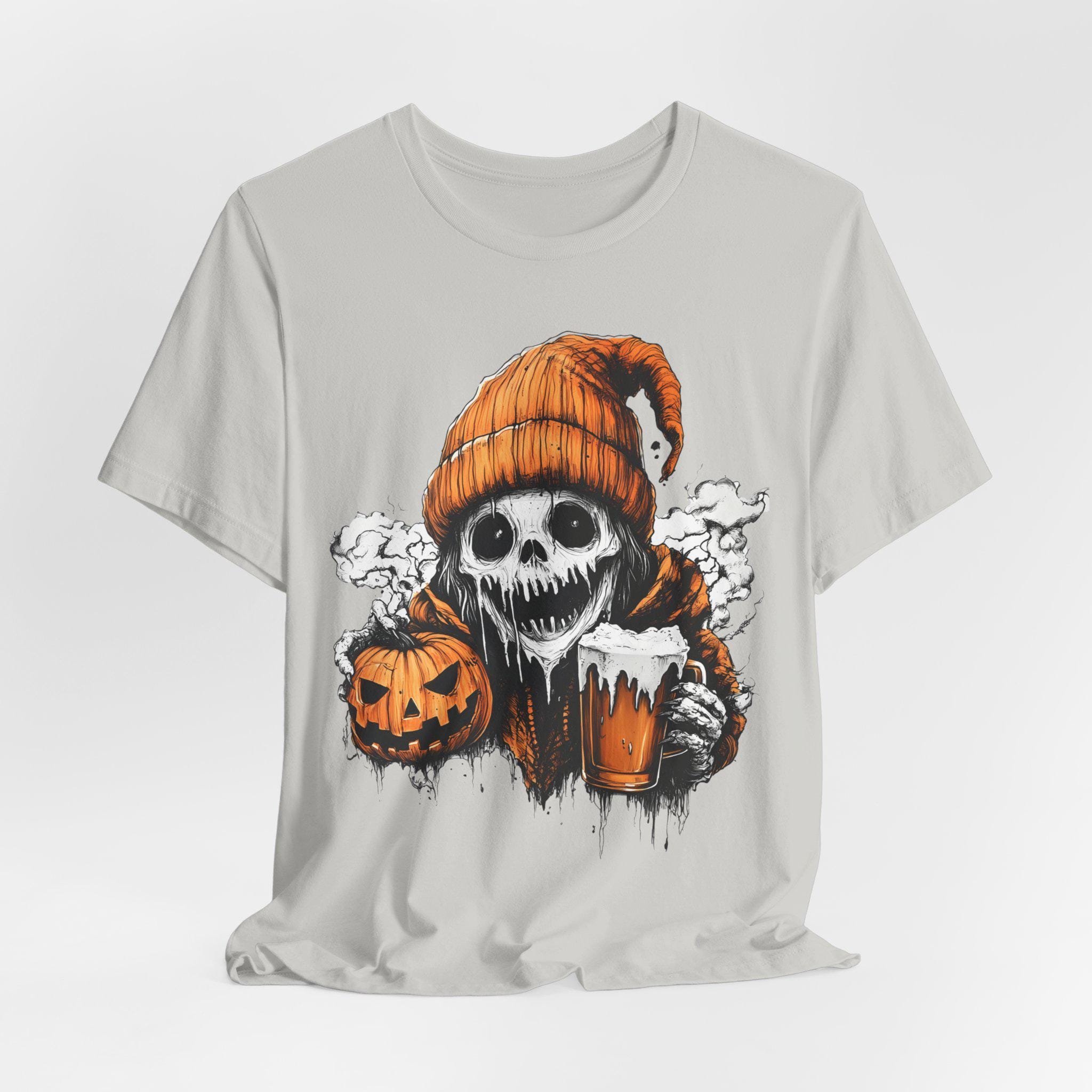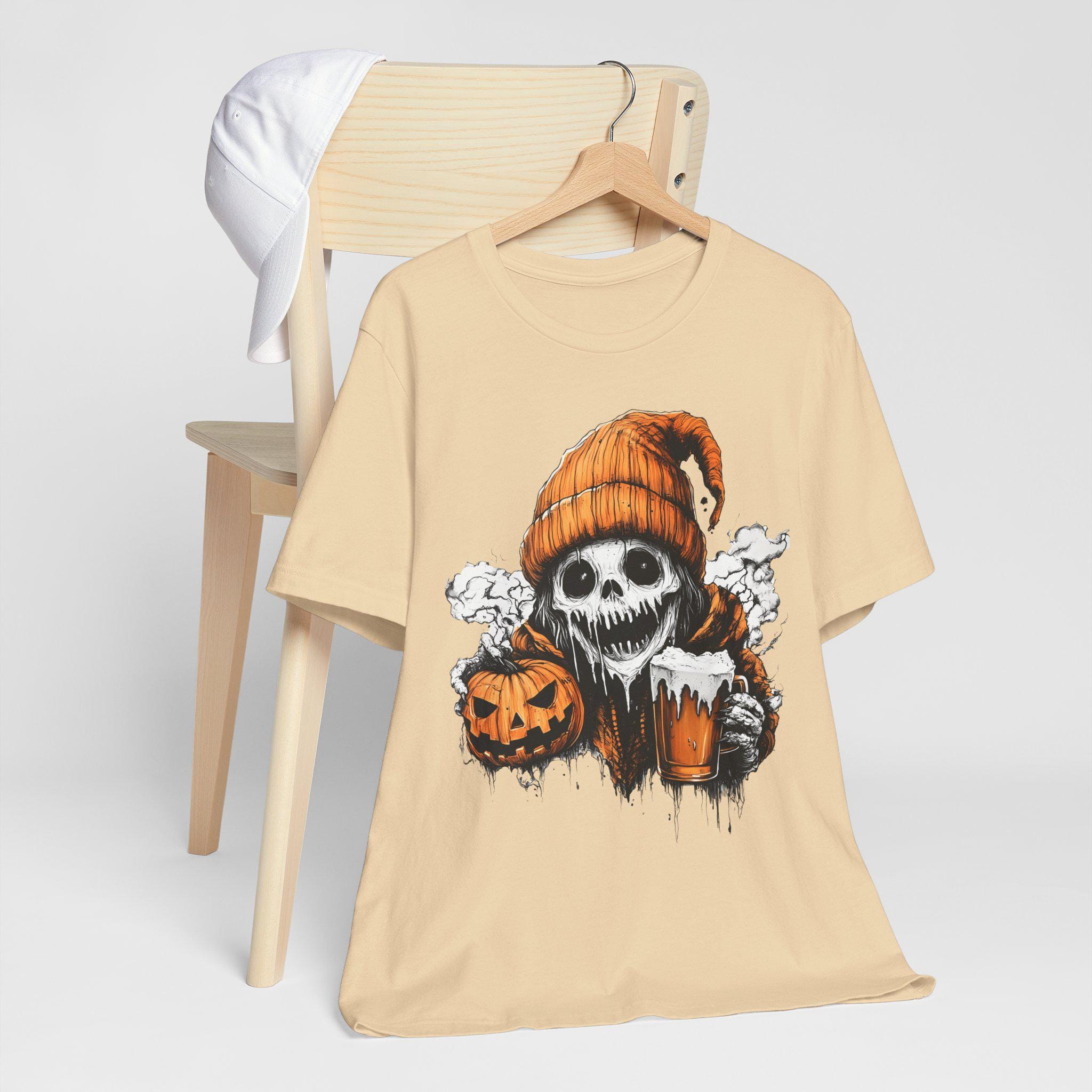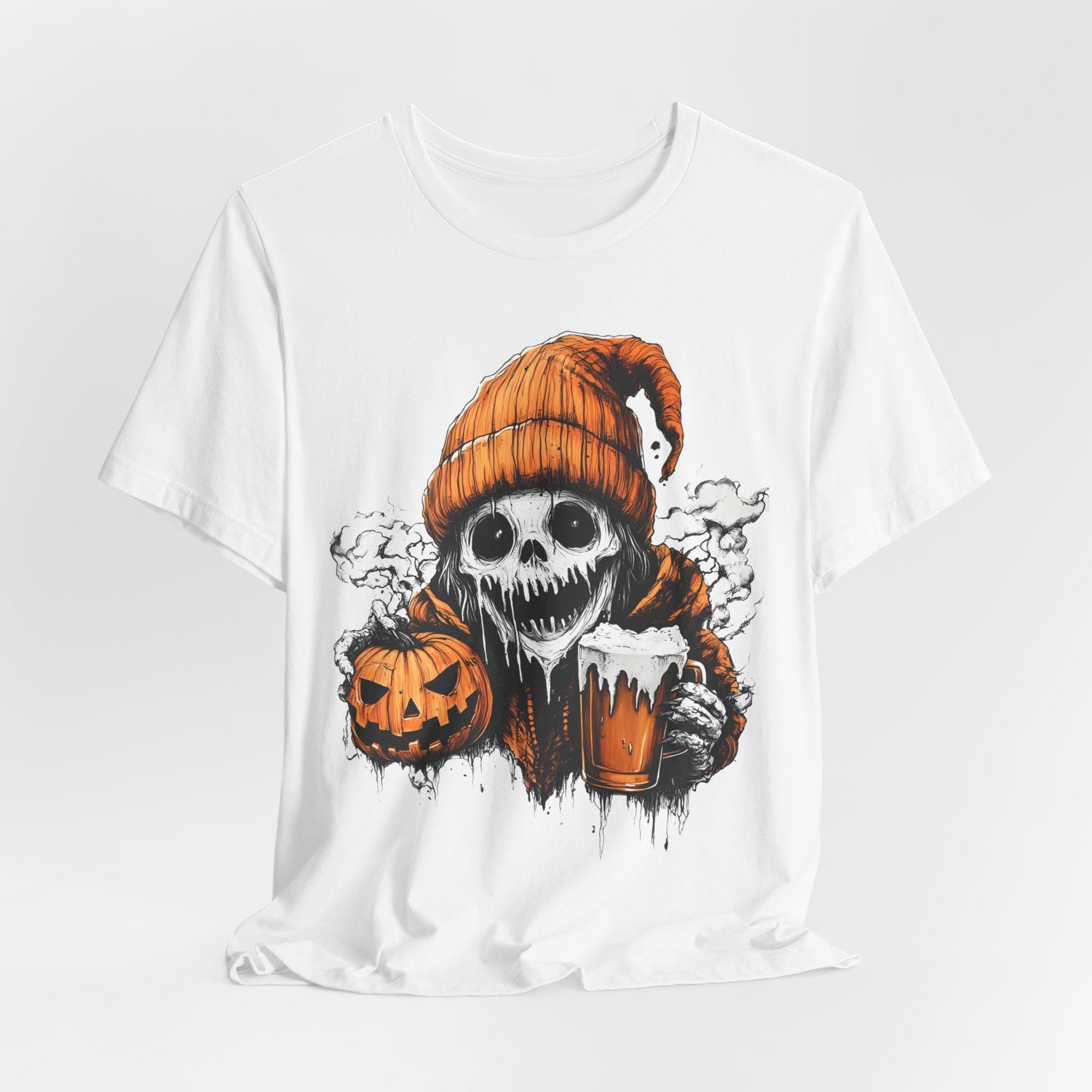 Spooky ghost holding a pumpkin and beer mug design T-shirts, perfect for Halloween enthusiasts. Gives off a fun and festive vibe, great for casual wear during Halloween celebrations. Suitable for both men and women.