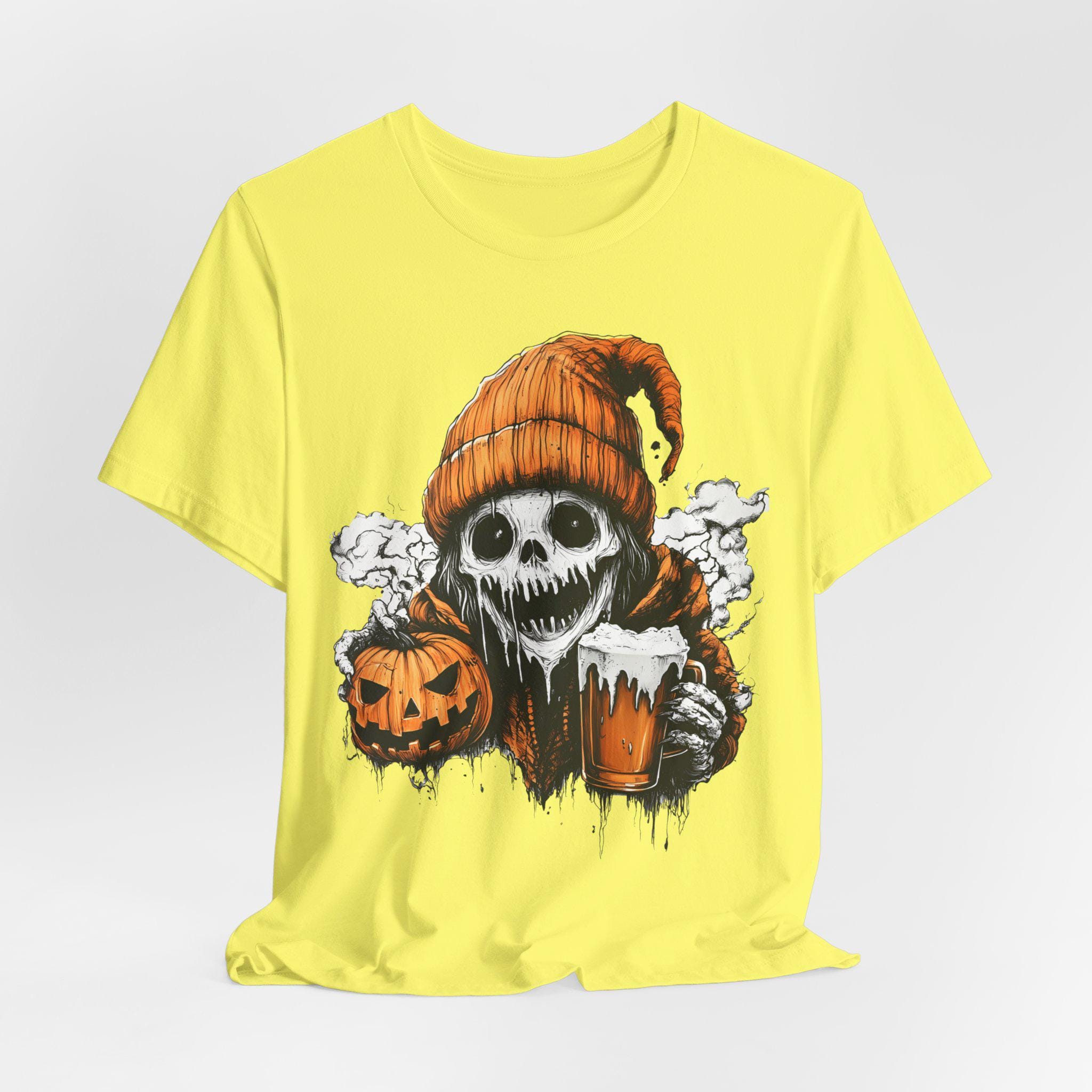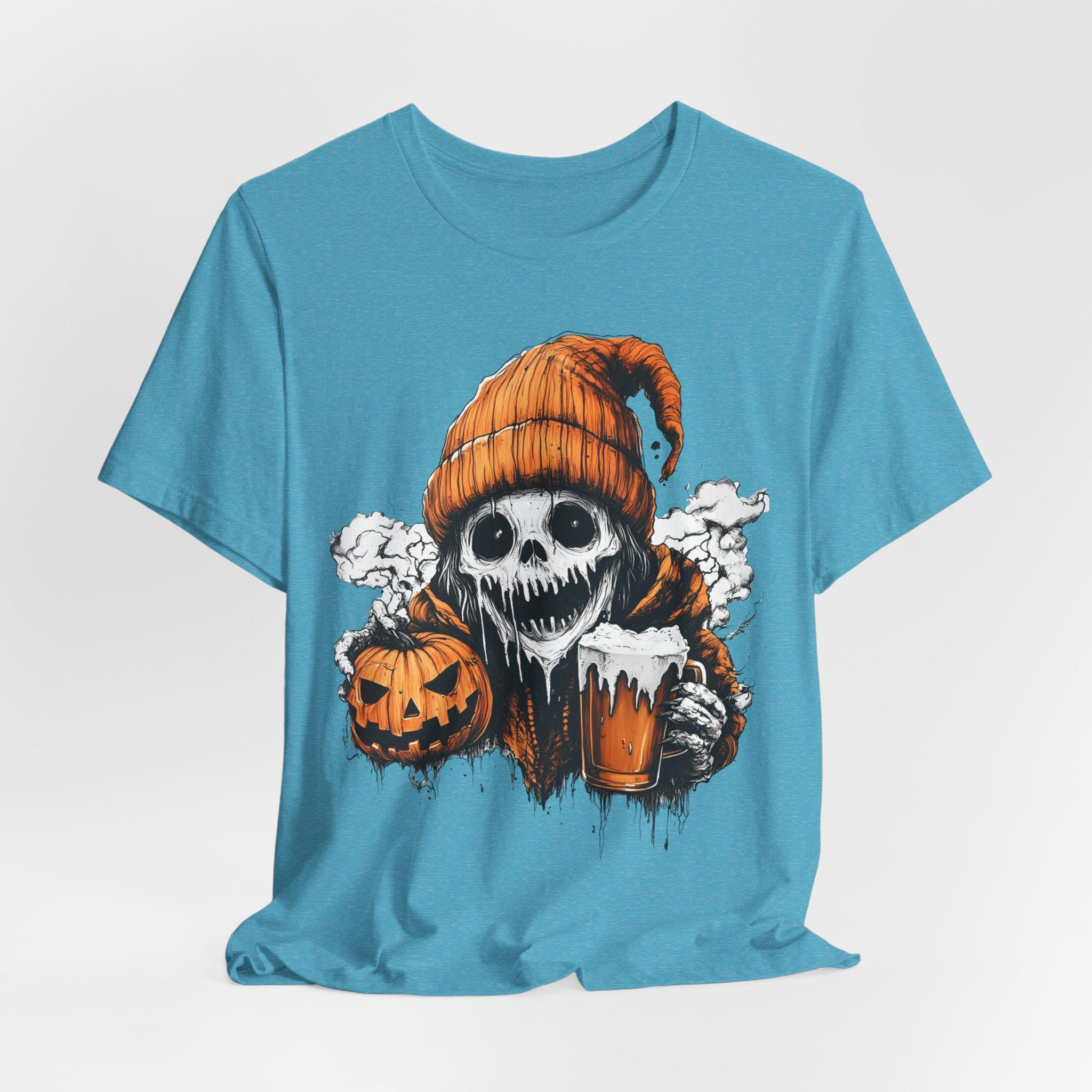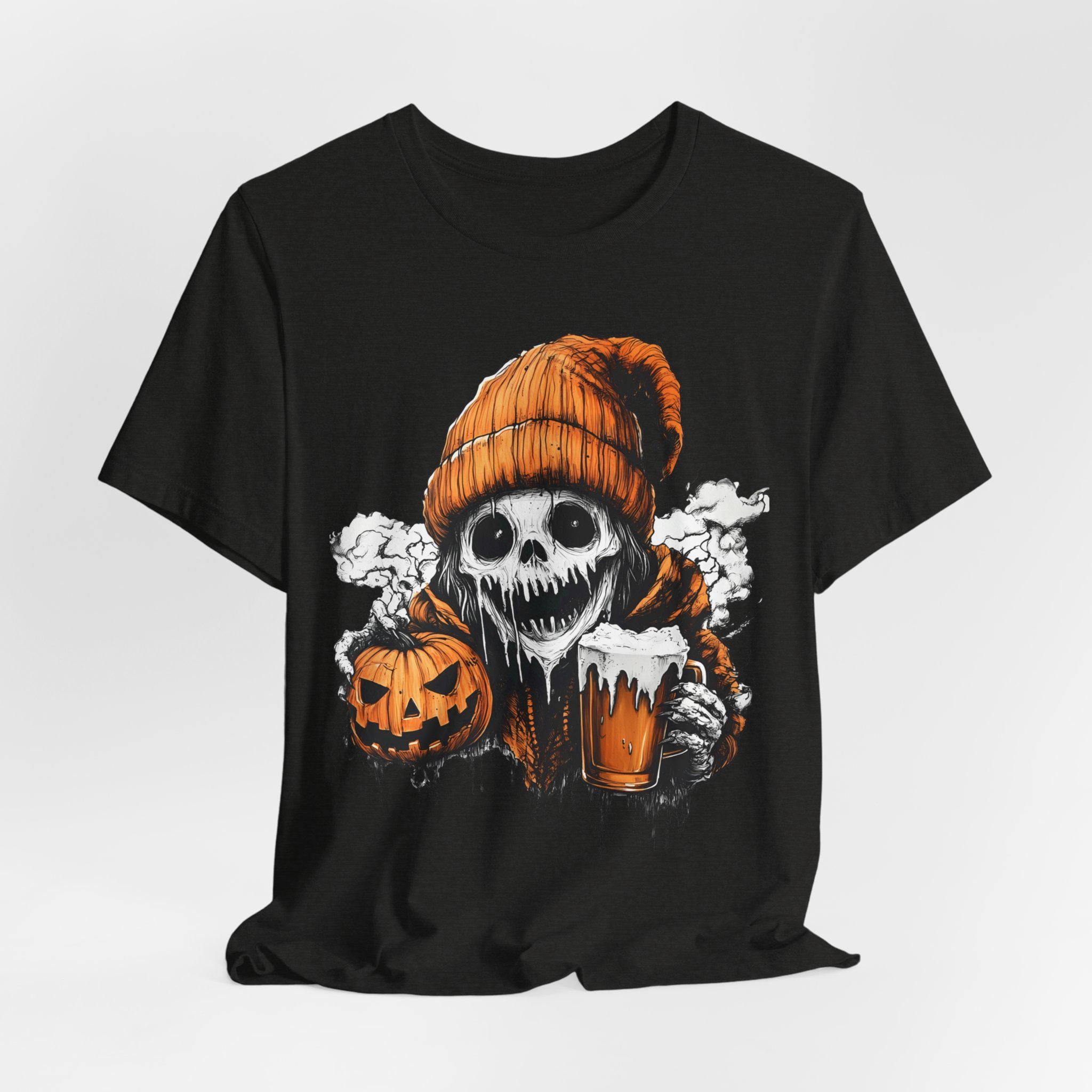 Spooky ghost holding a pumpkin and beer mug design T-shirts, perfect for Halloween enthusiasts. Gives off a fun and festive vibe, great for casual wear during Halloween celebrations. Suitable for both men and women.