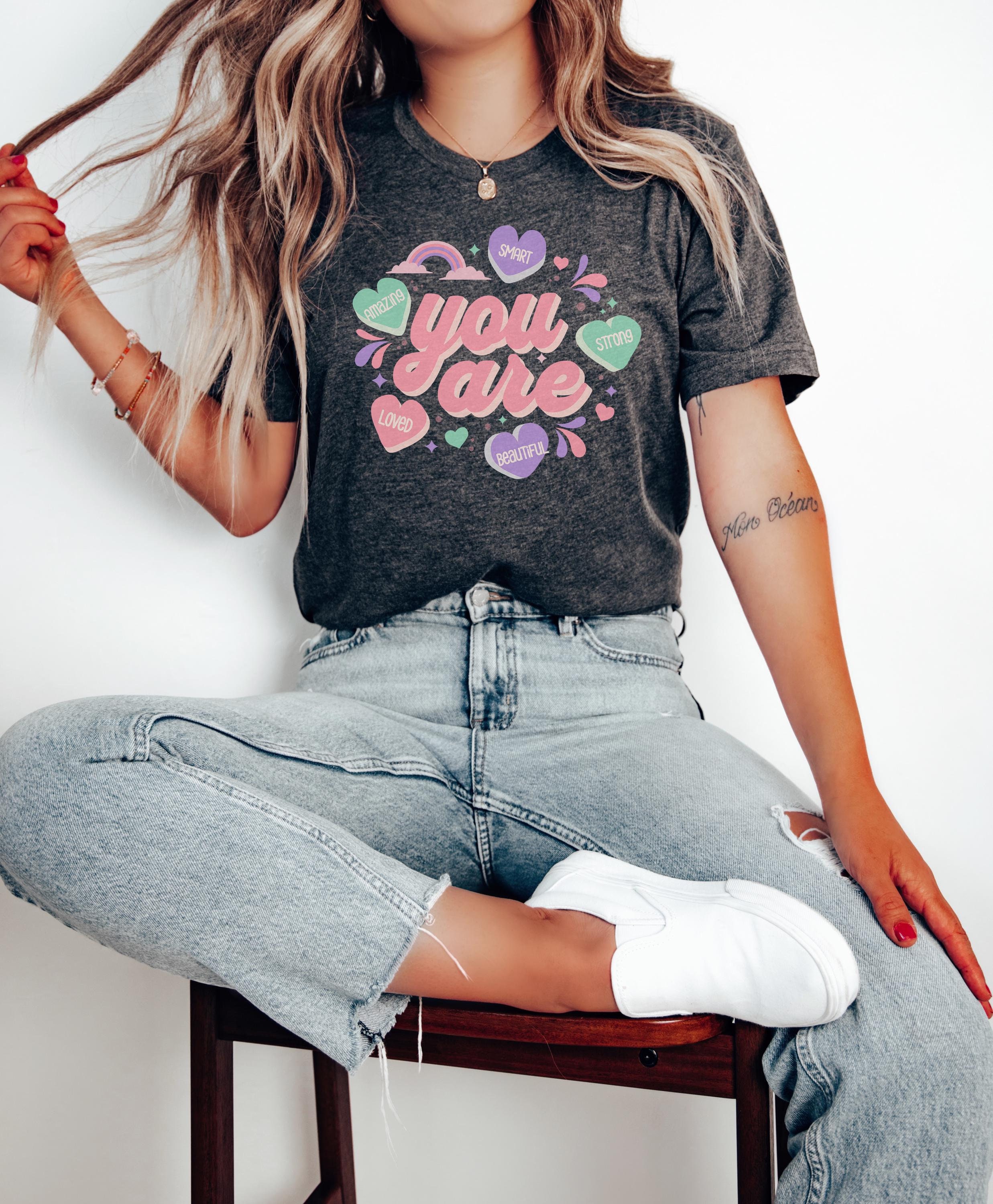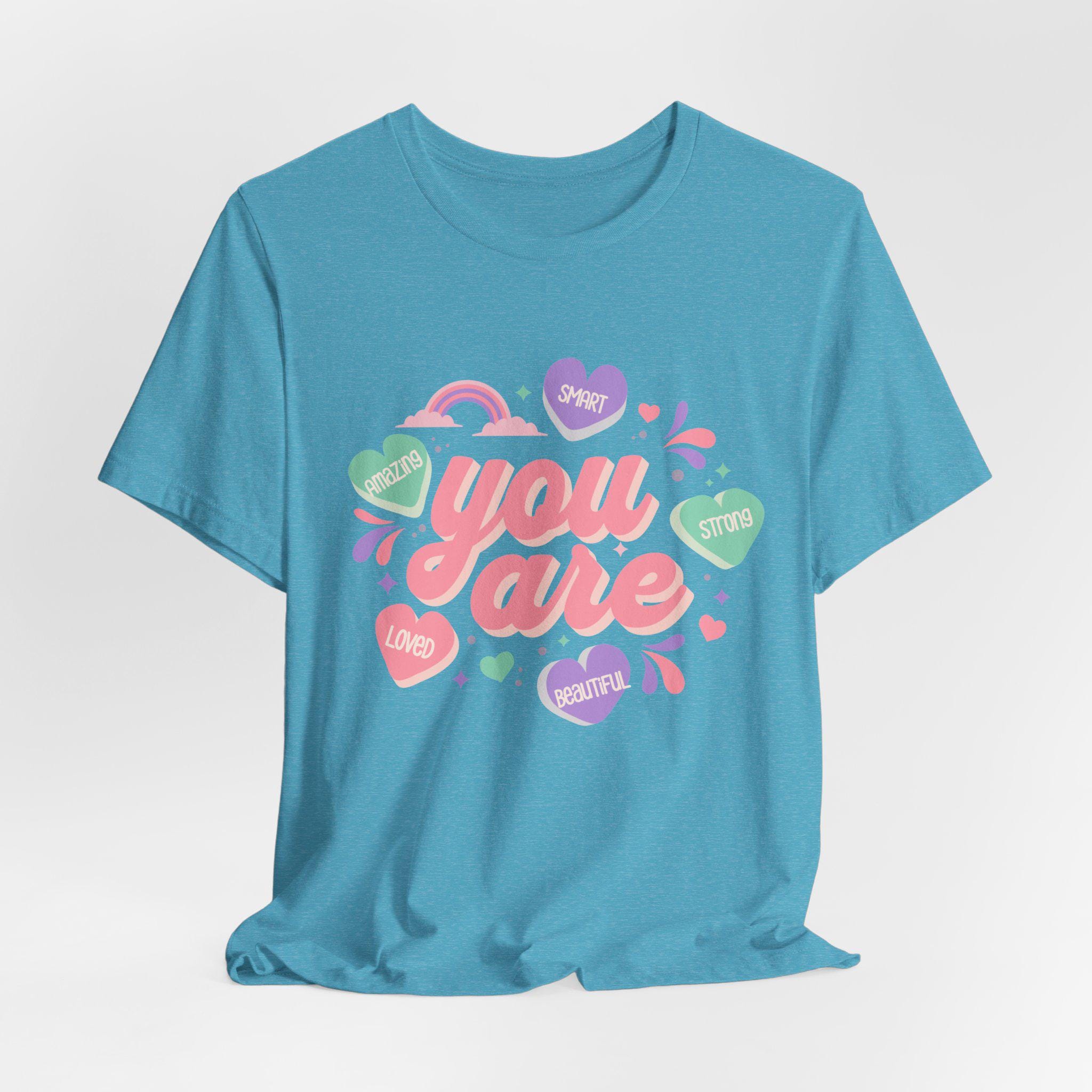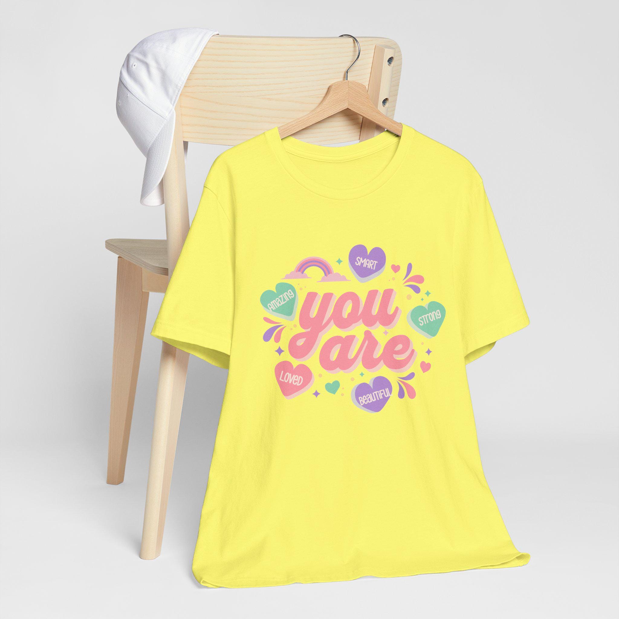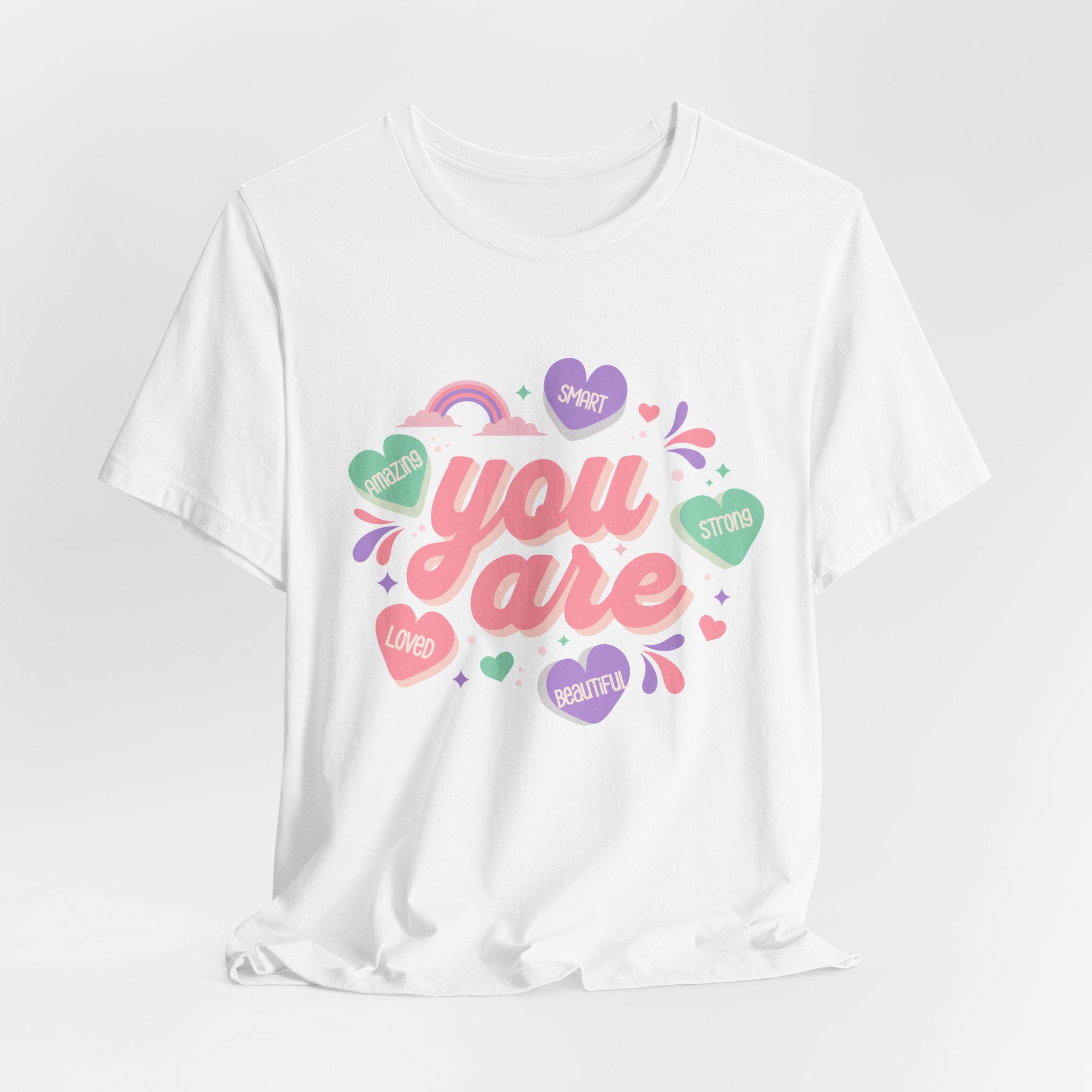 A graphic T-shirt with the message 'You Are Amazing Smart Strong Loved' surrounded by hearts and words of positivity. This T-shirt exudes positivity and is perfect for daily wear to spread a message of self-love and empowerment. Ideal for those who value positive affirmations and want to make a statement with their clothing.