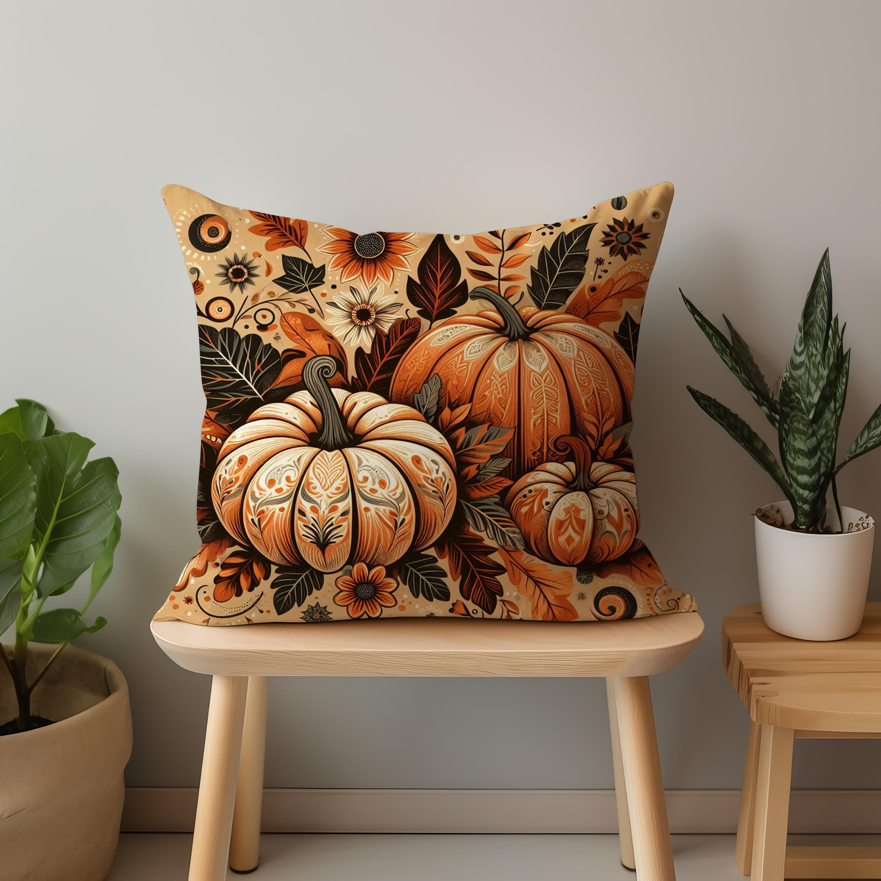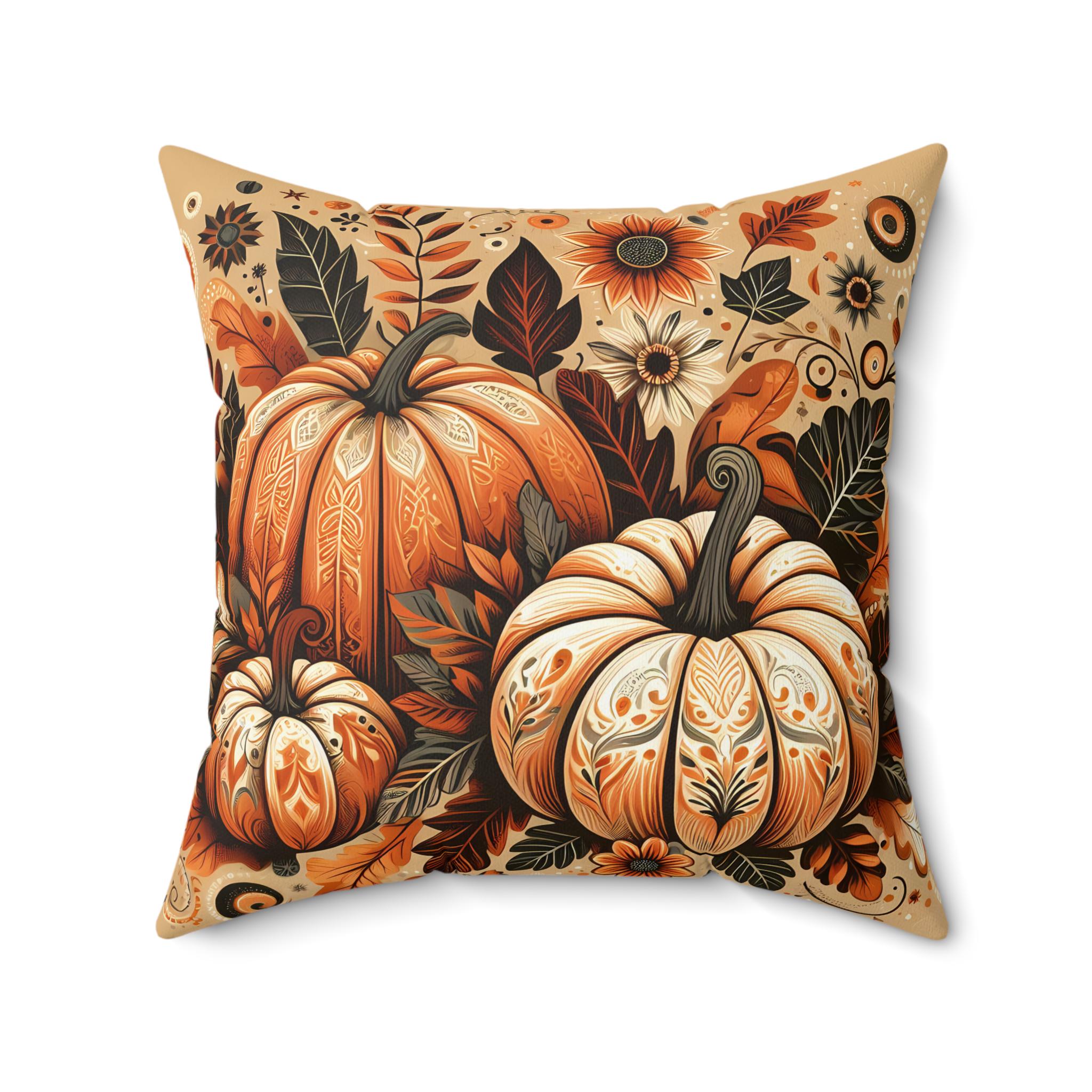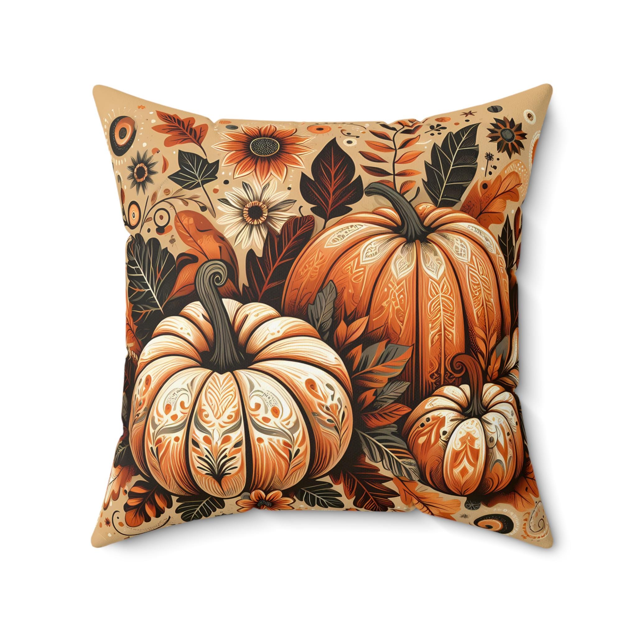 Autumn Harvest Pumpkin Floral Decorative Square Pillow – Fall Boho Chic Accent Cushion. This pillow gives off a cozy autumn vibe, perfect for adding a touch of boho chic to your fall decor. Ideal for those who love fall-themed decorations and want to create a warm and inviting atmosphere in their home. Relevant for Thanksgiving, Halloween, and general fall decor.