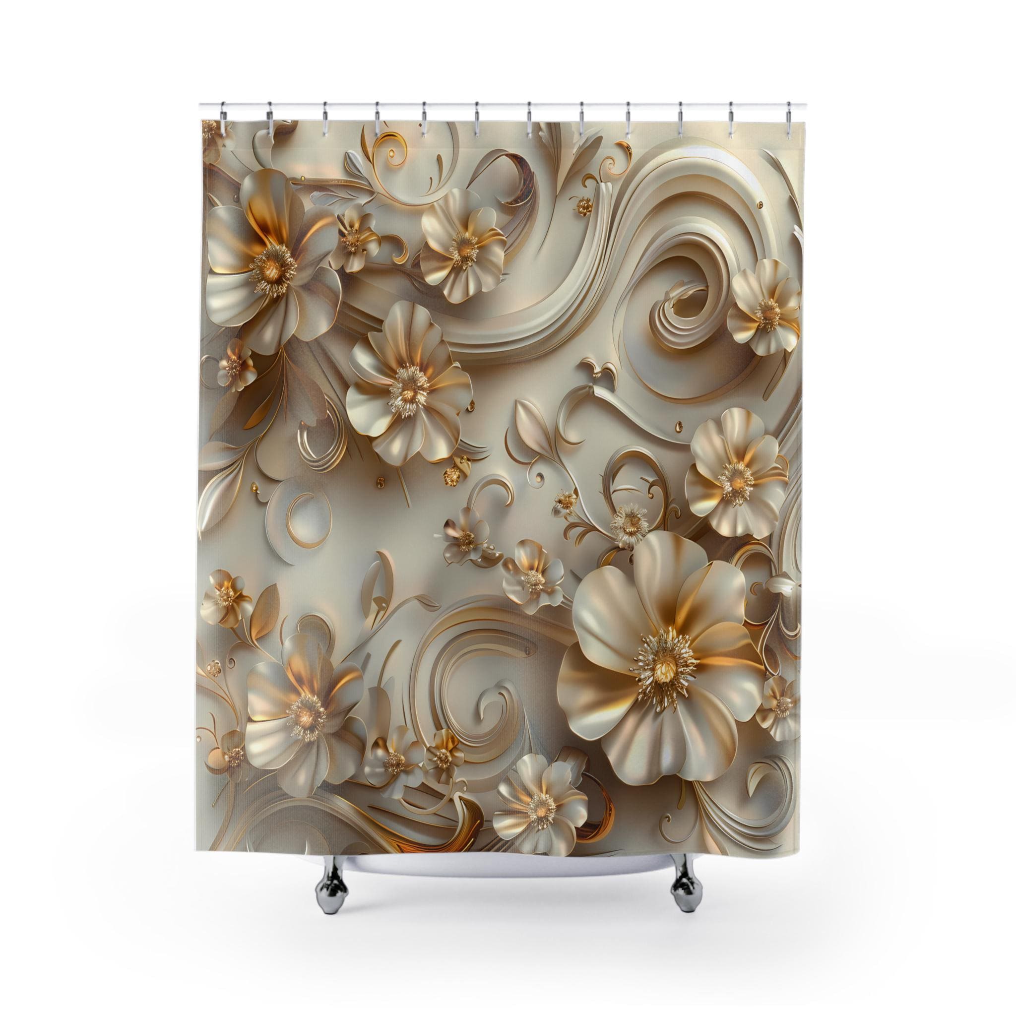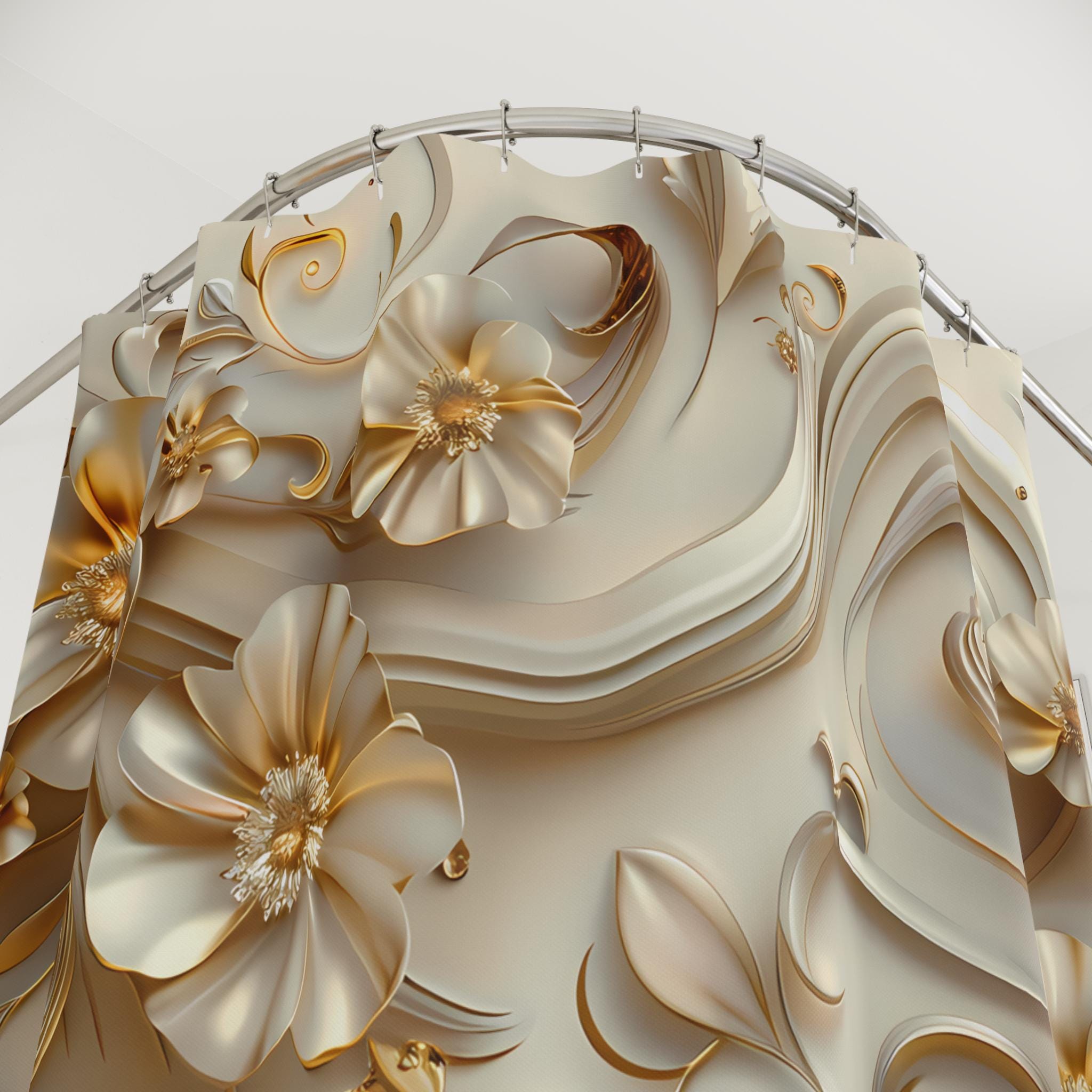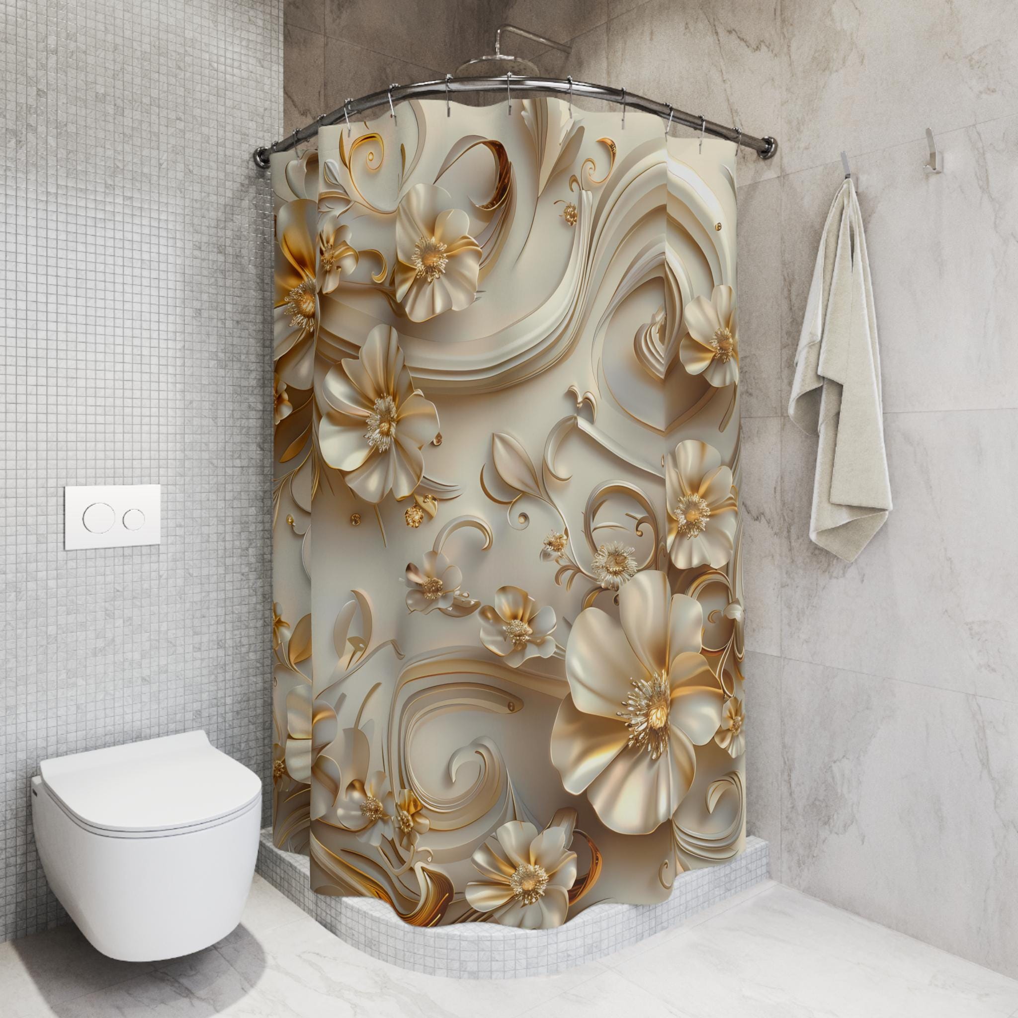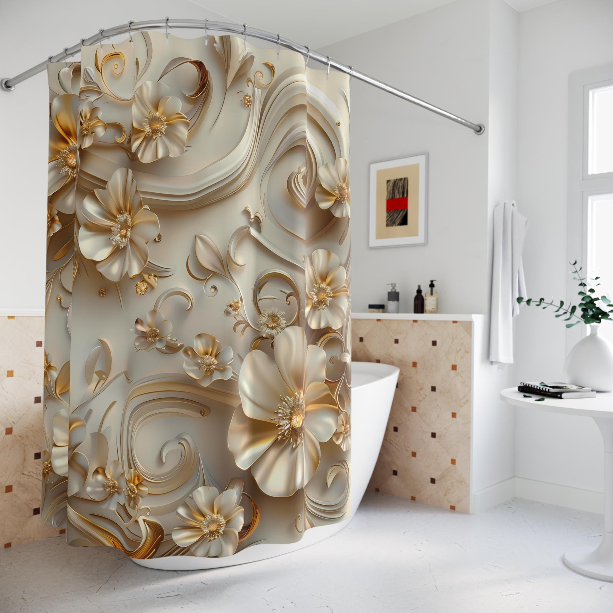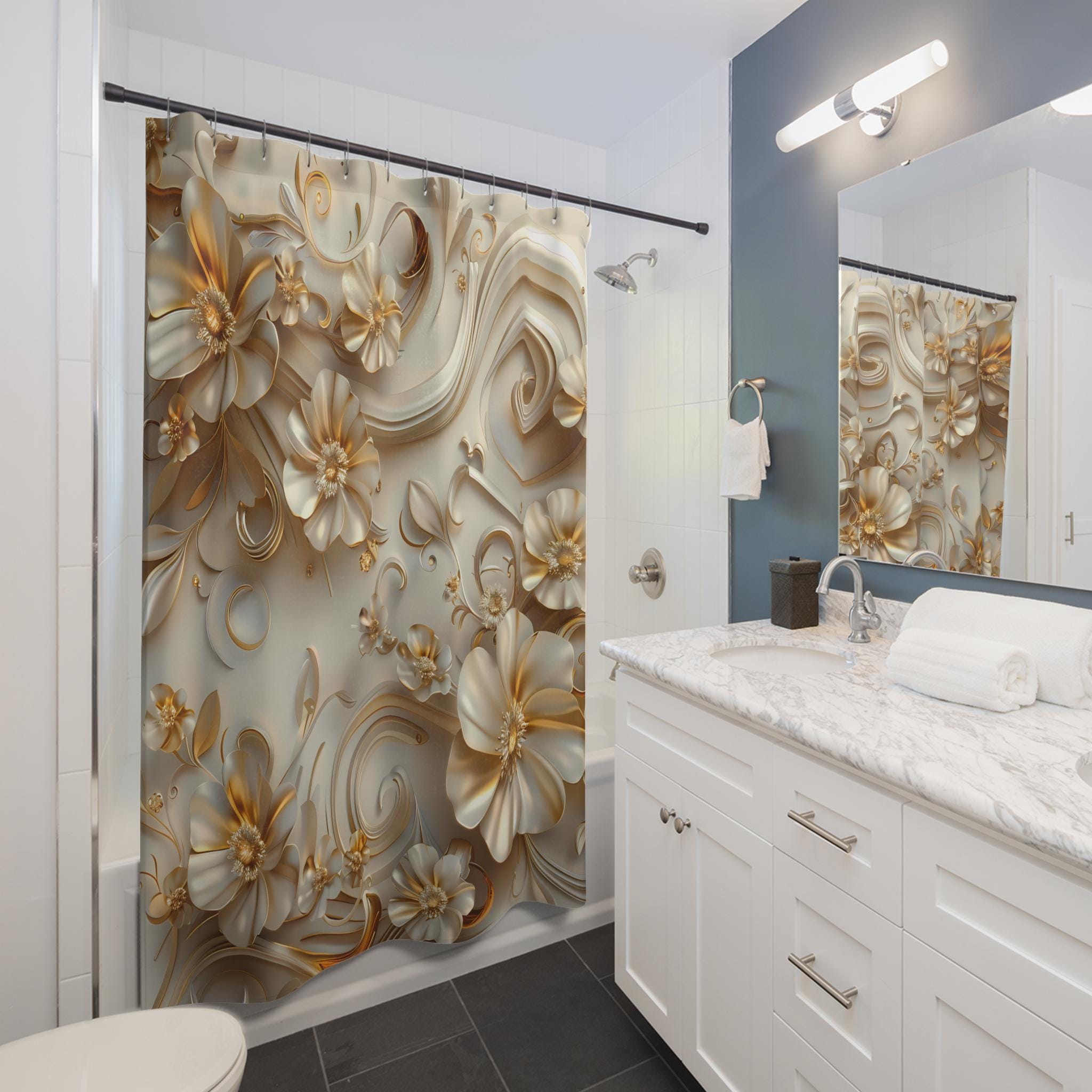 The Golden Elegance Floral Shower Curtain exudes luxury and sophistication, adding a touch of elegance to any bathroom decor. Perfect for those who appreciate floral designs and want to elevate their bathroom ambiance. Ideal for weddings, bridal showers, housewarmings, and special occasions.