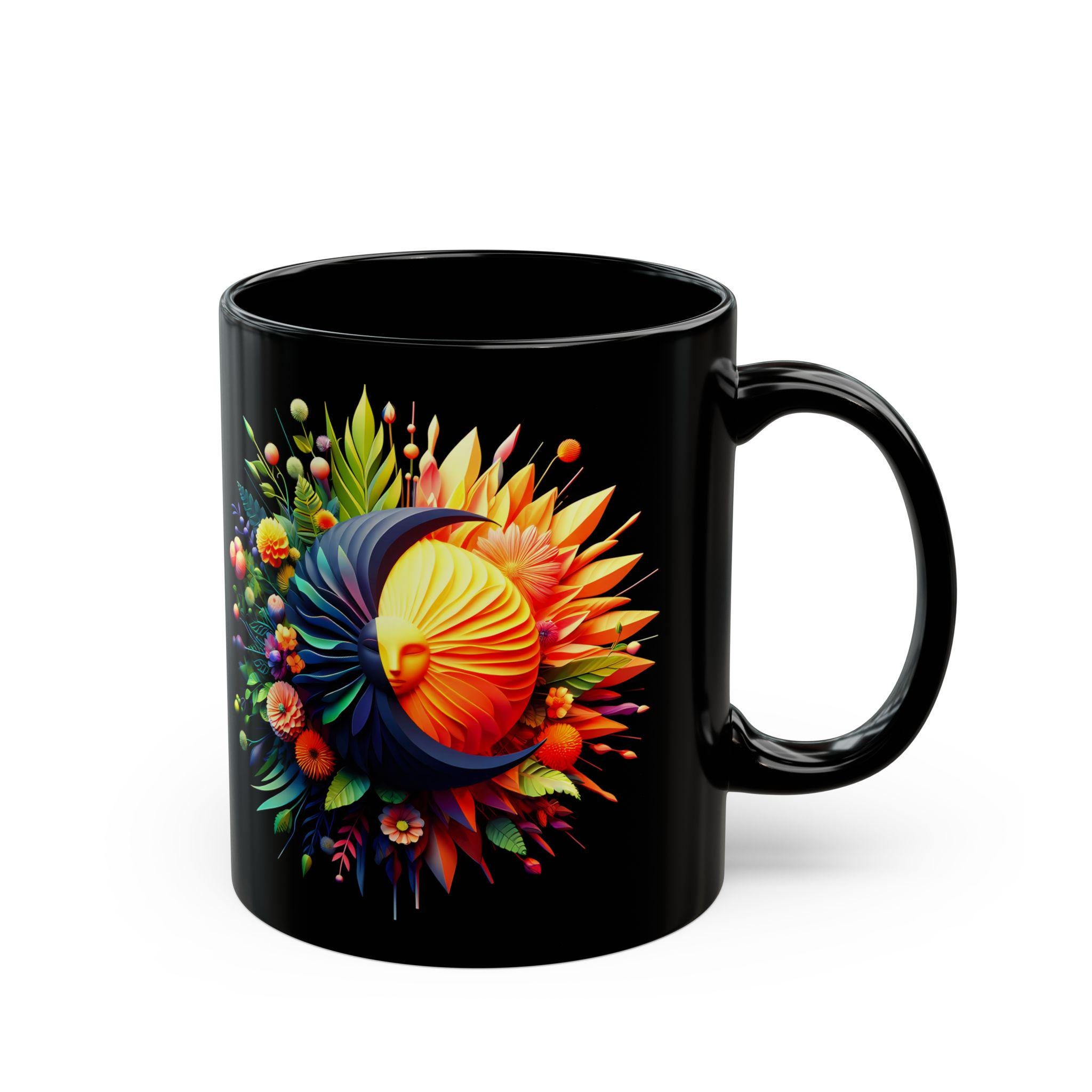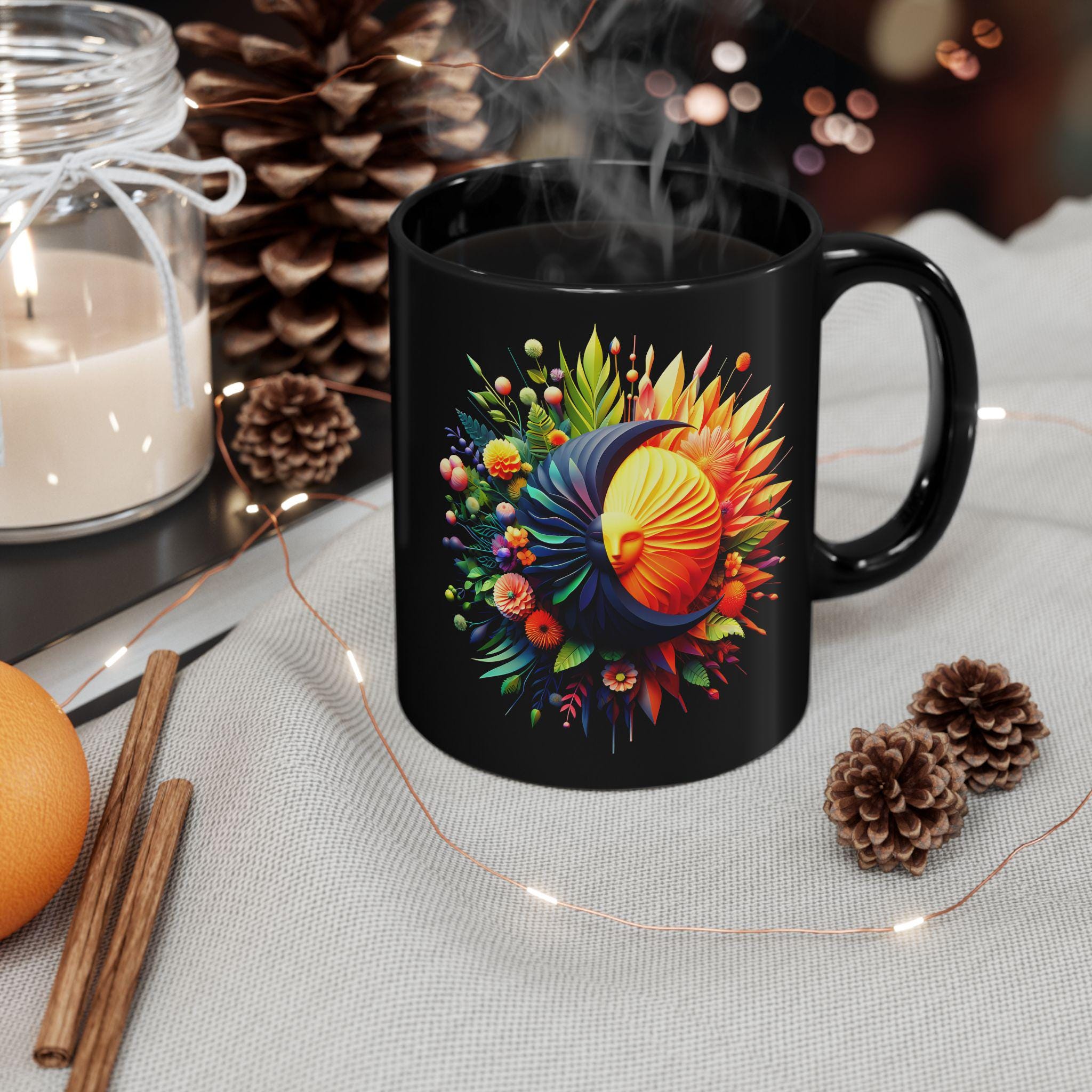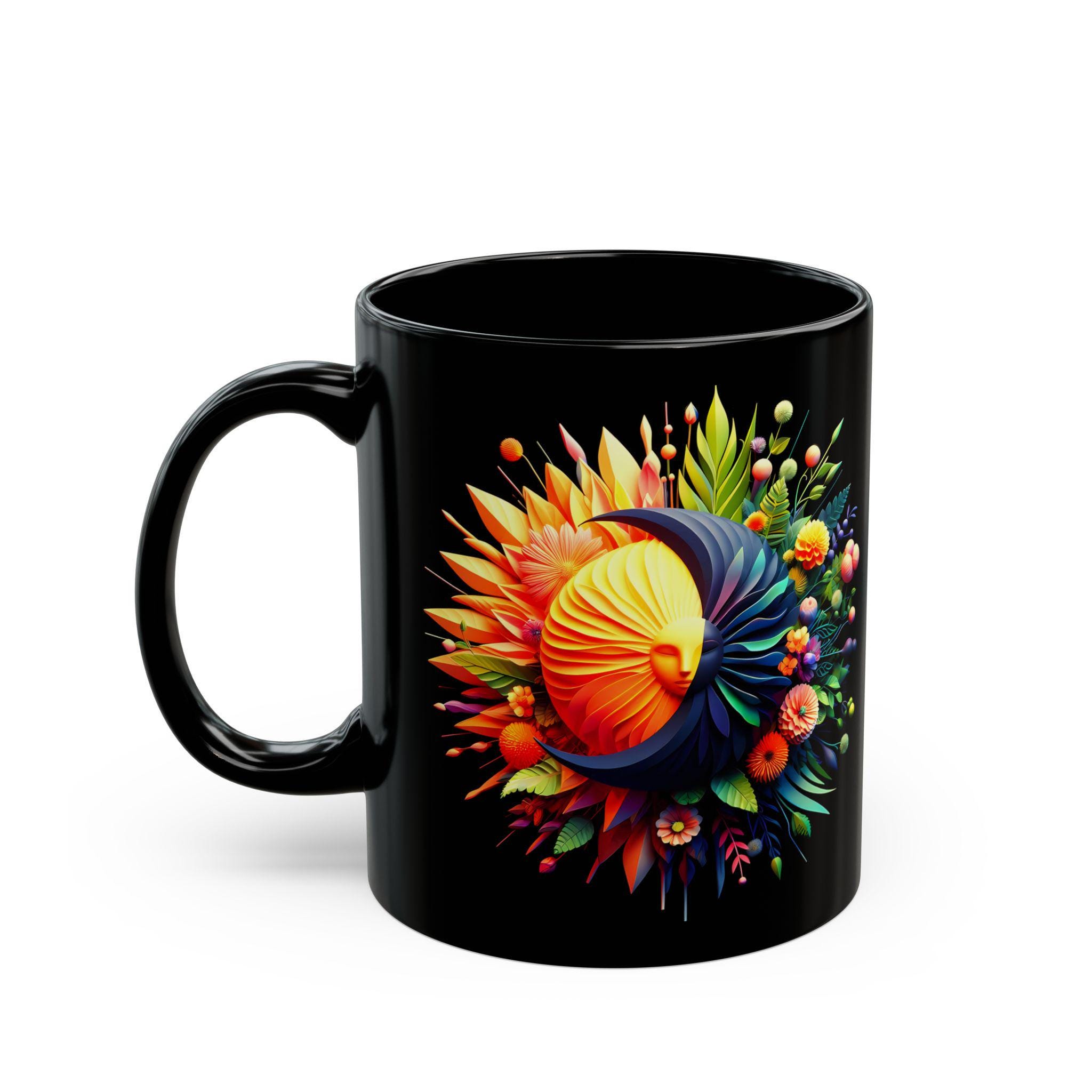 This Celestial Bloom Mug features a harmonious design of the sun and moon with vibrant floral accents. Perfect for those who appreciate celestial themes and nature-inspired artwork.