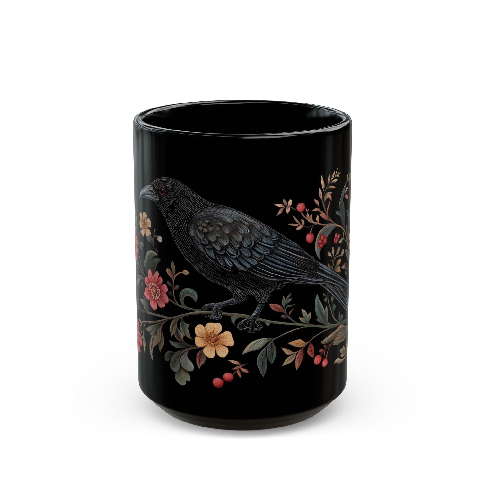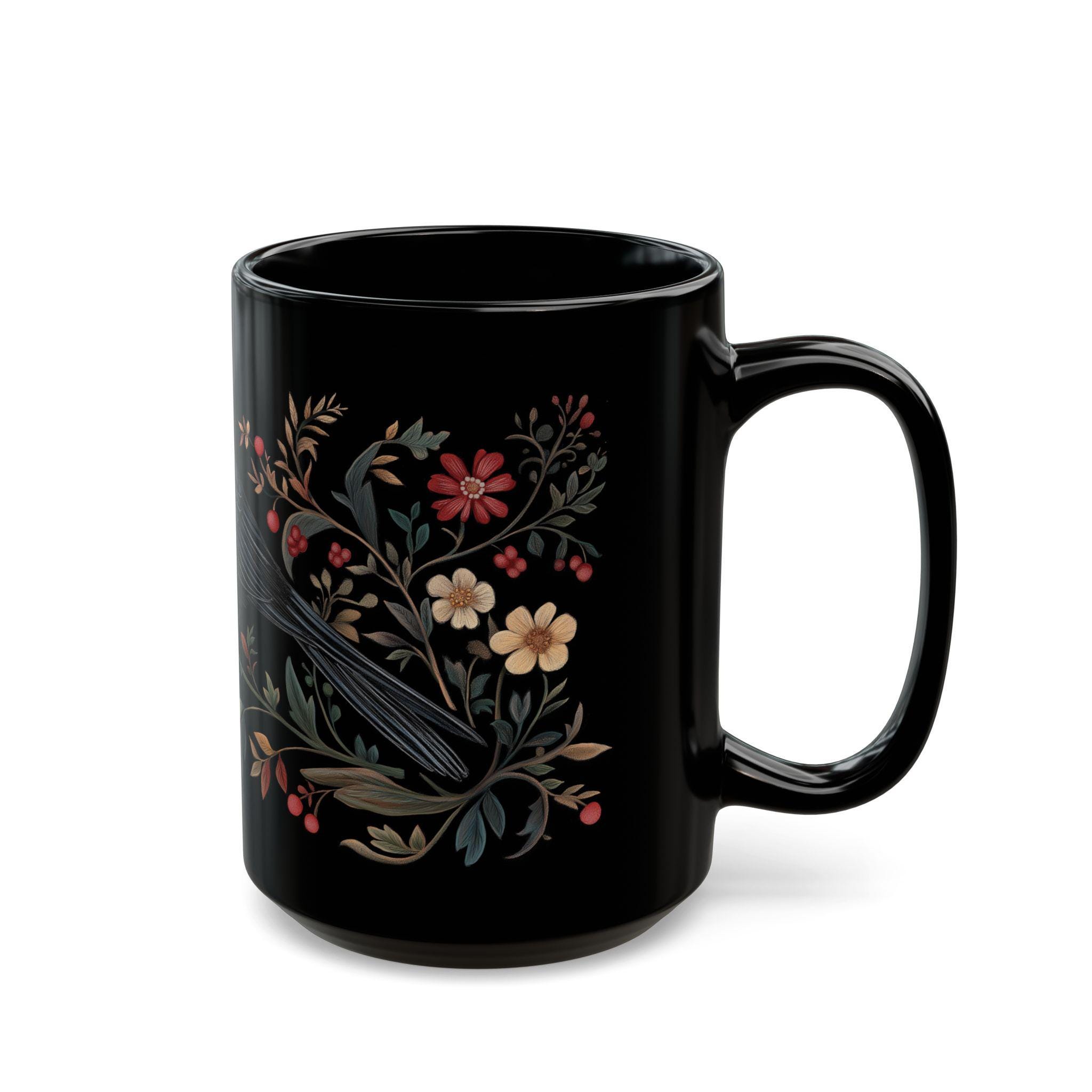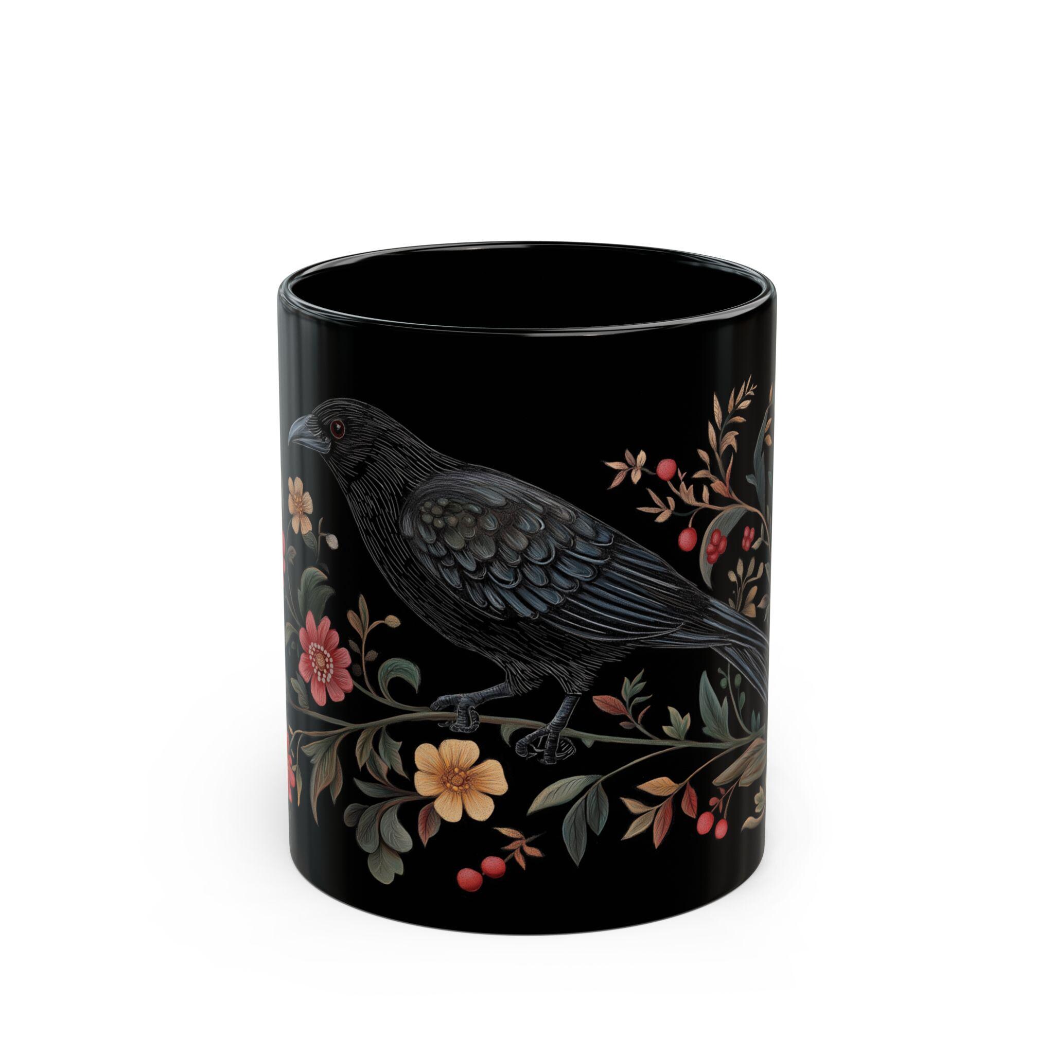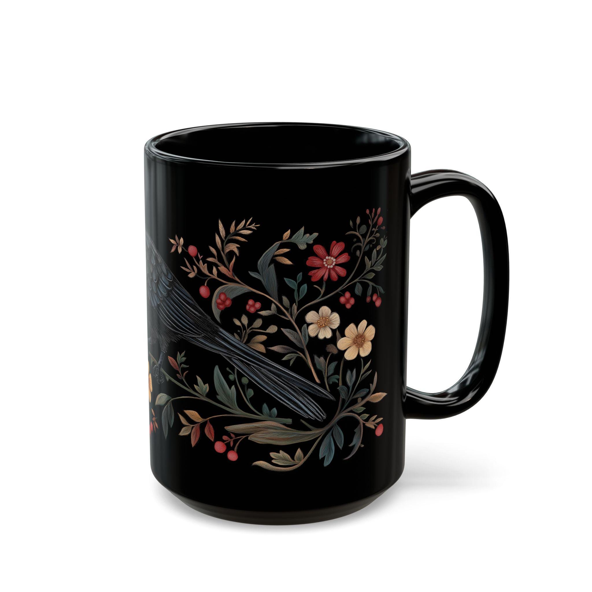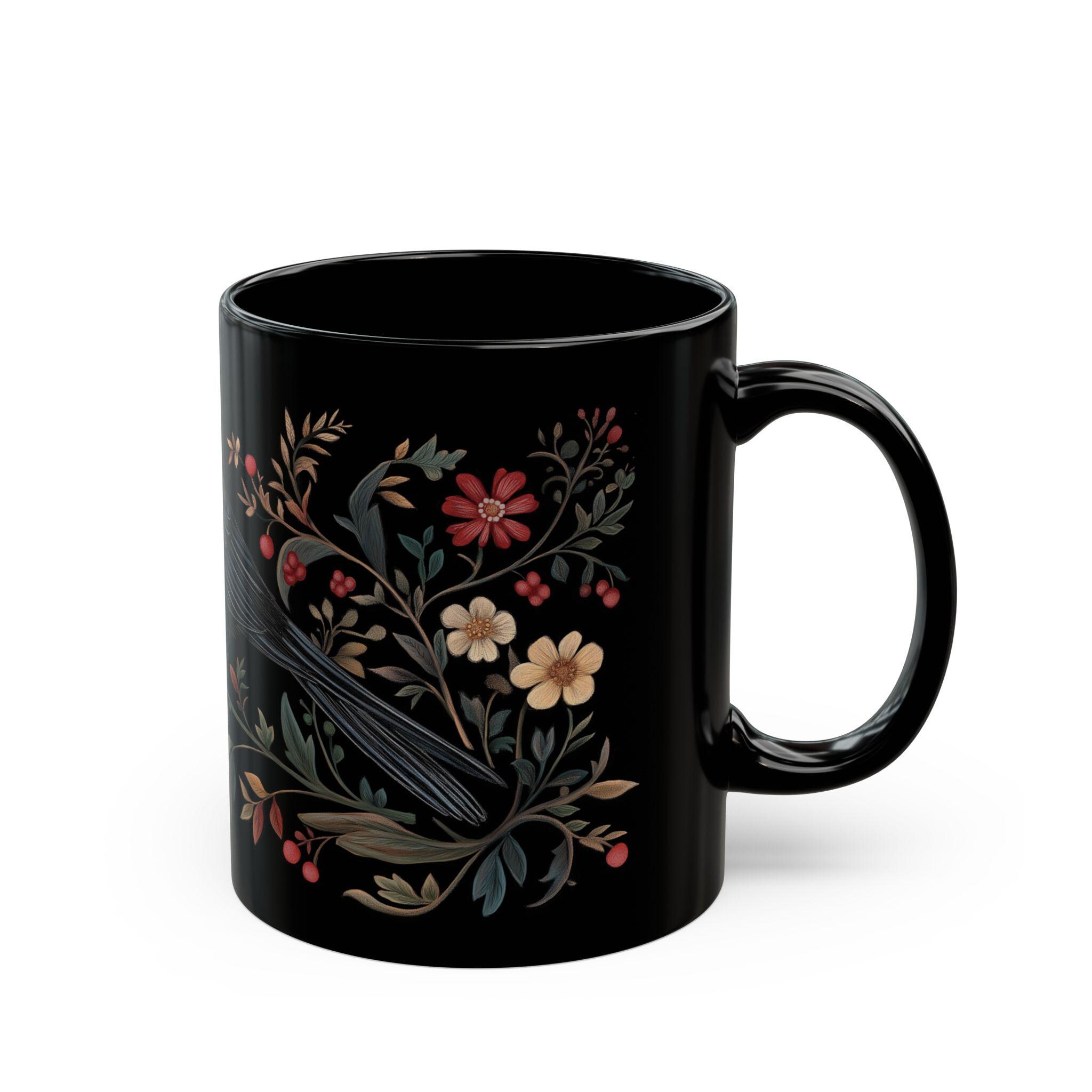 This Raven Floral Mug features intricate gothic medieval-inspired art, giving off a mysterious and dark vibe. Perfect for those who love unique, artistic designs, this mug is relevant for Halloween, goth enthusiasts, and fantasy lovers.