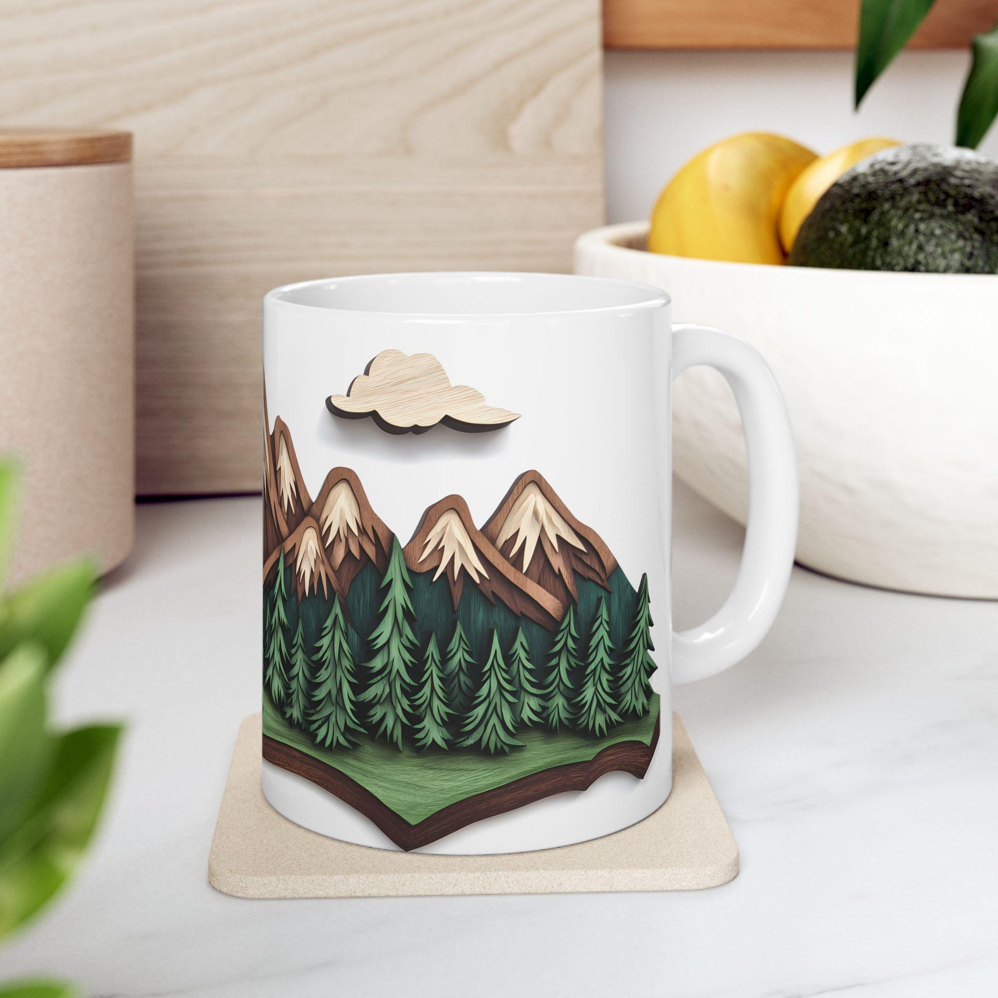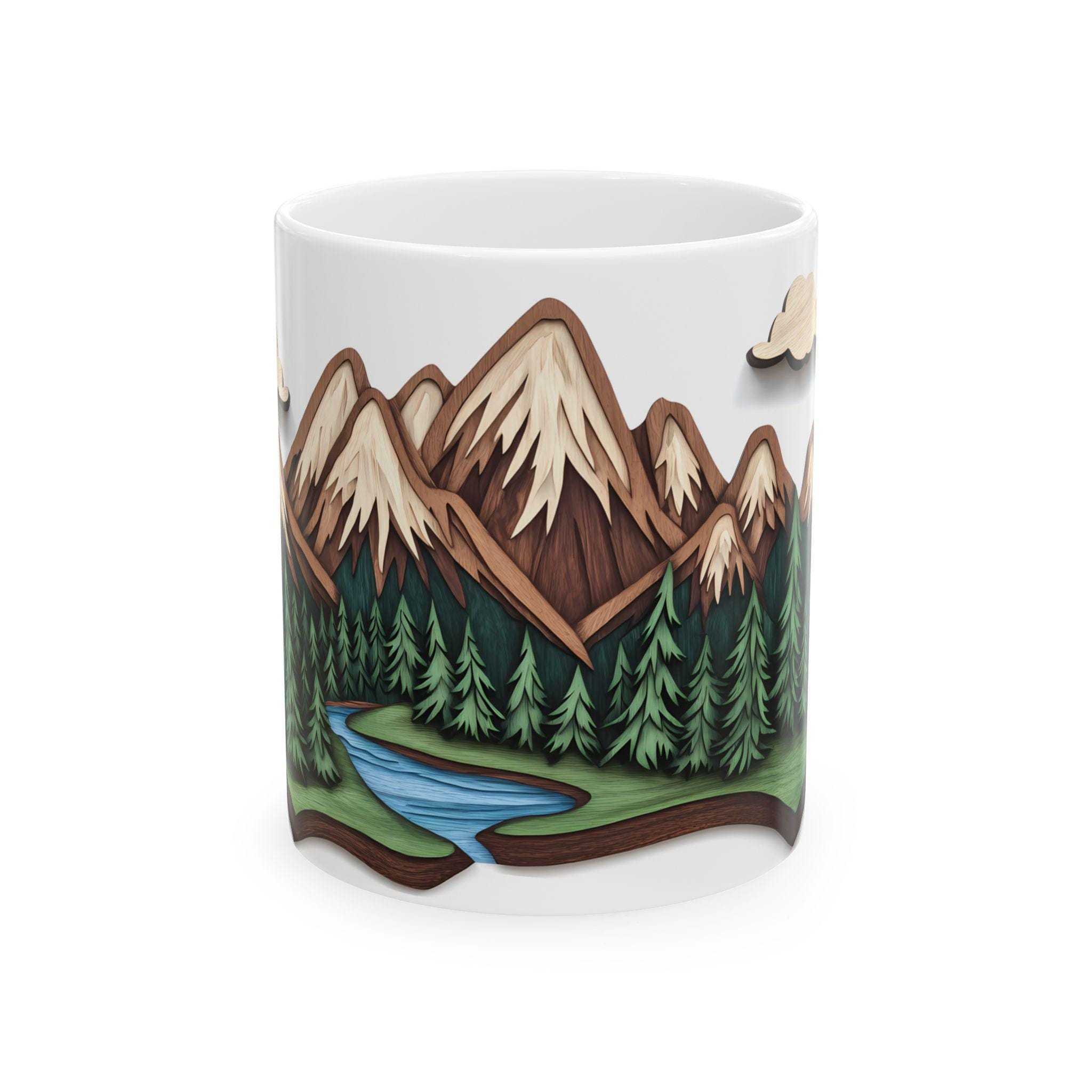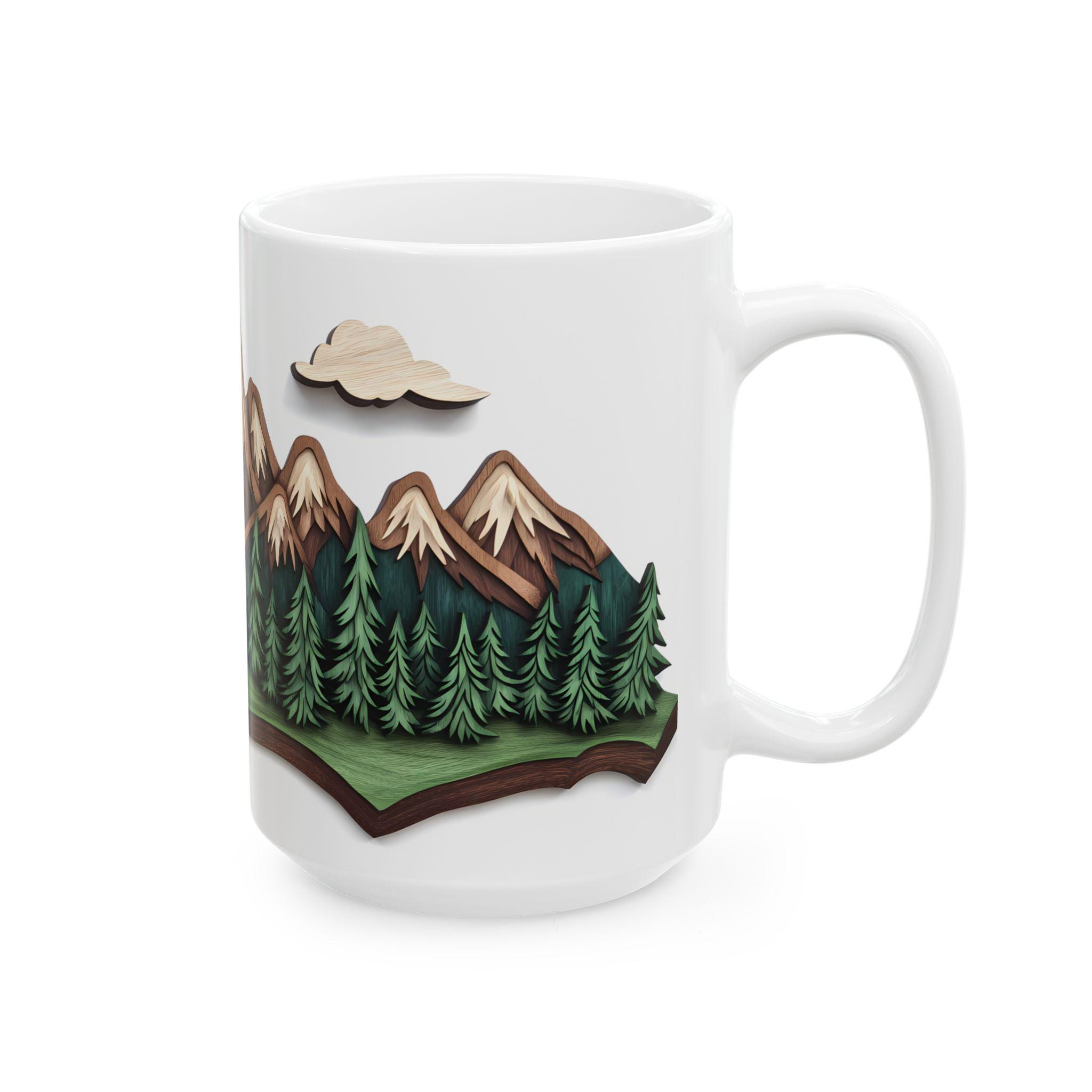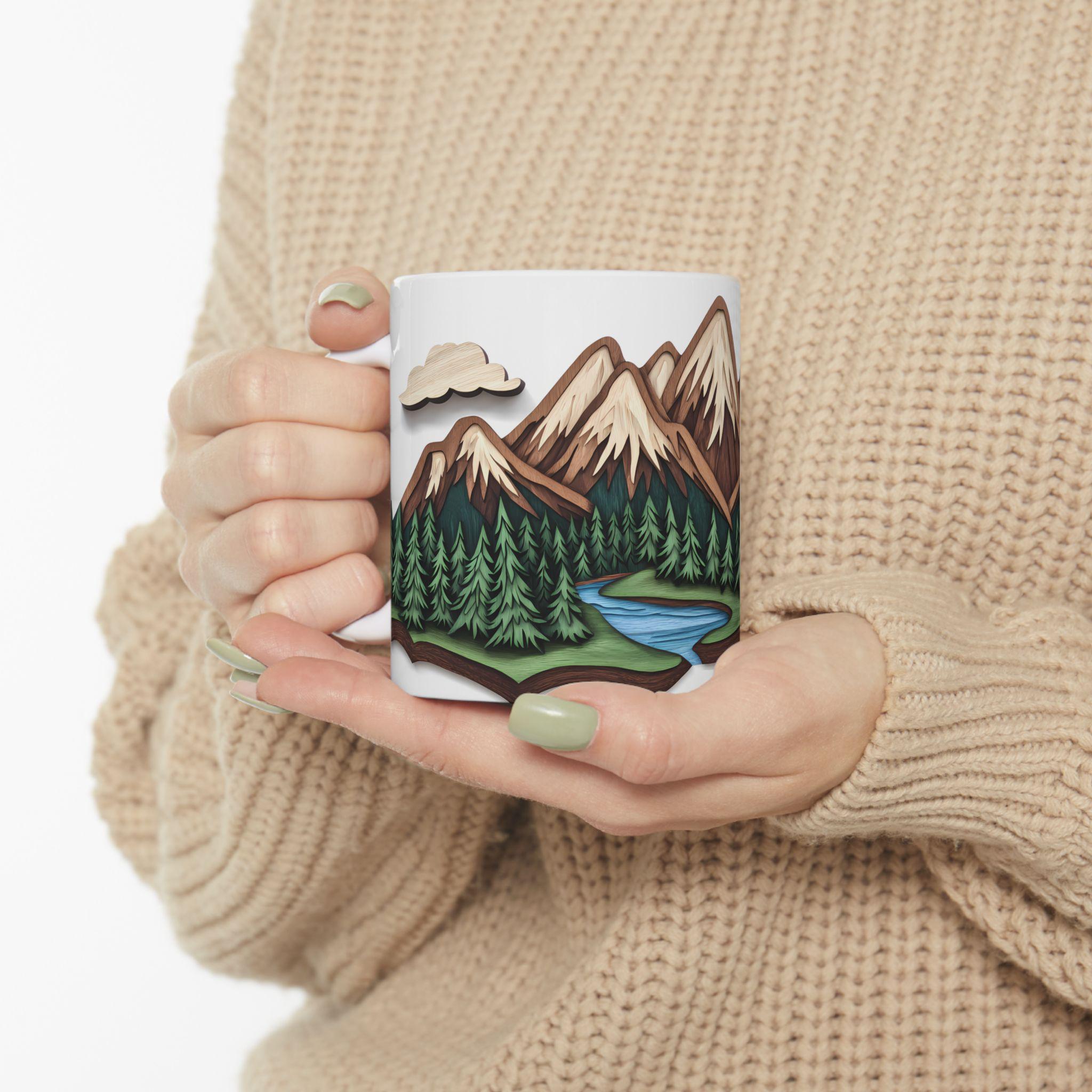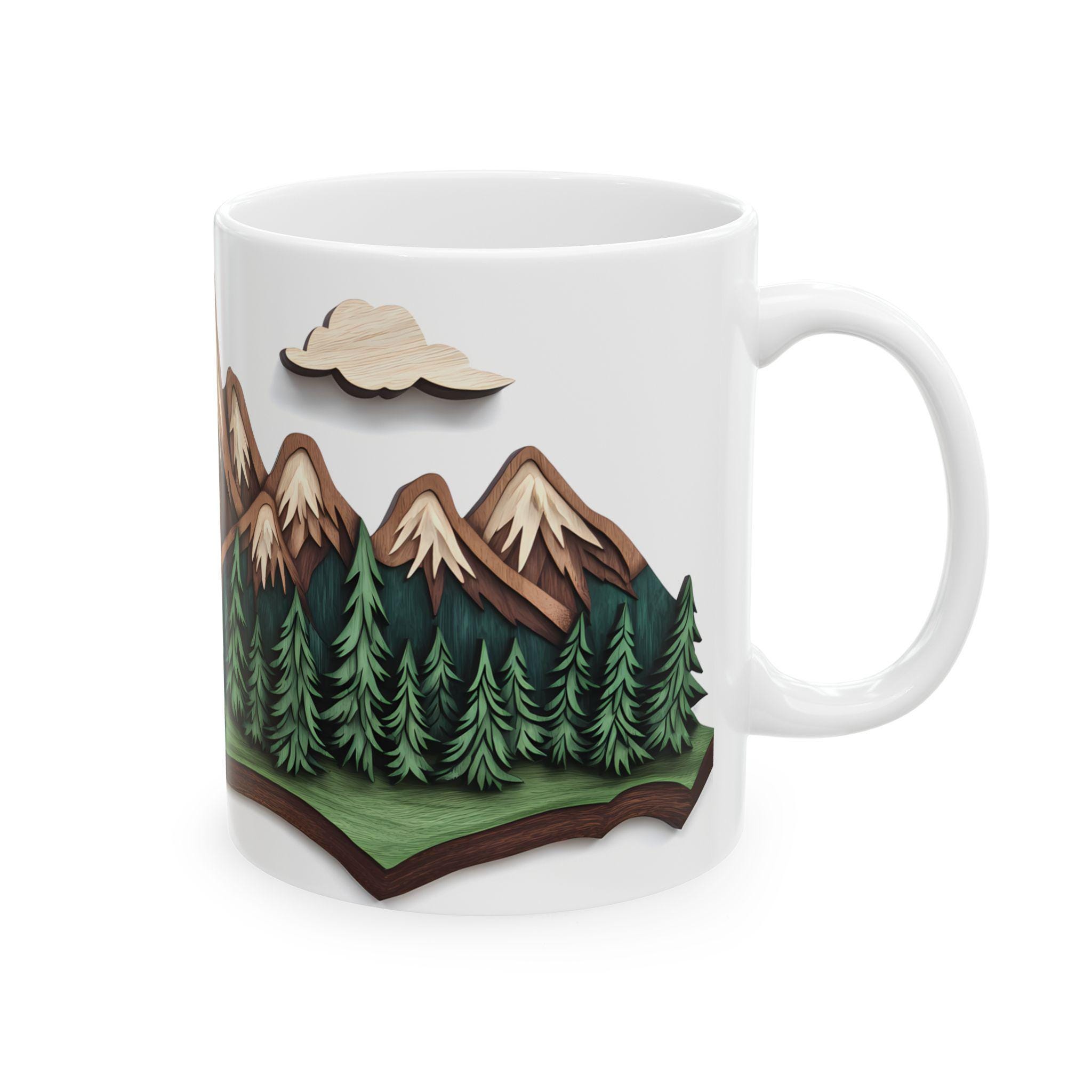 Mountain Escape Mug—Rustic Wood-Carving Inspired Design. This ceramic mug is perfect for cozy mornings sipping coffee or tea in a rustic cabin setting. The earthy design gives off a peaceful and nature-inspired vibe, making it ideal for nature lovers and outdoor enthusiasts. This mug is great for enjoying hot beverages during the winter holidays or for bringing a touch of the wilderness into your daily routine.