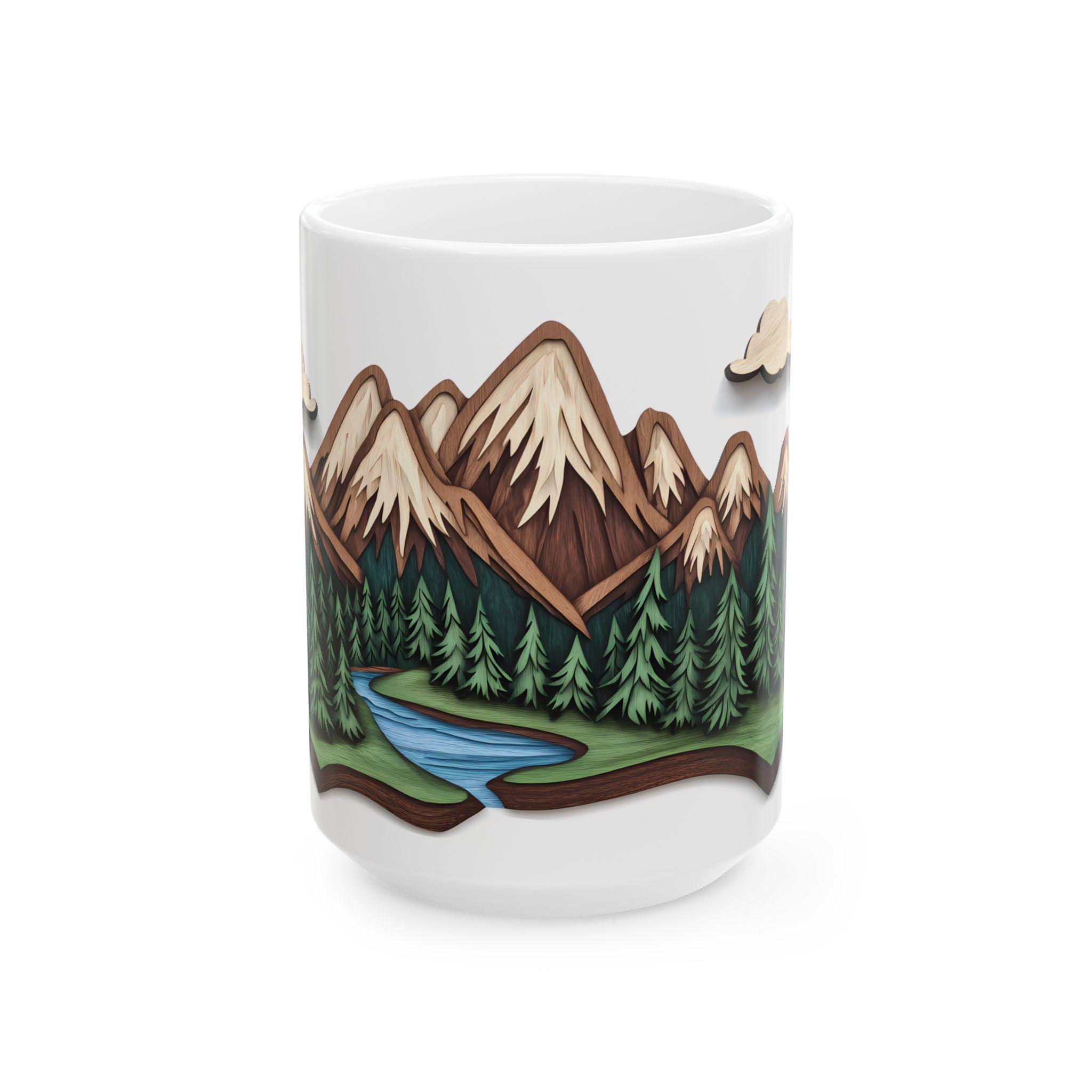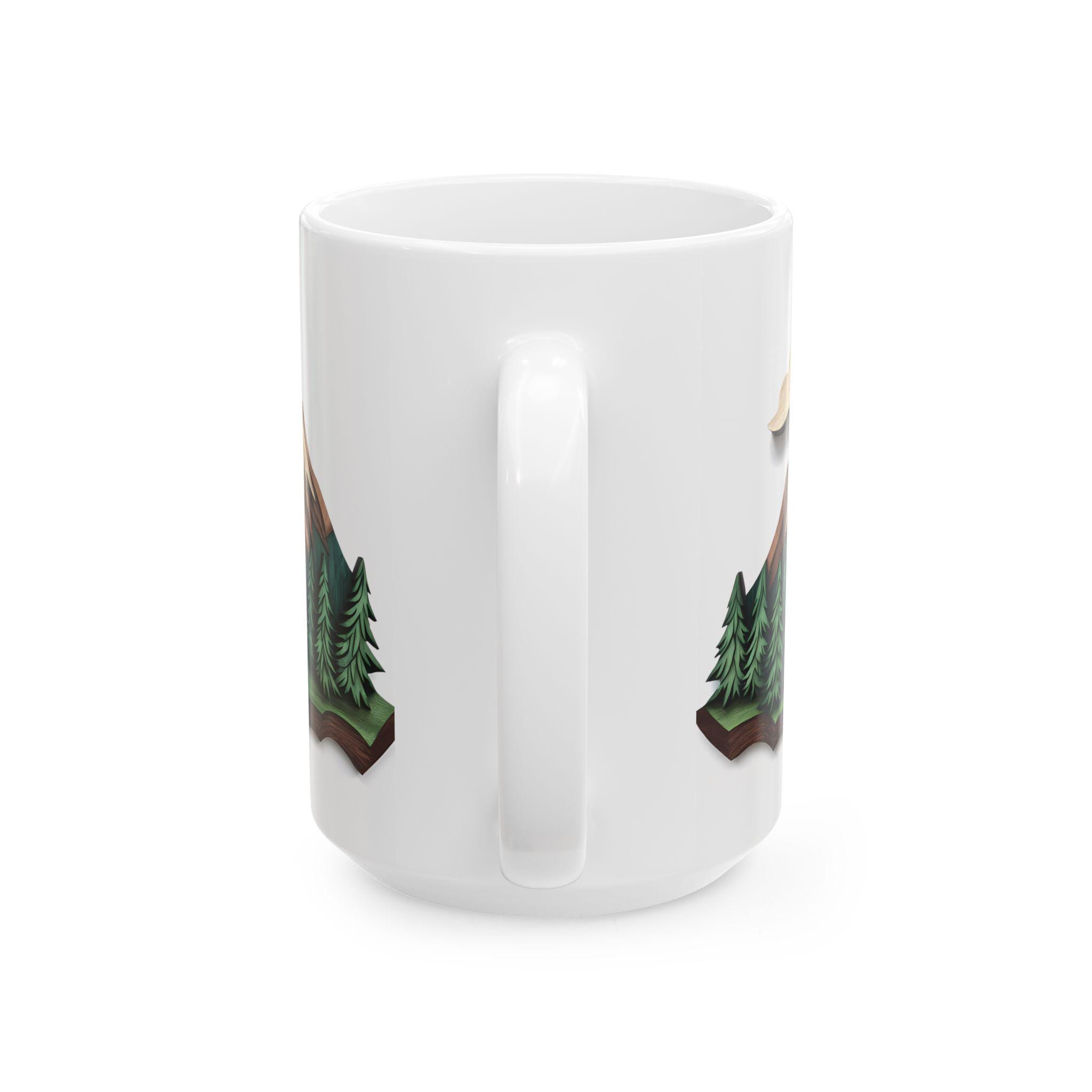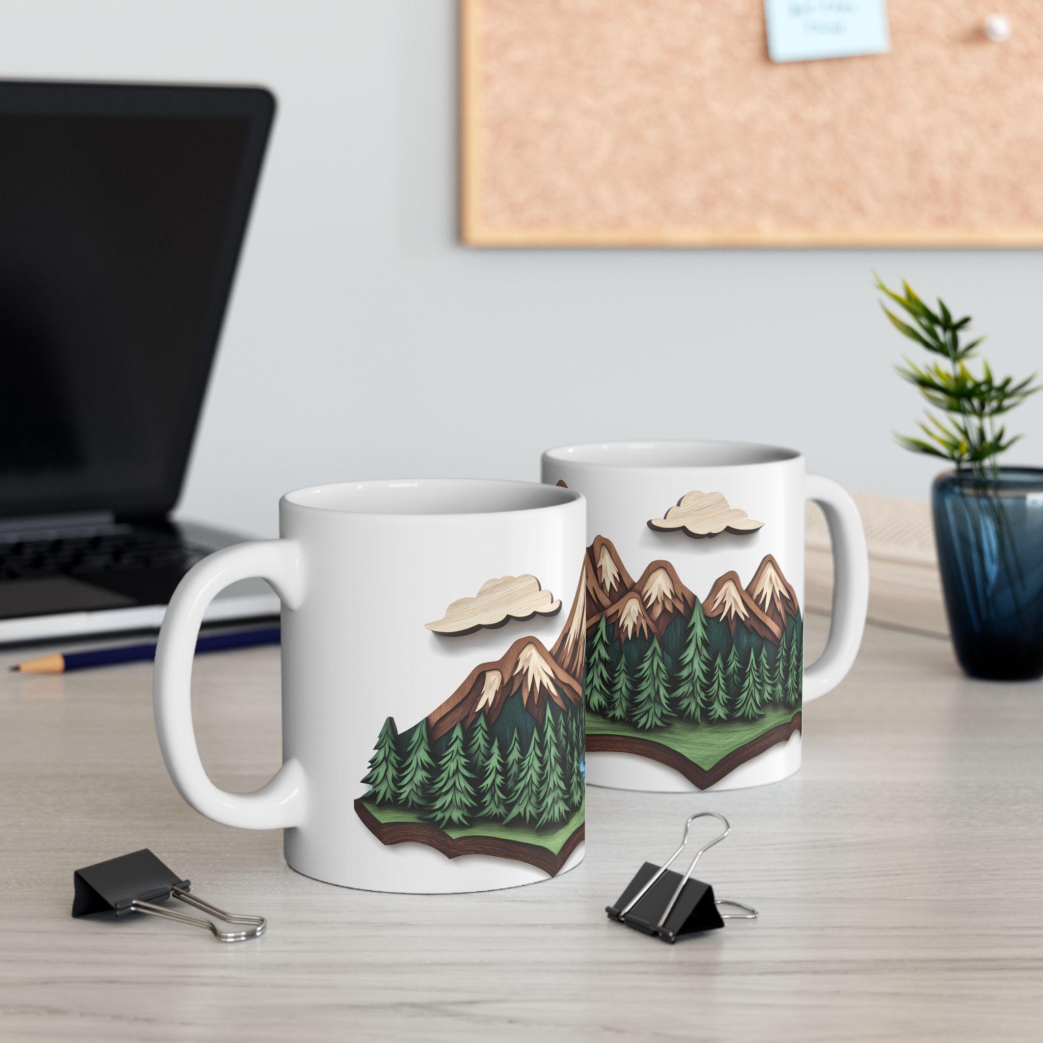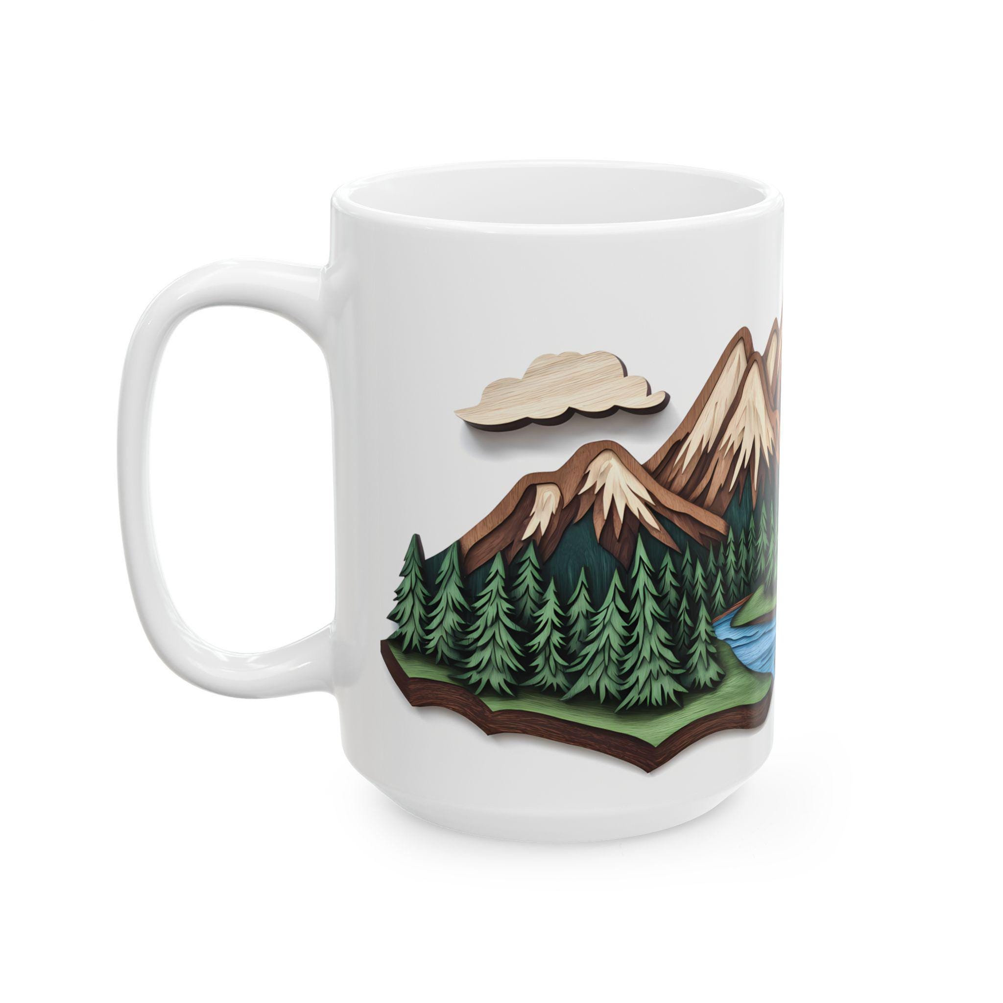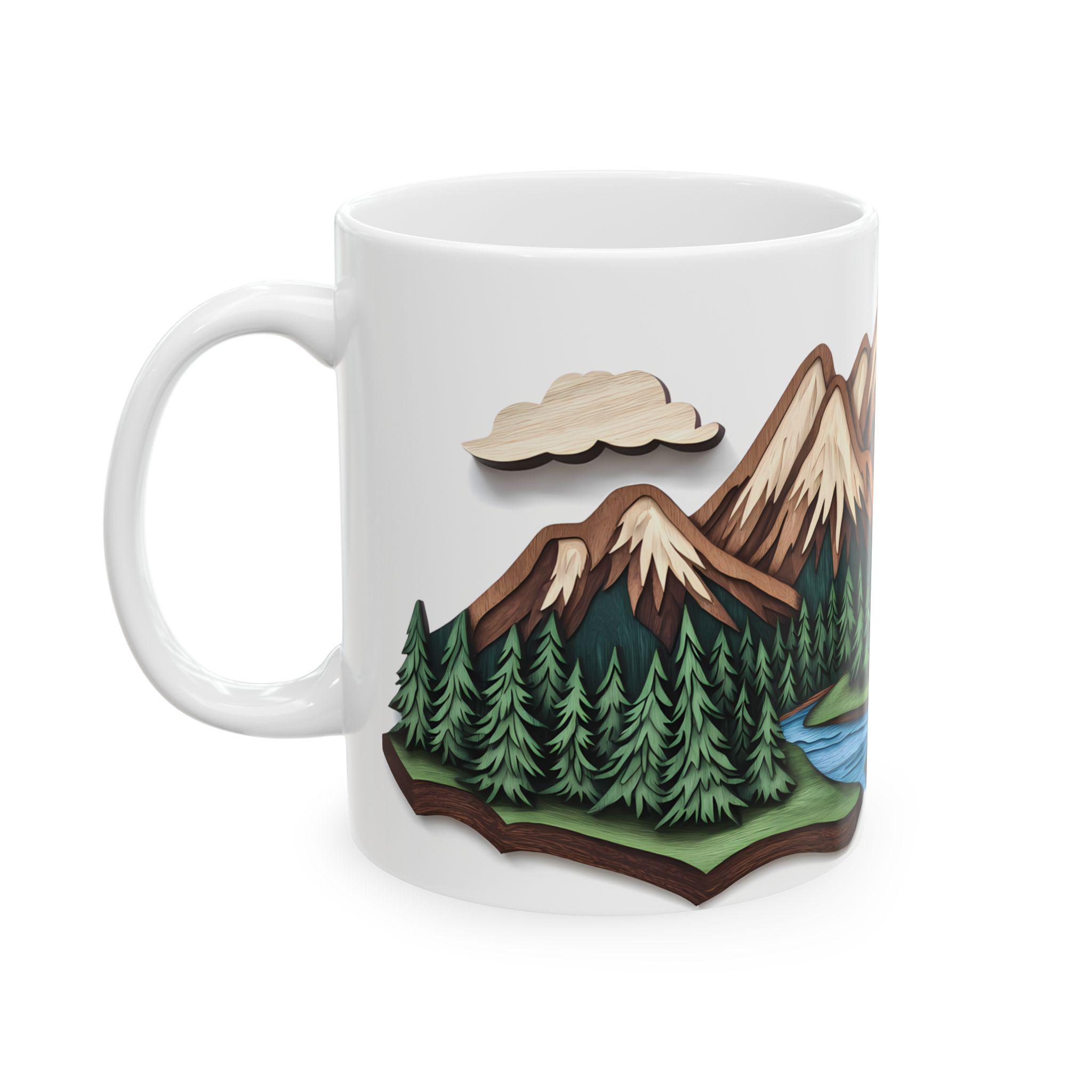 Mountain Escape Mug—Rustic Wood-Carving Inspired Design. This ceramic mug is perfect for cozy mornings sipping coffee or tea in a rustic cabin setting. The earthy design gives off a peaceful and nature-inspired vibe, making it ideal for nature lovers and outdoor enthusiasts. This mug is great for enjoying hot beverages during the winter holidays or for bringing a touch of the wilderness into your daily routine.