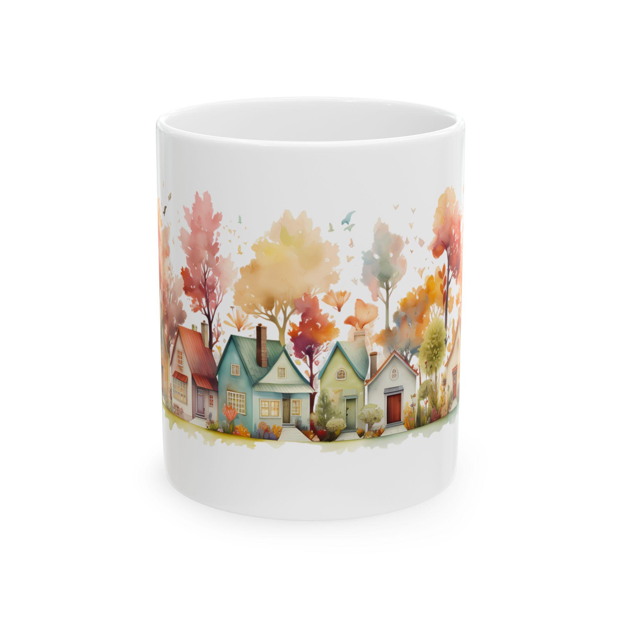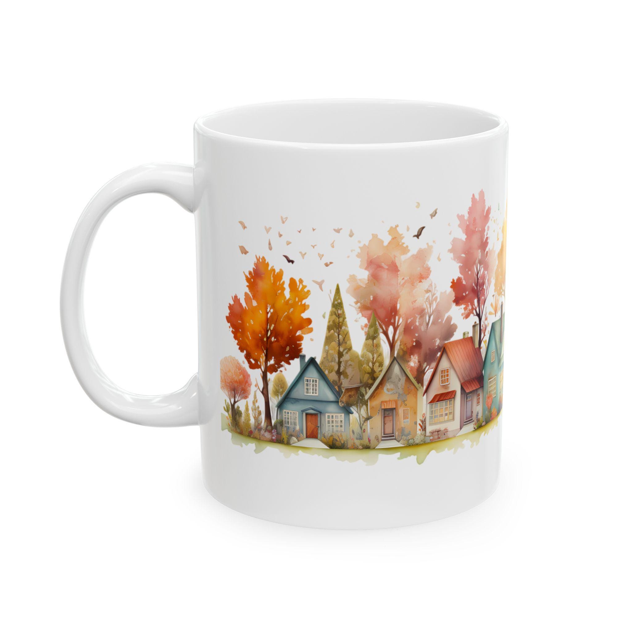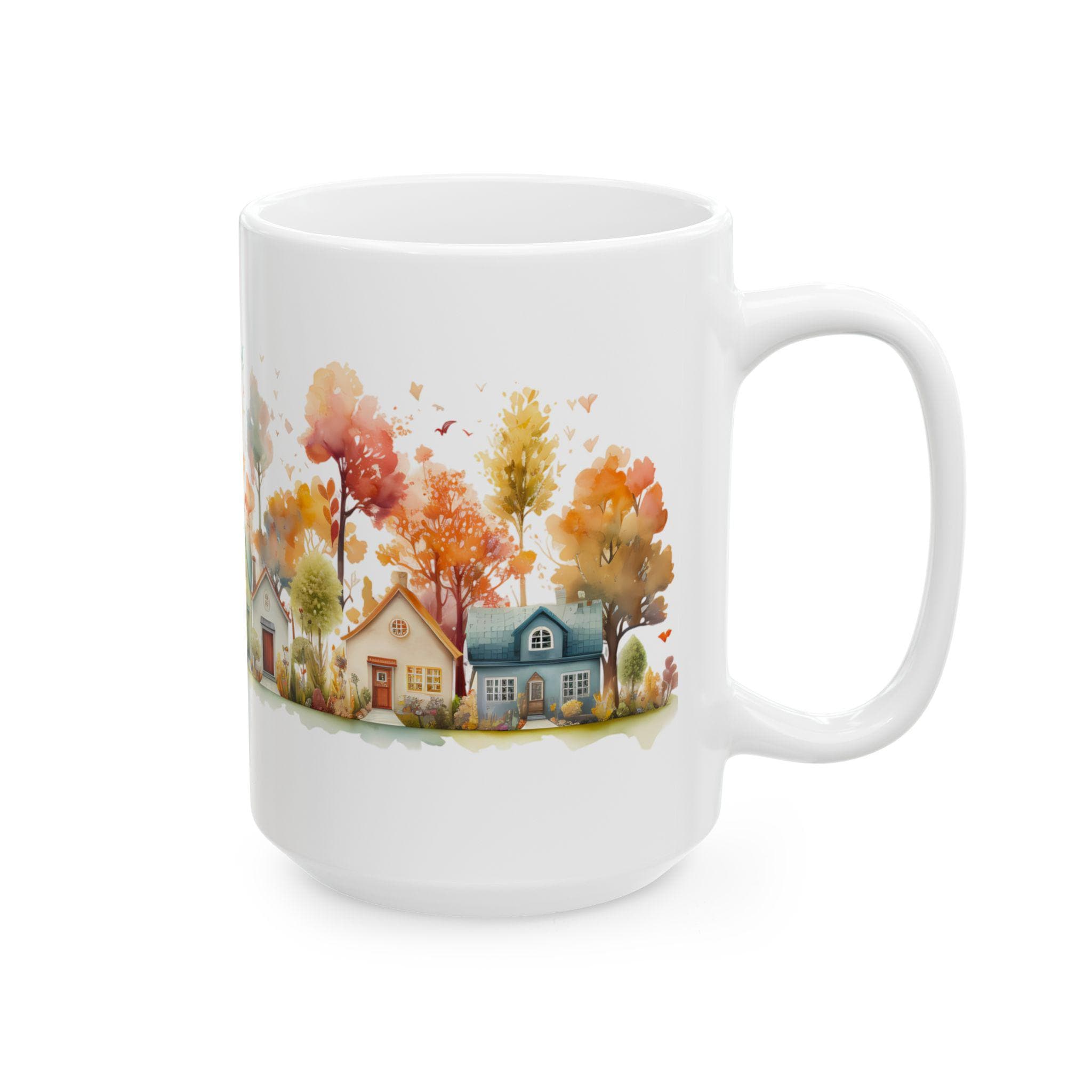 Whimsical Cottagecore Mug – Cozy Autumn Village Design. This ceramic mug is perfect for those who appreciate a bohemian cottage vibe and enjoy sipping their favorite beverages in style. It adds a rustic touch to your morning coffee routine and makes for a cozy addition to any kitchen. It is ideal for coffee lovers looking to elevate their drinkware collection or as a thoughtful gift for friends and family. Perfect for celebrating holidays, special occasions, or just brightening up your daily coffee break.