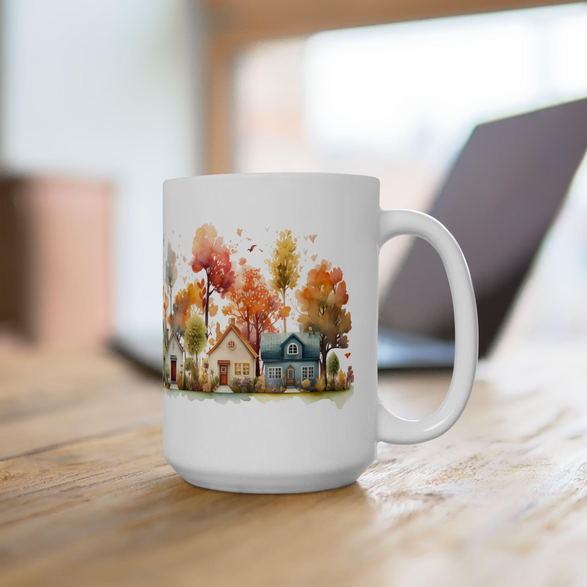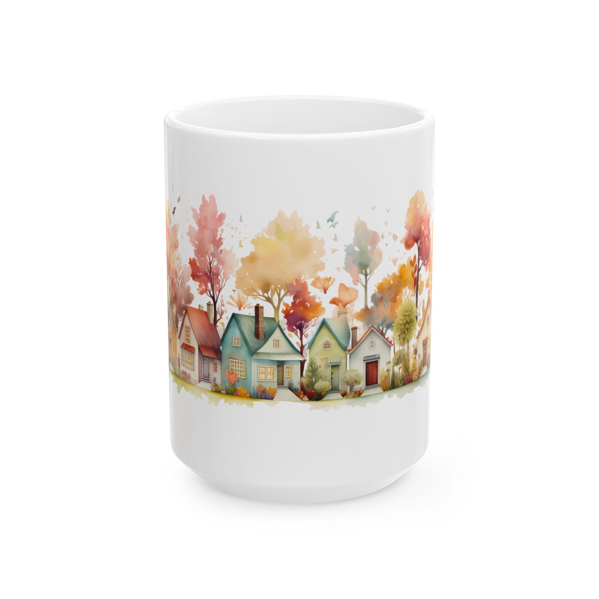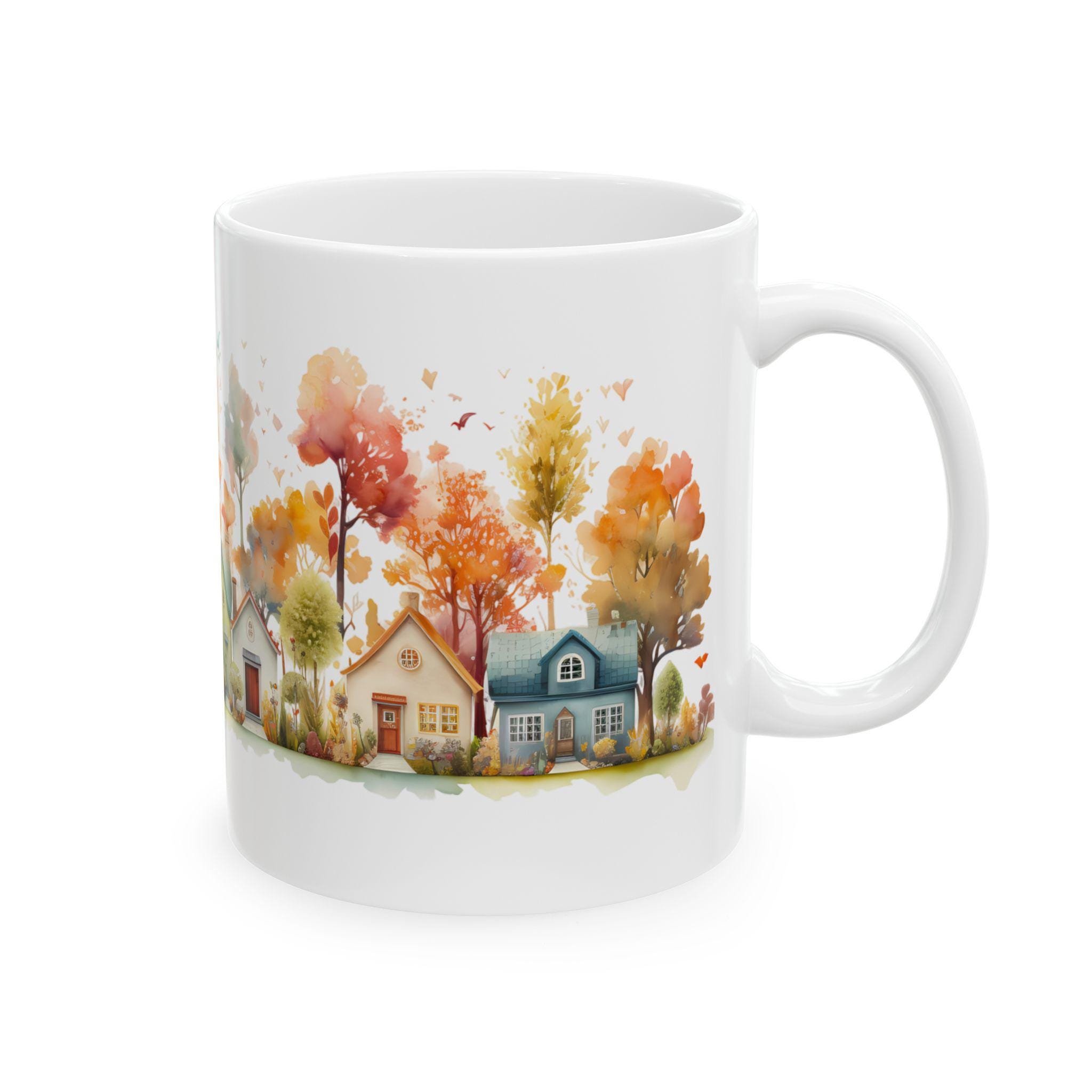 Whimsical Cottagecore Mug – Cozy Autumn Village Design. This ceramic mug is perfect for those who appreciate a bohemian cottage vibe and enjoy sipping their favorite beverages in style. It adds a rustic touch to your morning coffee routine and makes for a cozy addition to any kitchen. It is ideal for coffee lovers looking to elevate their drinkware collection or as a thoughtful gift for friends and family. Perfect for celebrating holidays, special occasions, or just brightening up your daily coffee break.