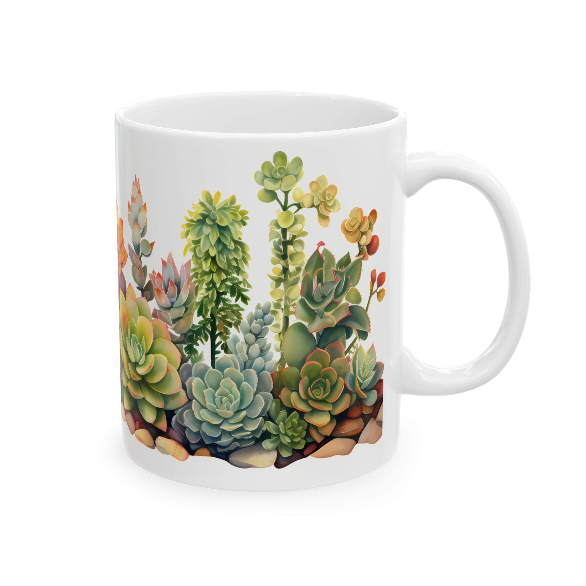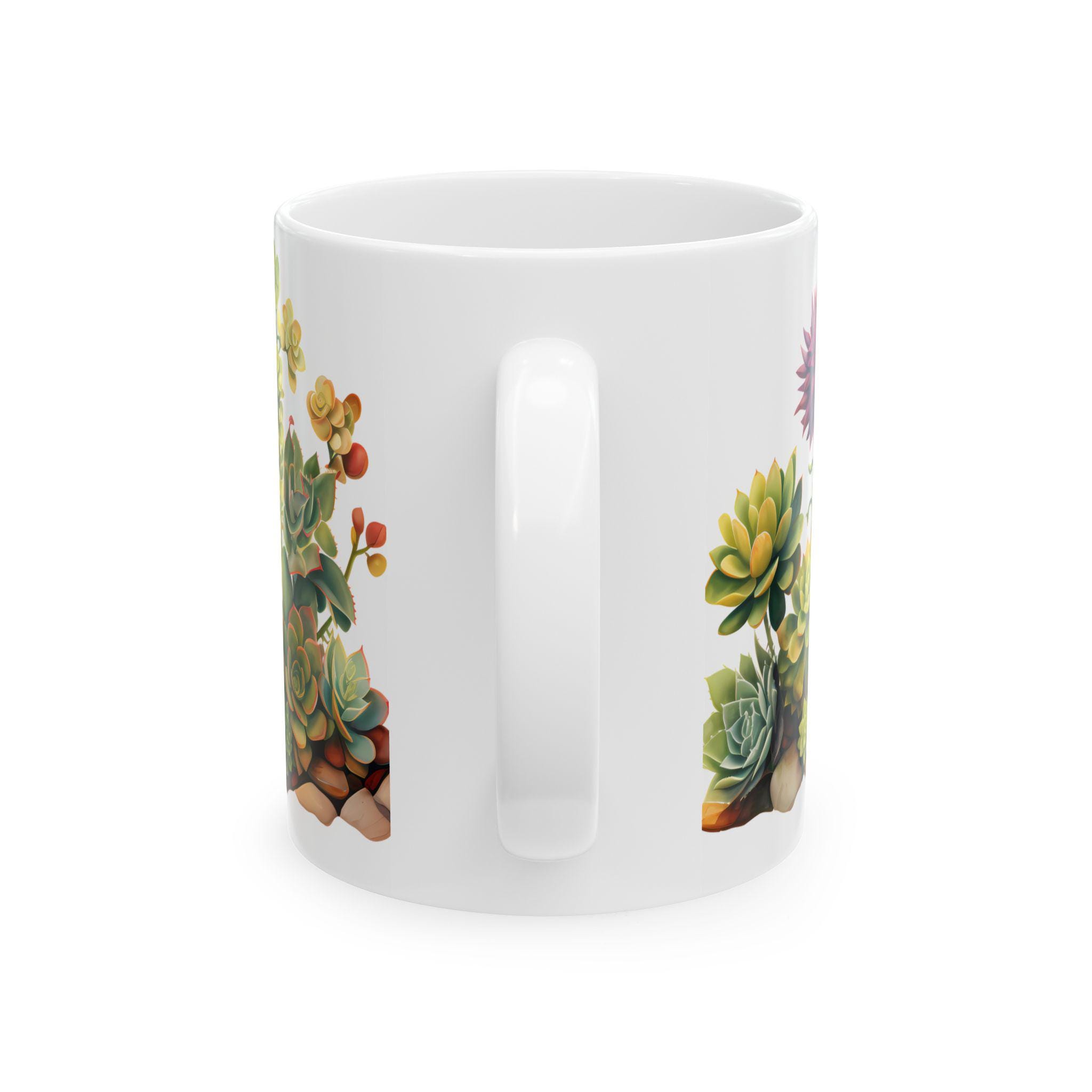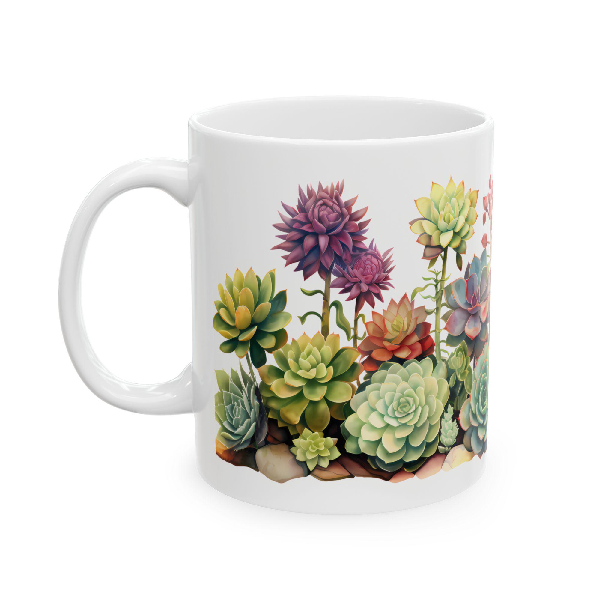 Succulent Bloom Mug—Vibrant Succulent Art for Your Coffee Break. This ceramic mug offers a serene and peaceful vibe perfect for plant enthusiasts. It can be a great addition to your morning routine or a relaxing cup of tea in the evening. Ideal for those who love succulents and botanical decorations.