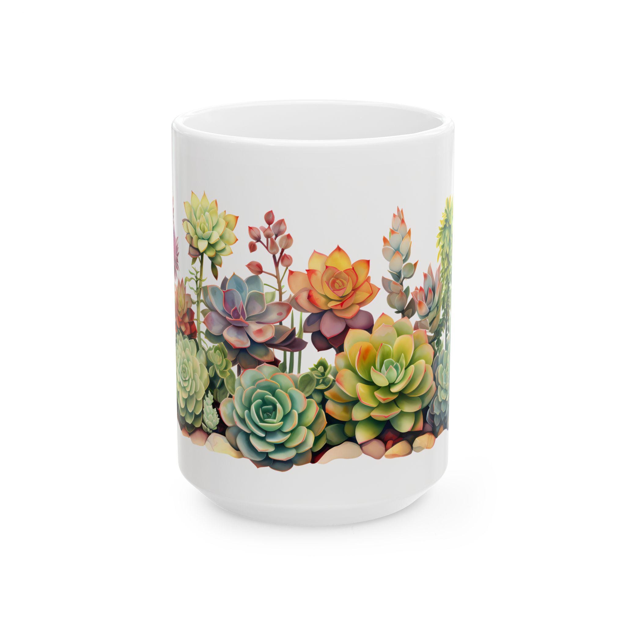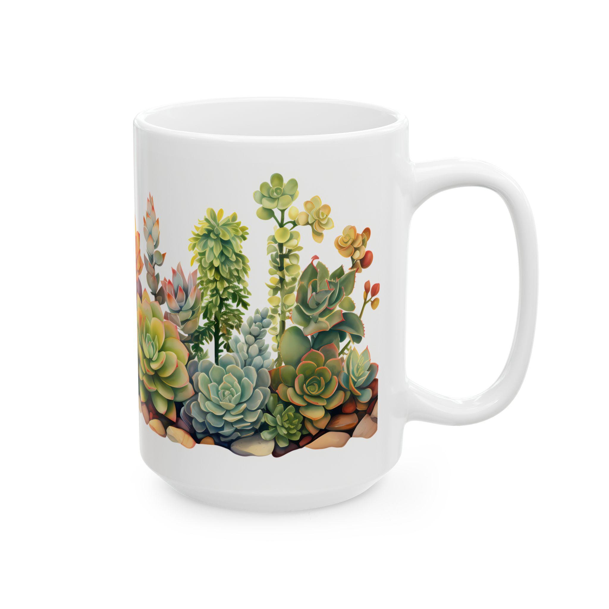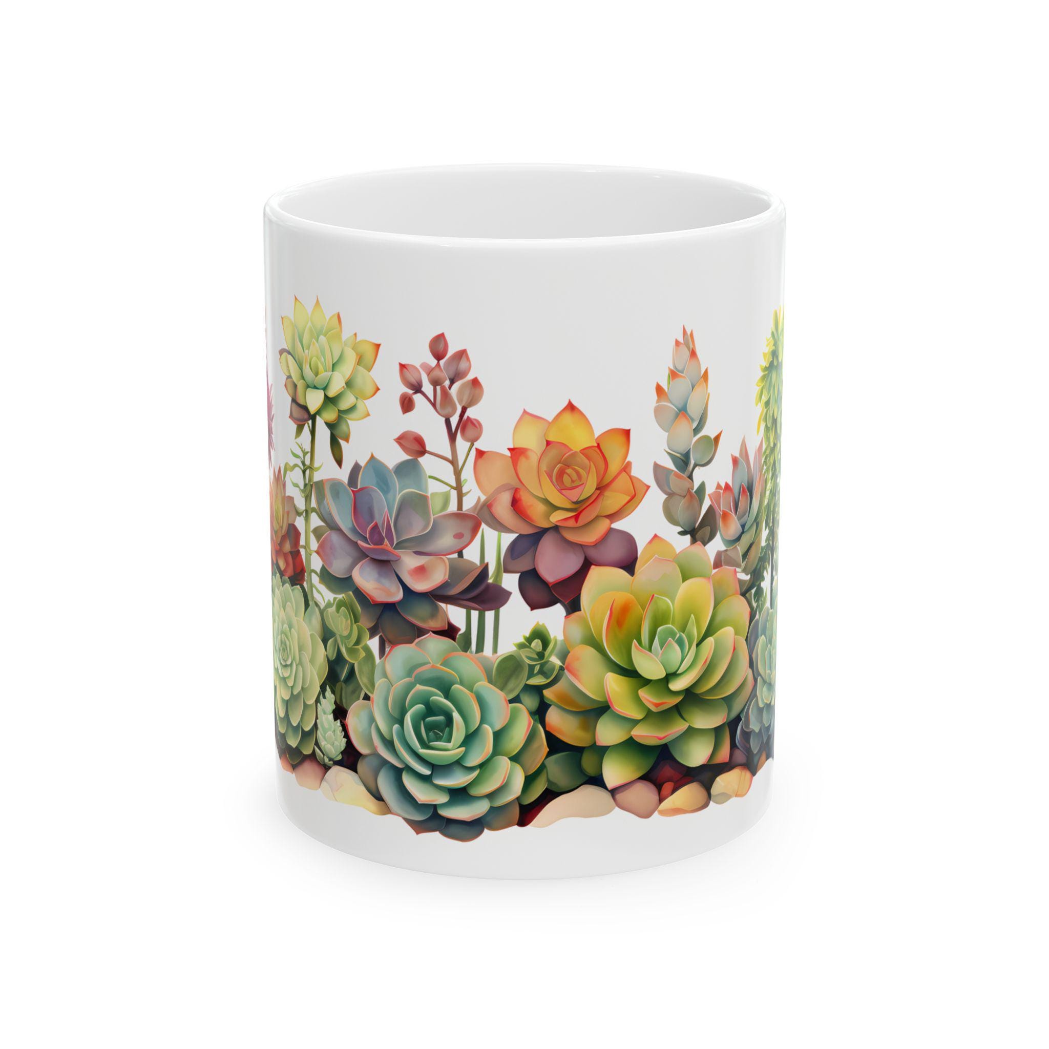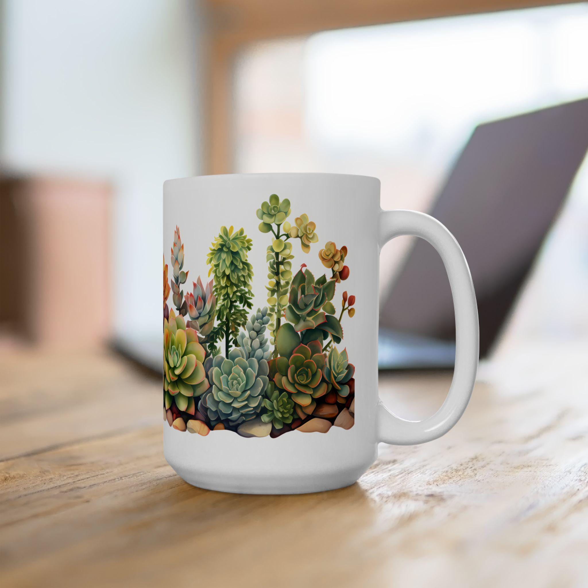 Succulent Bloom Mug—Vibrant Succulent Art for Your Coffee Break. This ceramic mug offers a serene and peaceful vibe perfect for plant enthusiasts. It can be a great addition to your morning routine or a relaxing cup of tea in the evening. Ideal for those who love succulents and botanical decorations.